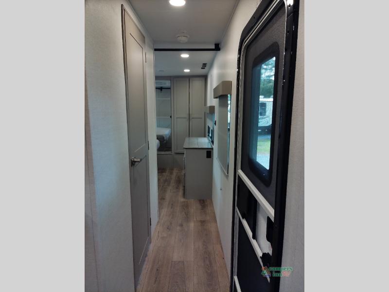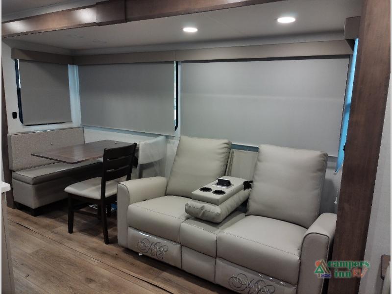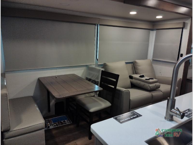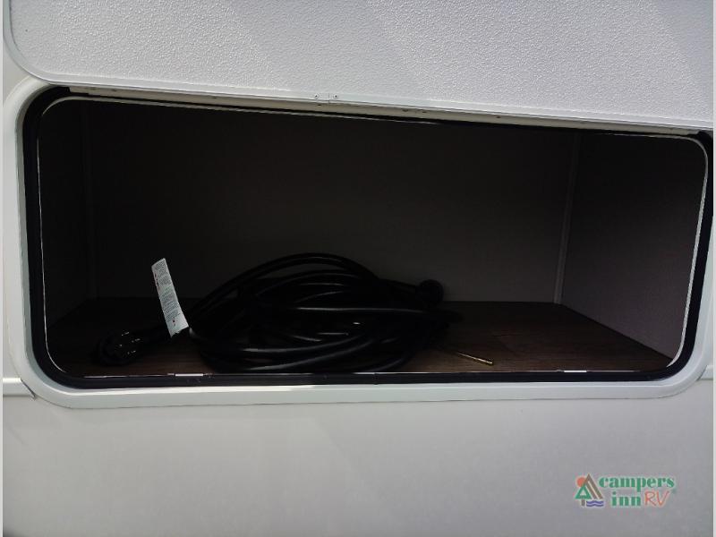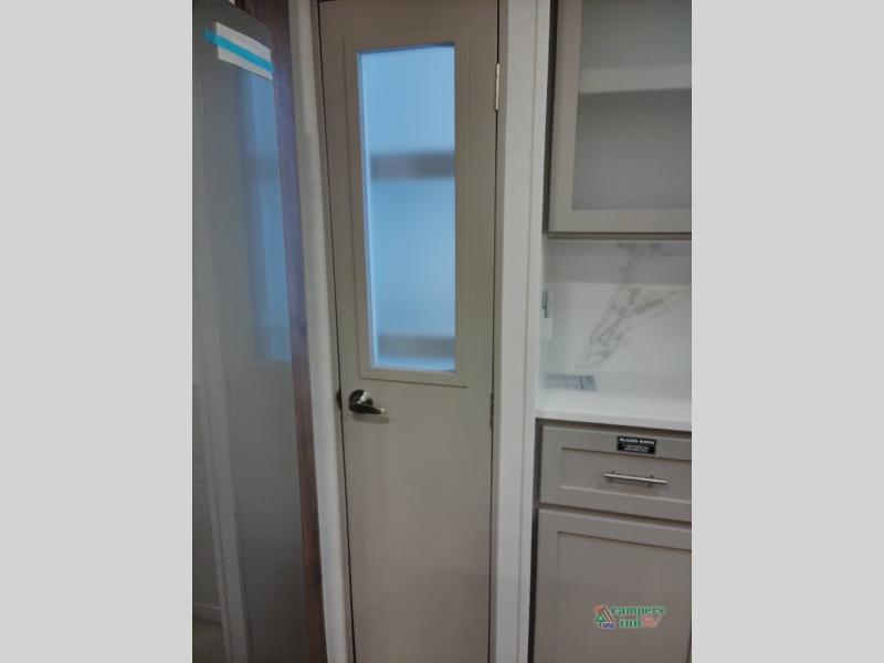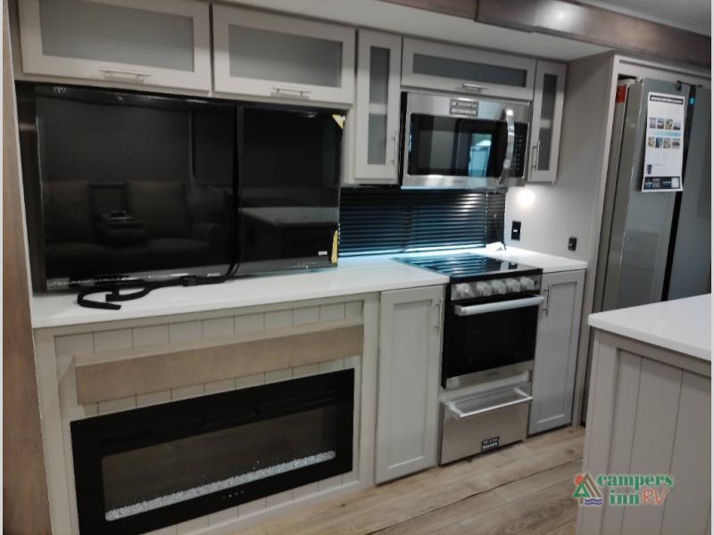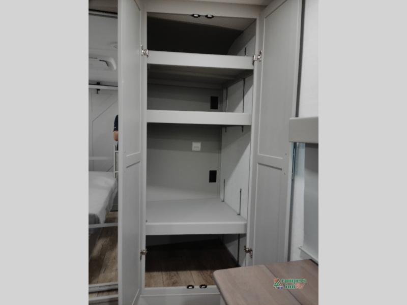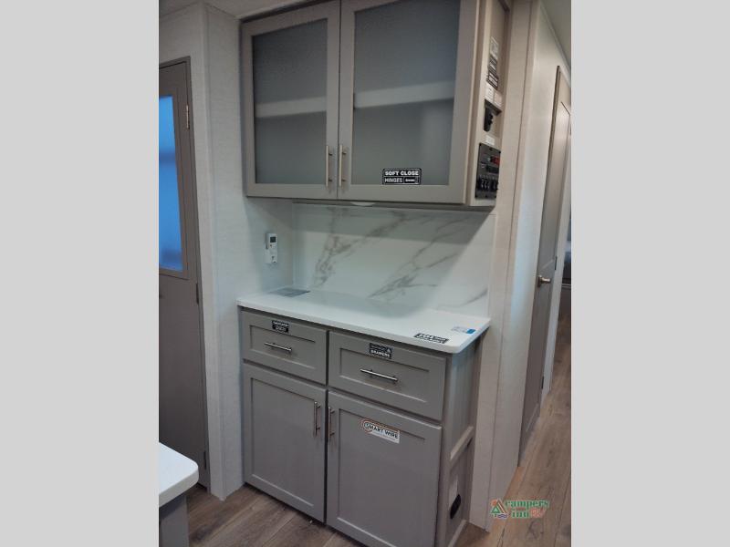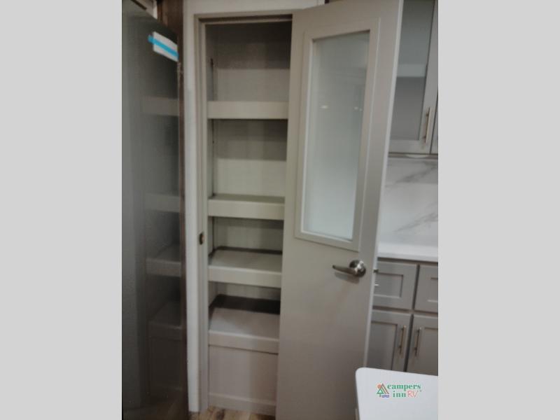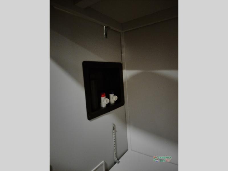 A kitchen island with countertop space makes it easy to prepare meals in this travel trailer! The floating dinette table has two chairs on one side and a movable ottoman with flip up storage on the other side to keep your games or extra table cloths in. You can store your dishes and snacks inside the hutch/pantry or in the second pantry. The front private bedroom has a queen bed slide but can be switched out for the optional king bed if you like. There is also a dresser and large wardrobe with shelving plus washer and dryer prep if you choose to add those appliances. The rear living area features a dual recliner theater seat across from an entertainment center with a 50" class HDTV with hidden storage behind it, and is also on a swing mount for all to see even at the rear sleeper sofa!