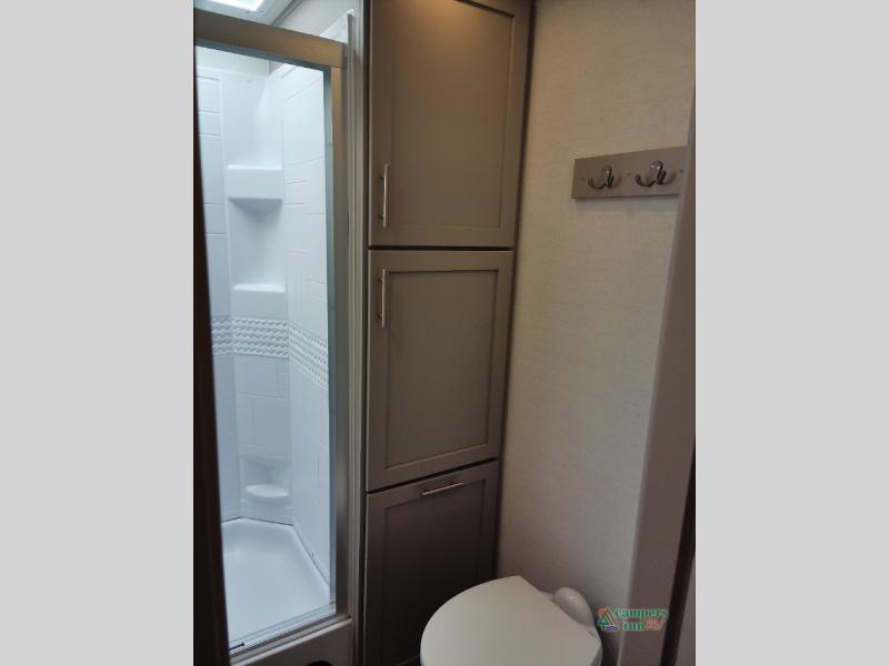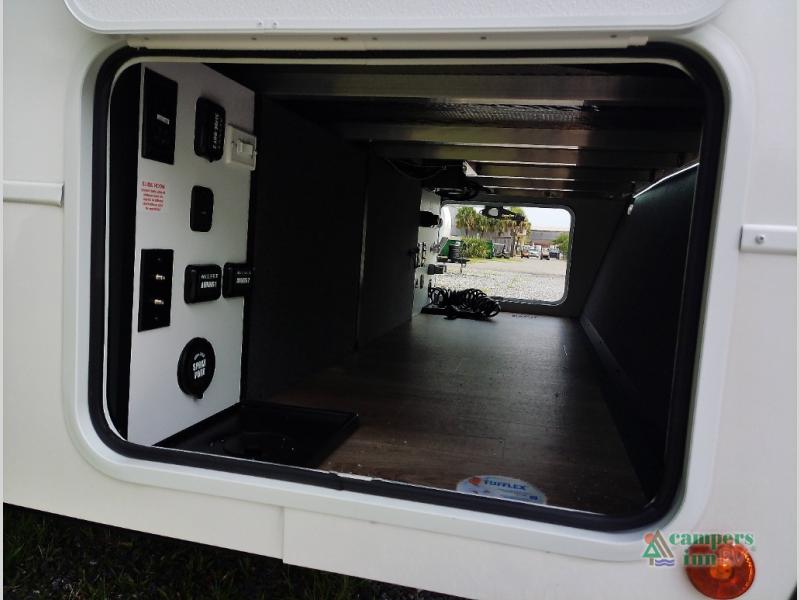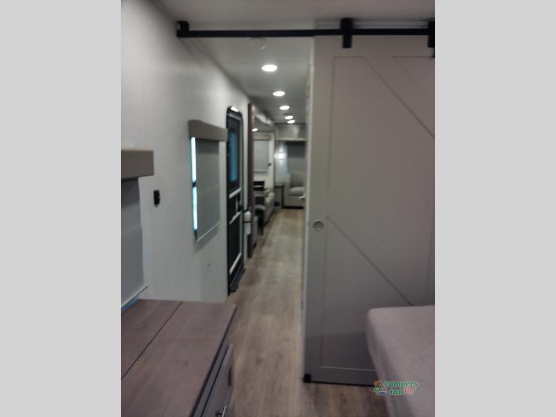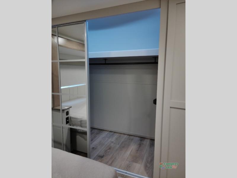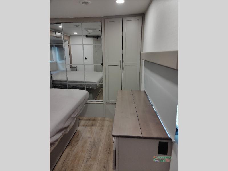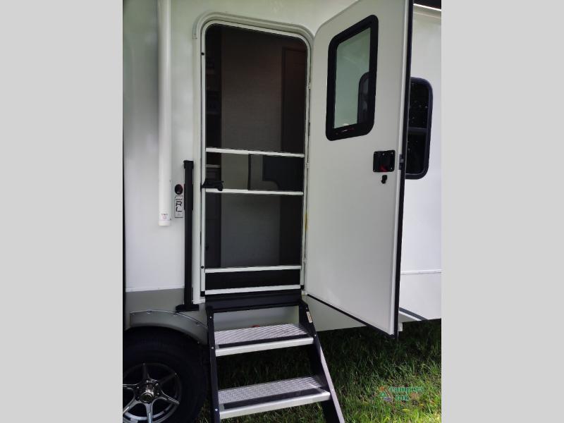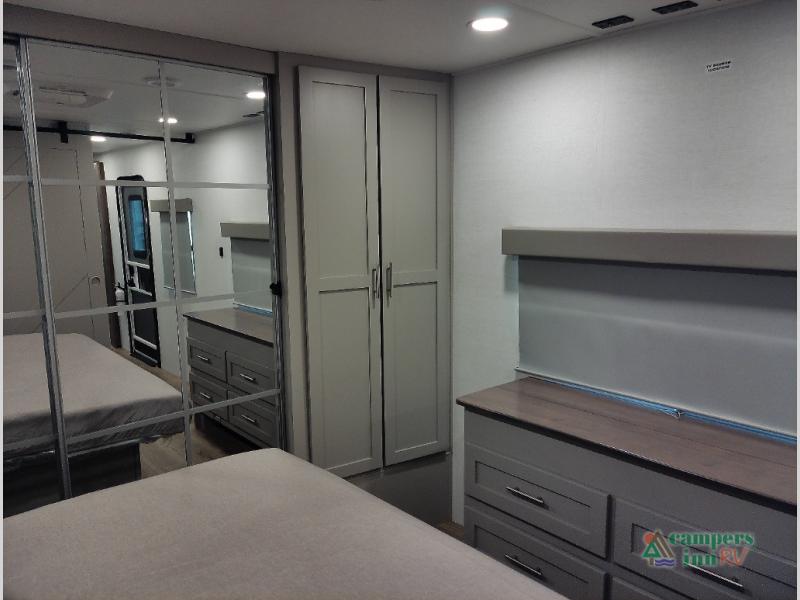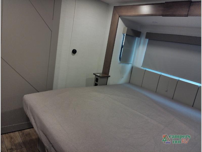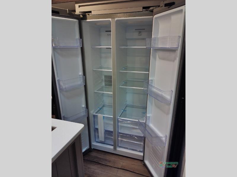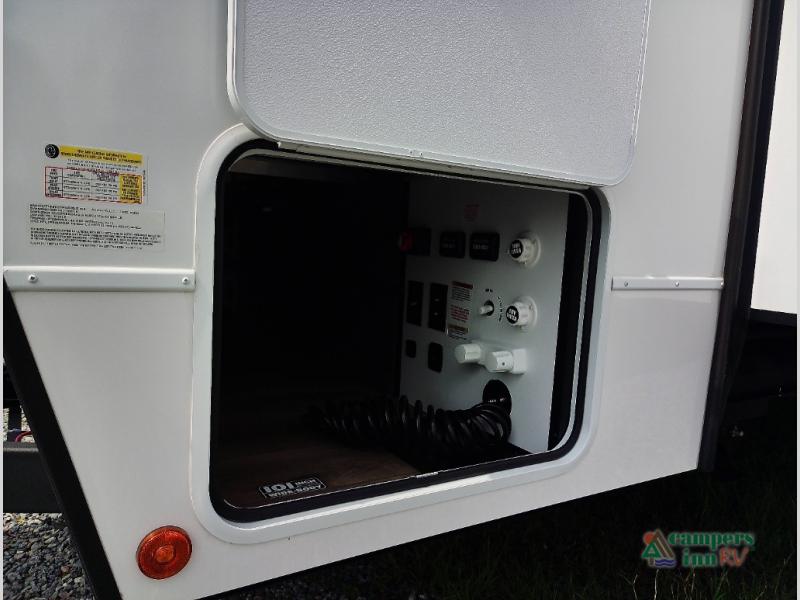 A kitchen island with countertop space makes it easy to prepare meals in this travel trailer! The floating dinette table has two chairs on one side and a movable ottoman with flip up storage on the other side to keep your games or extra table cloths in. You can store your dishes and snacks inside the hutch/pantry or in the second pantry. The front private bedroom has a queen bed slide but can be switched out for the optional king bed if you like. There is also a dresser and large wardrobe with shelving plus washer and dryer prep if you choose to add those appliances. The rear living area features a dual recliner theater seat across from an entertainment center with a 50" class HDTV with hidden storage behind it, and is also on a swing mount for all to see even at the rear sleeper sofa!