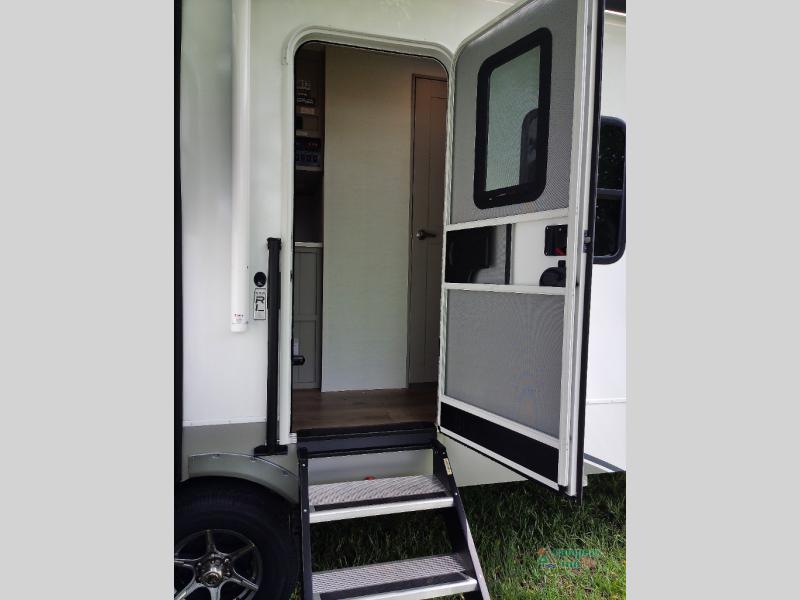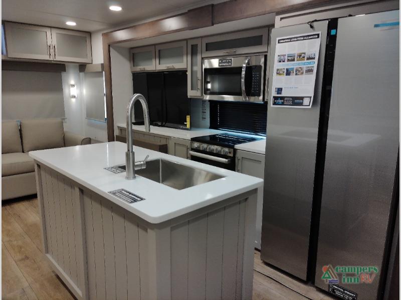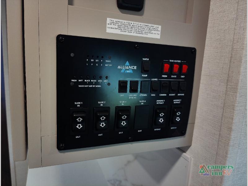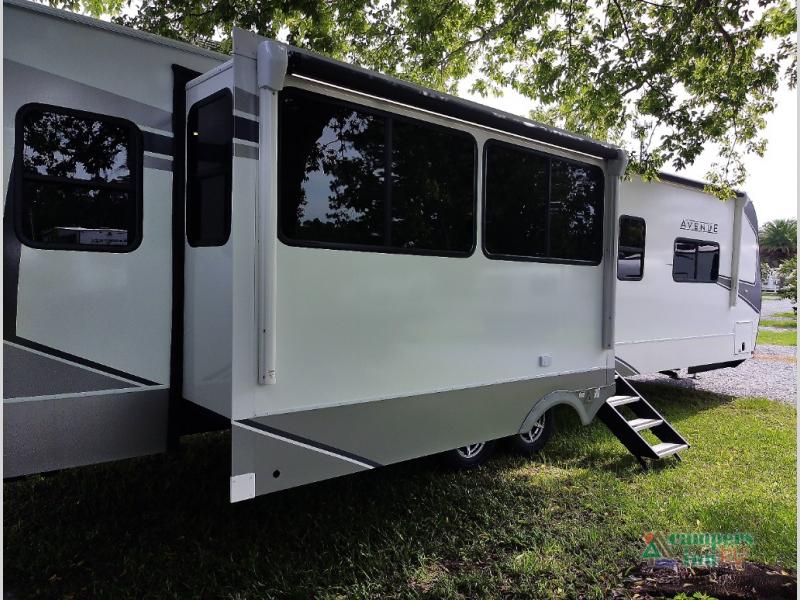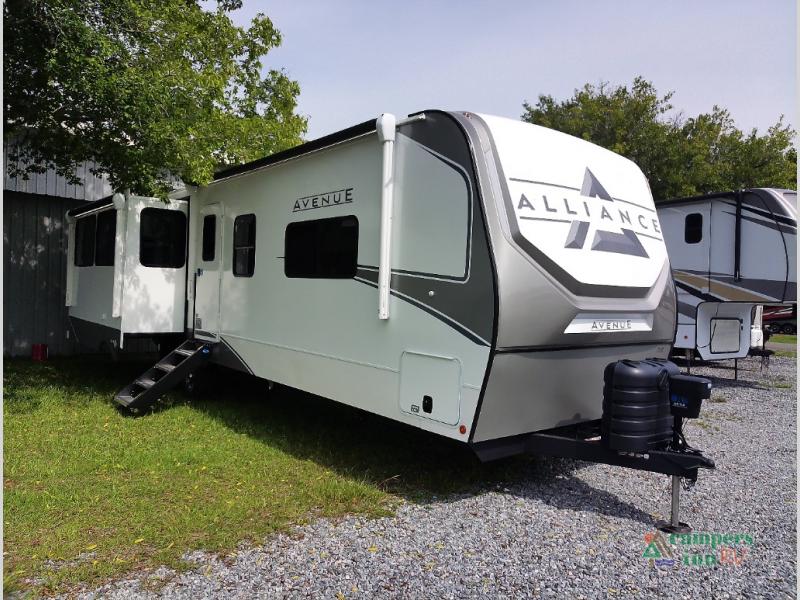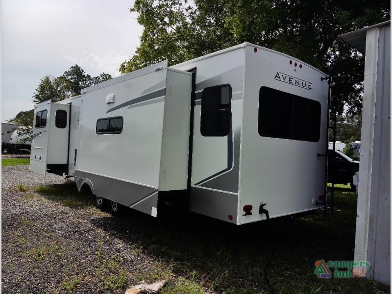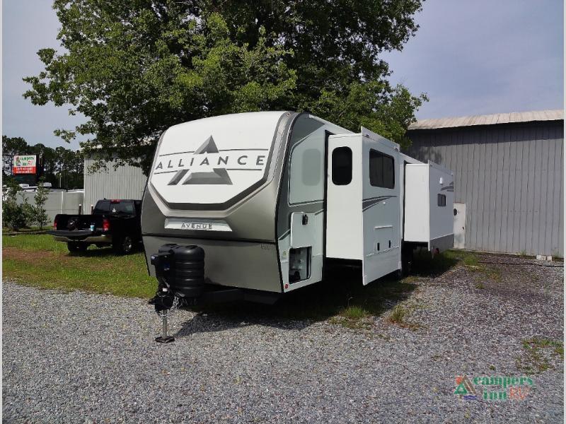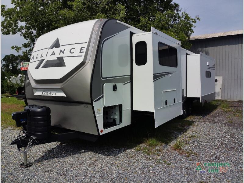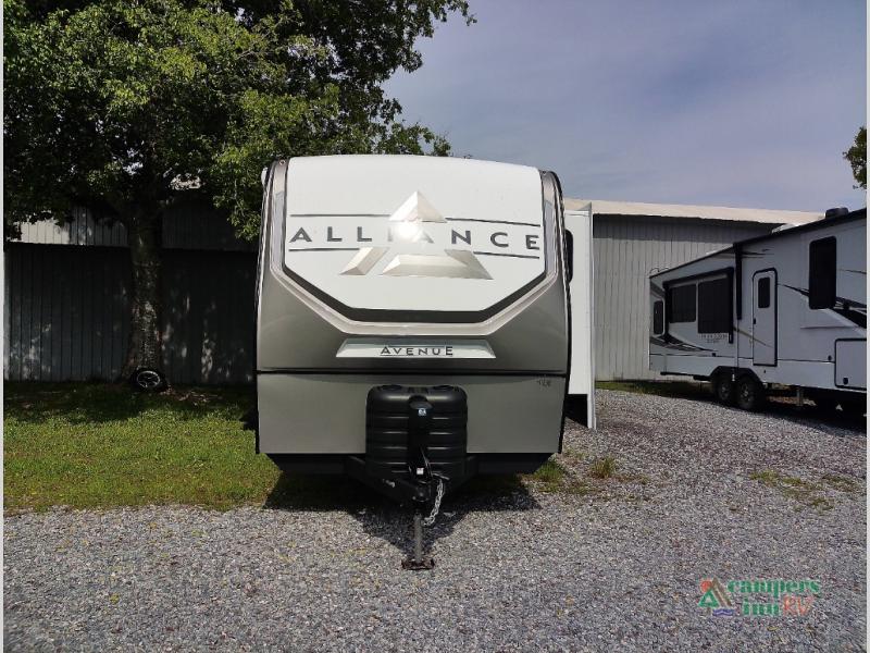 With any Avenue fifth wheel or travel trailer by Alliance RV, you will enjoy more interior space provided by the 8' 5" wide-body construction, and a long list of luxury features. Each is built with Azdel composite sidewalls both inside and out, along with a PVC roof for added strength. There are innovative storage solutions that include hidden storage behind the TV, within end tables and ottomans, and more. Since these units feature no carpet throughout, cleaning will be easier than ever, and there are flush floor slides throughout for seamless living spaces. The Avenue also comes with the OTG Solar Package with a 400 watt solar panel, inverter prep, multiple outlets, and more to keep you charged up!