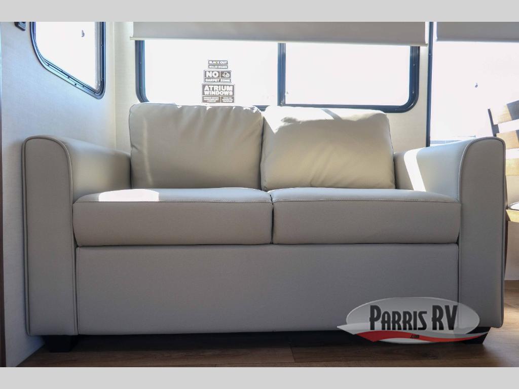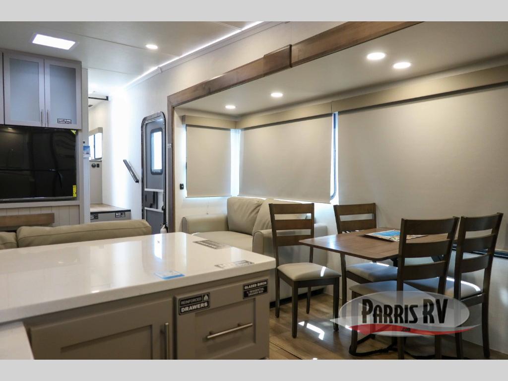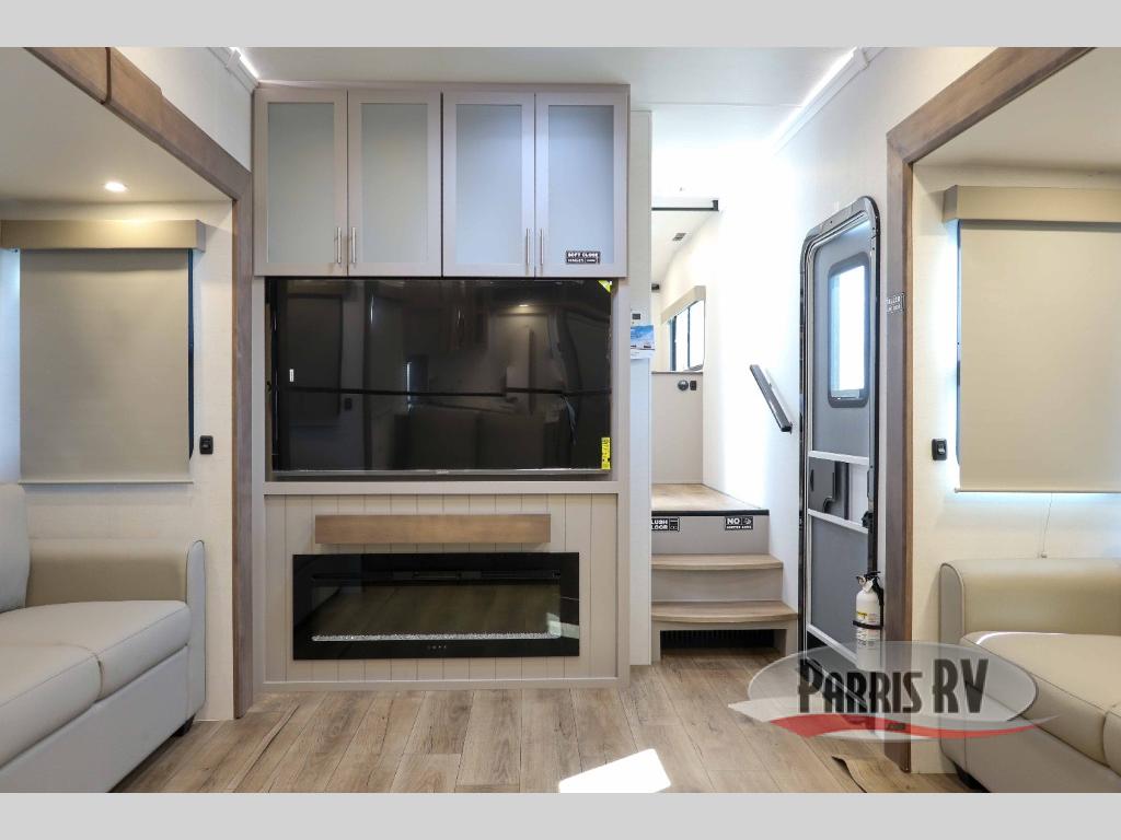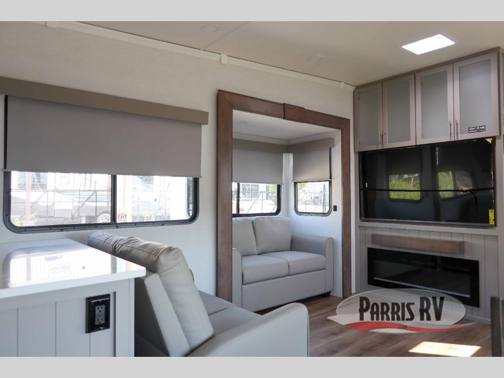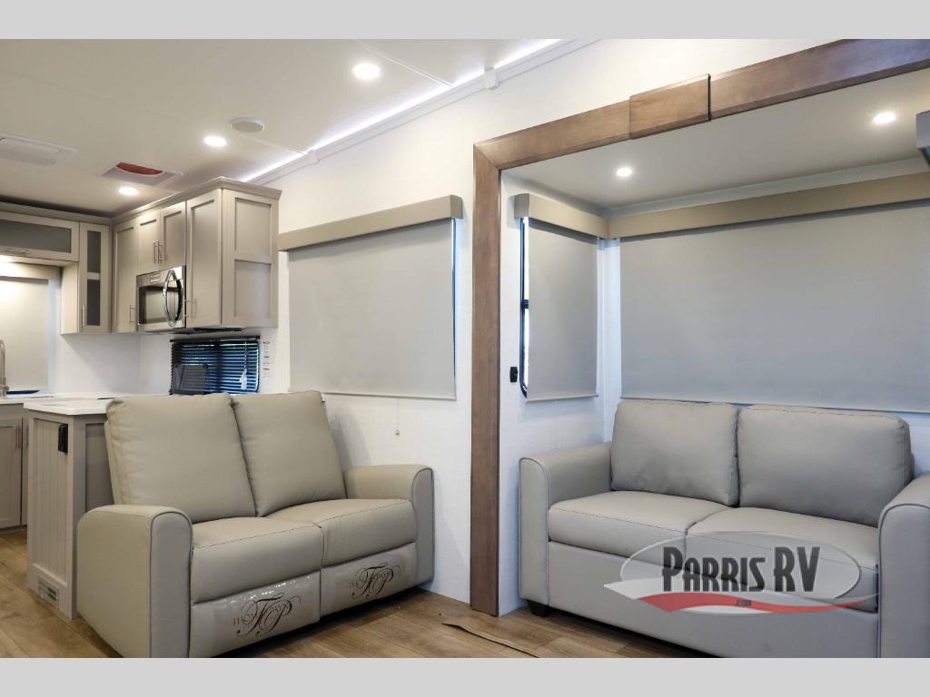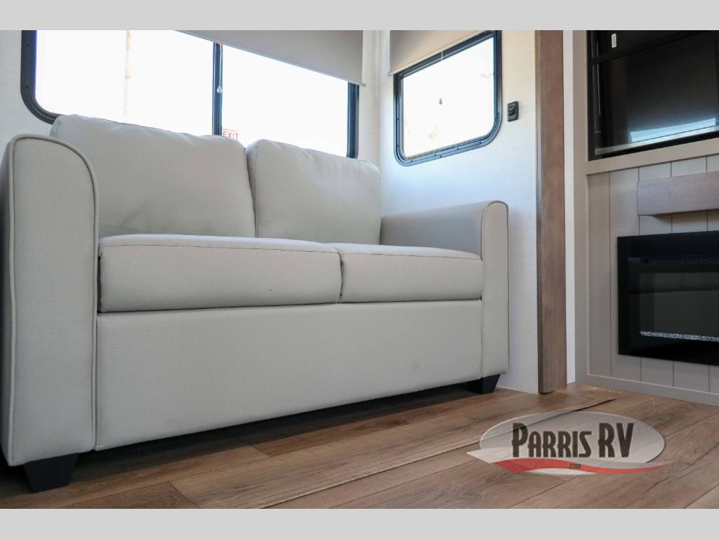 You're sure to love every minute spent in this triple slide out fifth wheel! There are dual sleeper sofas in the middle living area where your guests can sleep, while you take the queen bed slide out in the front bedroom. There is also a king bed option, a walk-in closet with washer and dryer prep, plus a dresser for even more storage. Back in the living area, you can relax on the dual recliner loveseat that sits across from the fireplace and 65" TV. Once dinner has been made on the three burner cooktop, you can dine at the floating dinette table with four chairs.