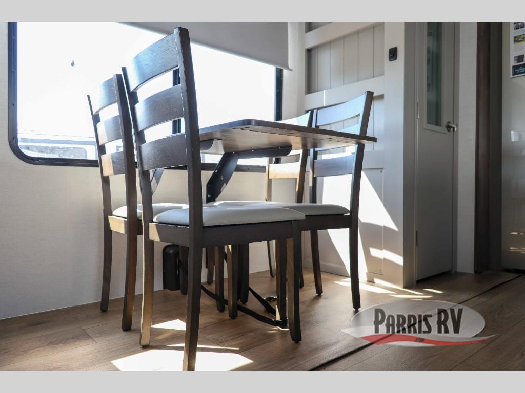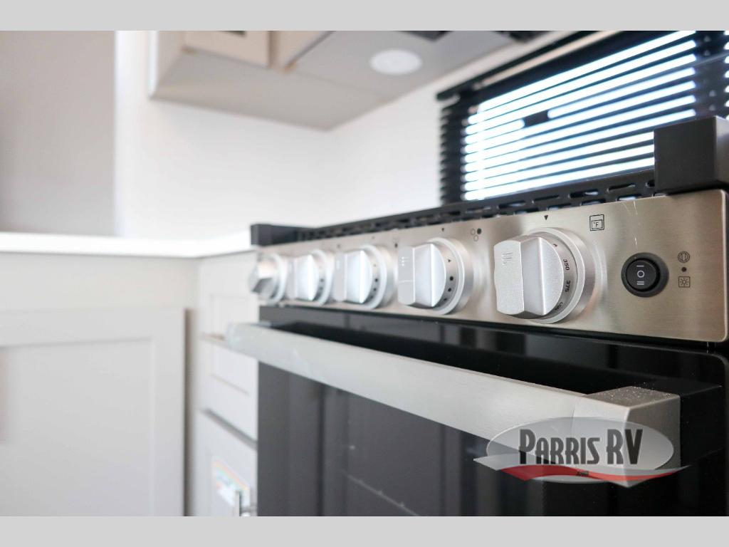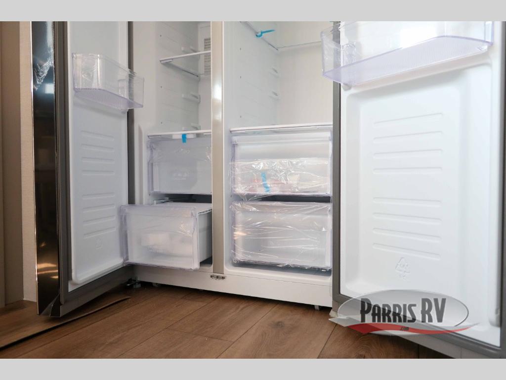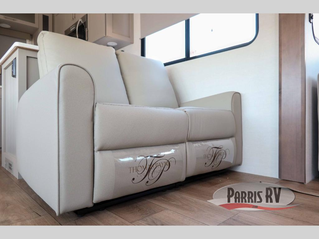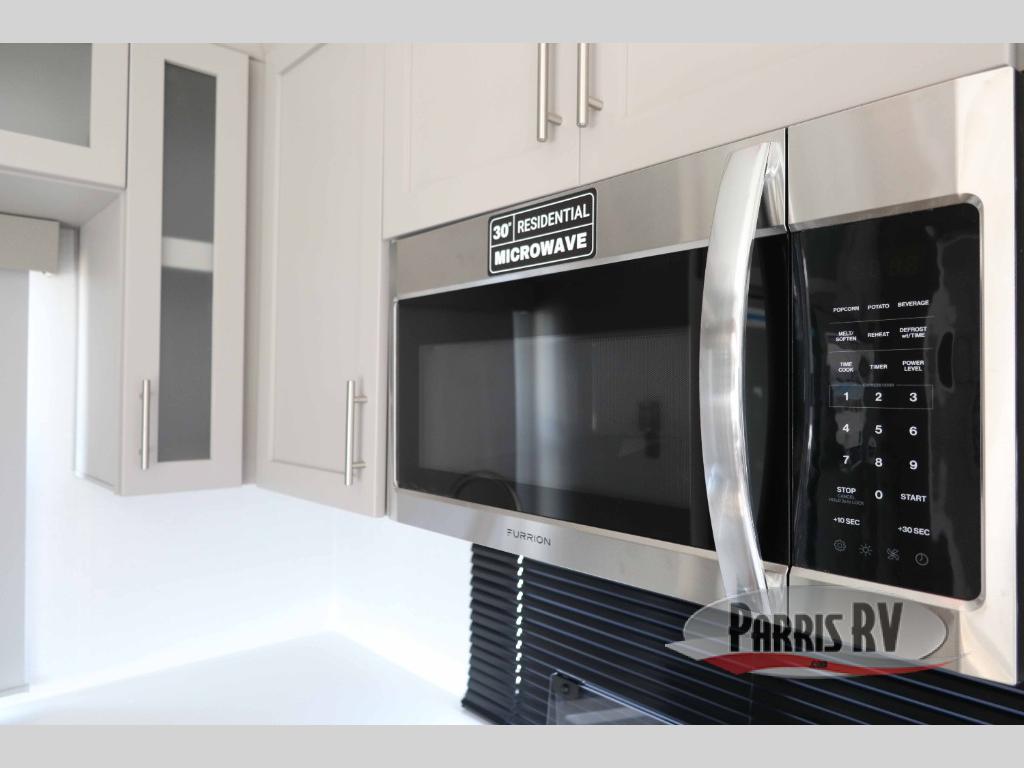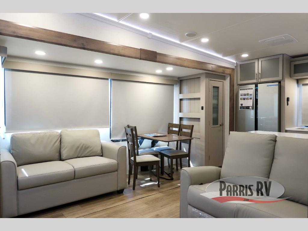 You're sure to love every minute spent in this triple slide out fifth wheel! There are dual sleeper sofas in the middle living area where your guests can sleep, while you take the queen bed slide out in the front bedroom. There is also a king bed option, a walk-in closet with washer and dryer prep, plus a dresser for even more storage. Back in the living area, you can relax on the dual recliner loveseat that sits across from the fireplace and 65" TV. Once dinner has been made on the three burner cooktop, you can dine at the floating dinette table with four chairs.