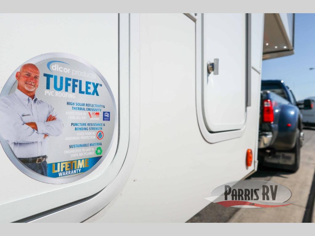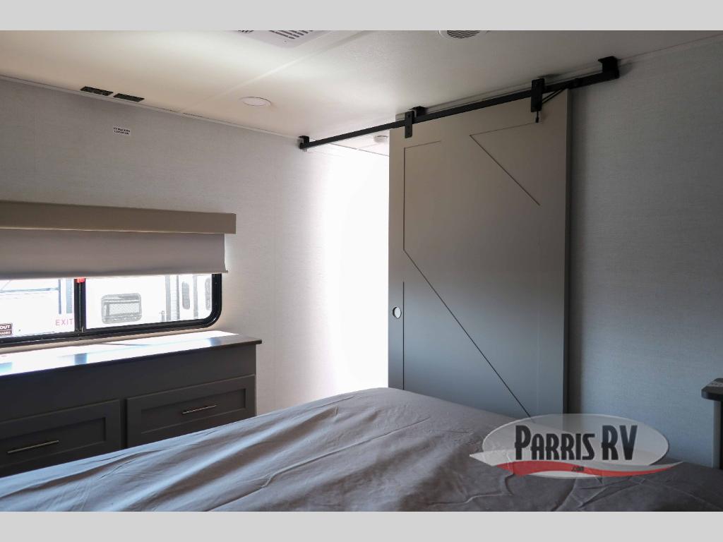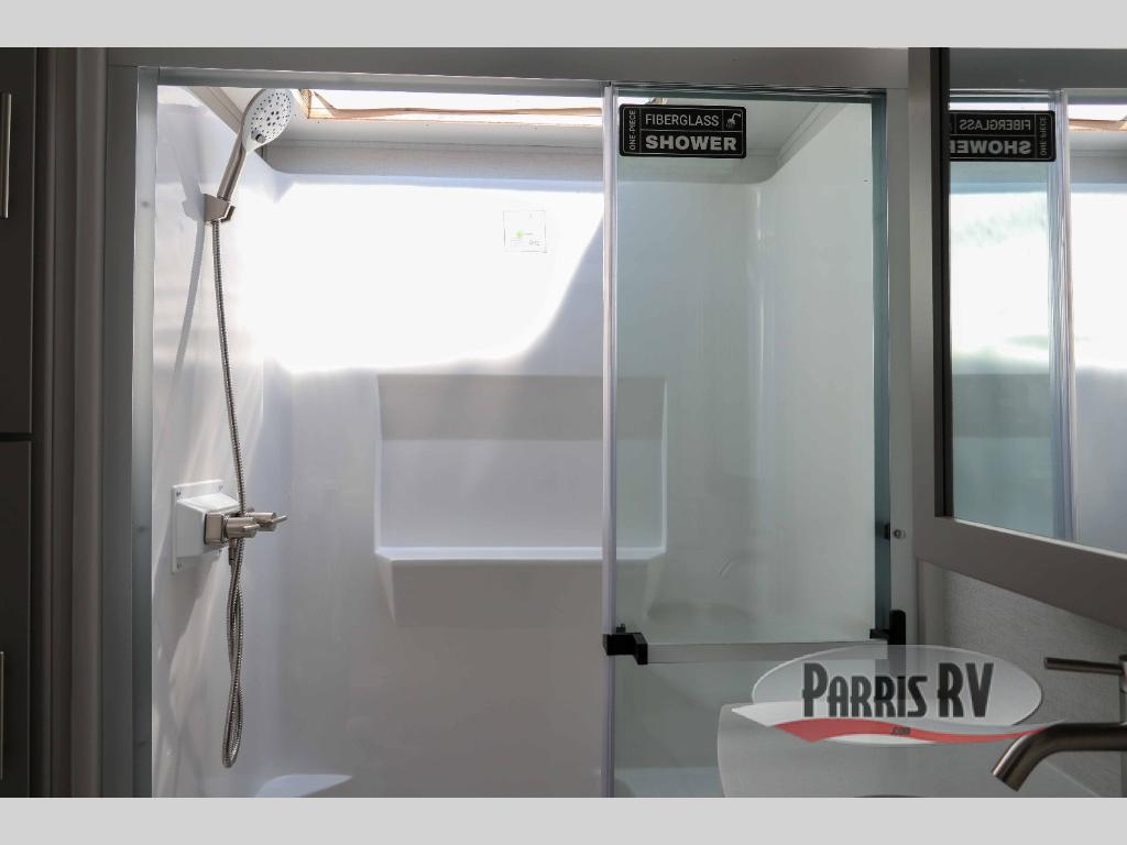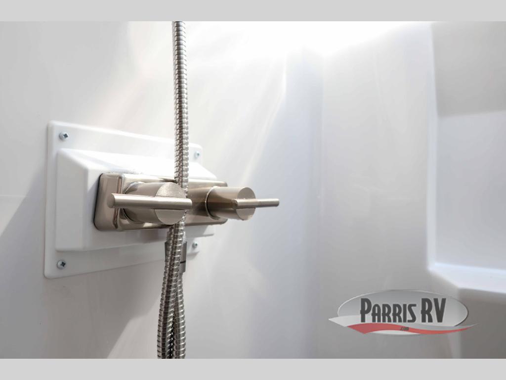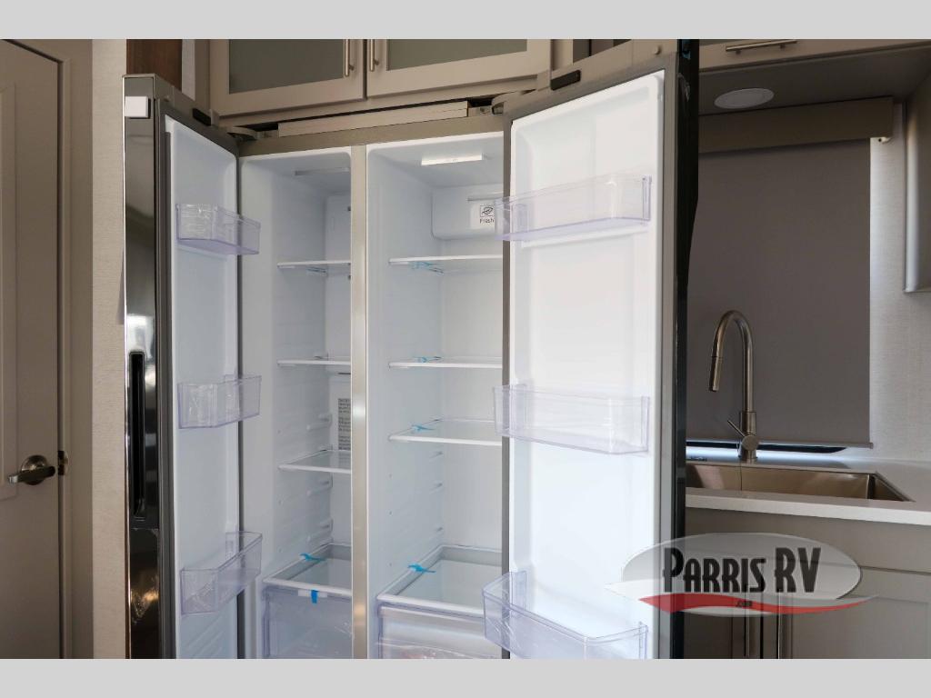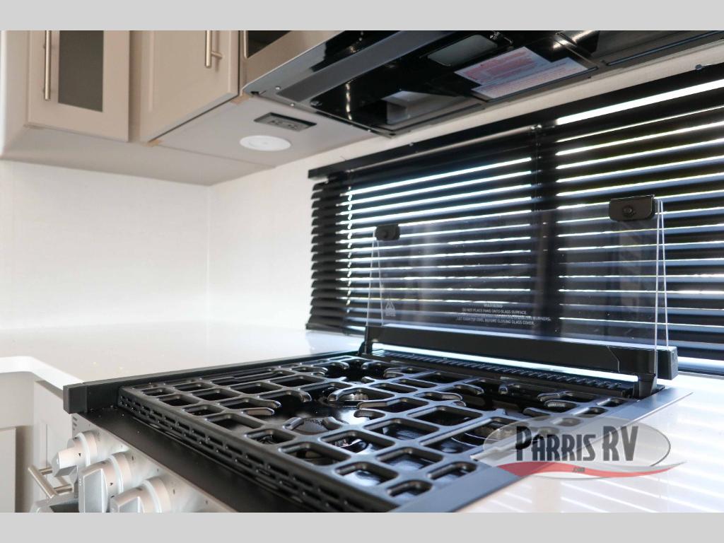 You're sure to love every minute spent in this triple slide out fifth wheel! There are dual sleeper sofas in the middle living area where your guests can sleep, while you take the queen bed slide out in the front bedroom. There is also a king bed option, a walk-in closet with washer and dryer prep, plus a dresser for even more storage. Back in the living area, you can relax on the dual recliner loveseat that sits across from the fireplace and 65" TV. Once dinner has been made on the three burner cooktop, you can dine at the floating dinette table with four chairs.