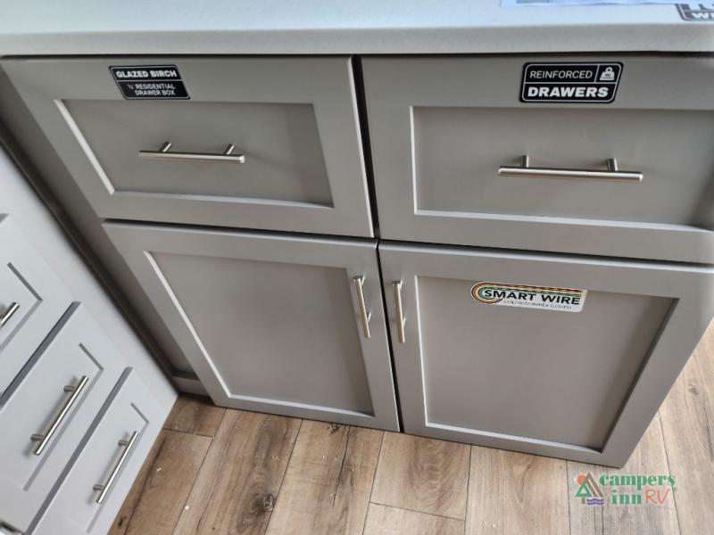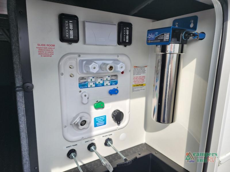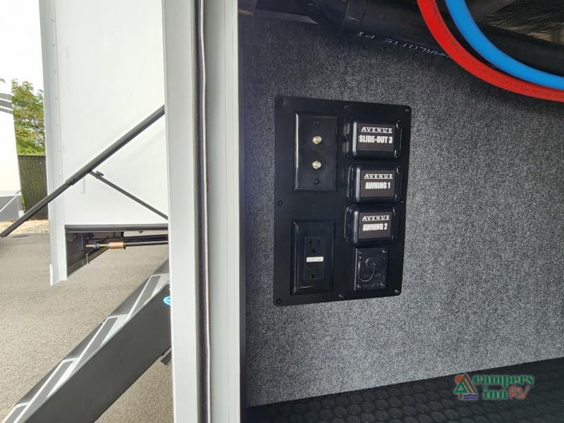 With any Avenue fifth wheel or travel trailer by Alliance RV, you will enjoy more interior space provided by the 8' 5" wide-body construction, and a long list of luxury features. Each is built with Azdel composite sidewalls both inside and out, along with a PVC roof for added strength. There are innovative storage solutions that include hidden storage behind the TV, within end tables and ottomans, and more. Since these units feature no carpet throughout, cleaning will be easier than ever, and there are flush floor slides throughout for seamless living spaces. The Avenue also comes with the OTG Solar Package with a 400 watt solar panel, inverter prep, multiple outlets, and more to keep you charged up!