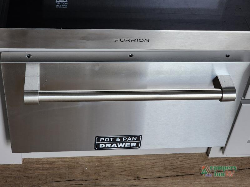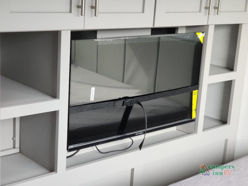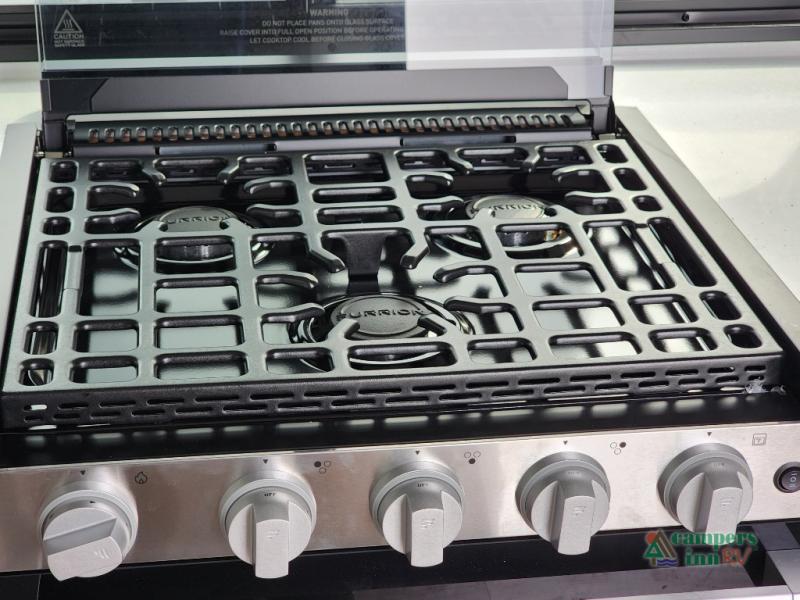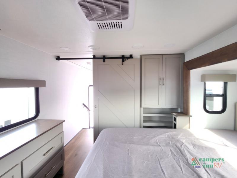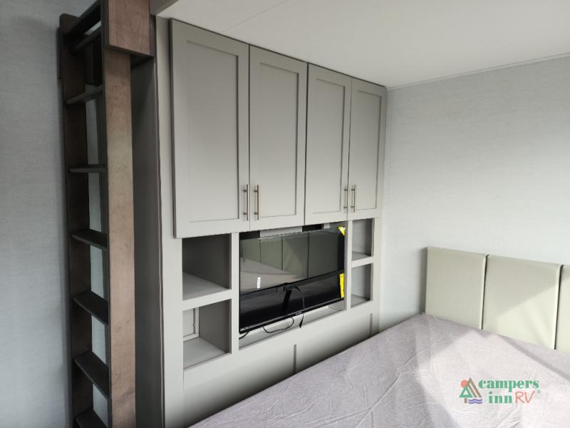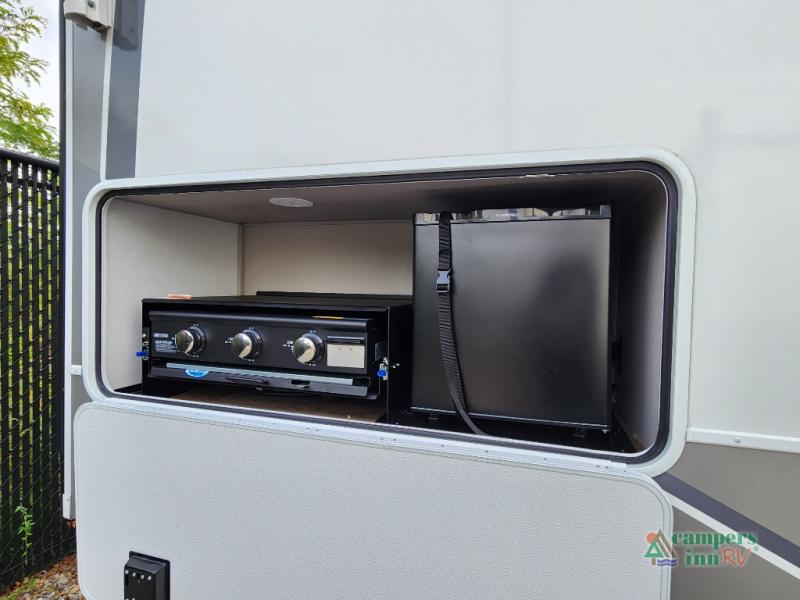 The whole gang can join in on the fun in this fifth wheel! The rear private 54" x 74"  loft bed features a lower 60" x 70" bed beneath with storage and a TV, and its very own half bathroom with private entry/exit to the outside. There is also an exterior baggage door so you can easily pack gear straight into this room. The living area comes with dual recliner theater seating, a swing out 50" class HDTV, and a floating dinette table with two chairs and a movable ottoman with flip up storage. There is also a 16 cu. ft. 12 volt refrigerator and pull-out pantry here for food storage. And you can easily prepare your best home cooked meals using the three burner cooktop. When you're ready to wind down your night, head to the front private bedroom and relax on the queen bed slide which could be switched out for the optional king bed if you like! This unit also features an outdoor griddle and refrigerator under the loft space.