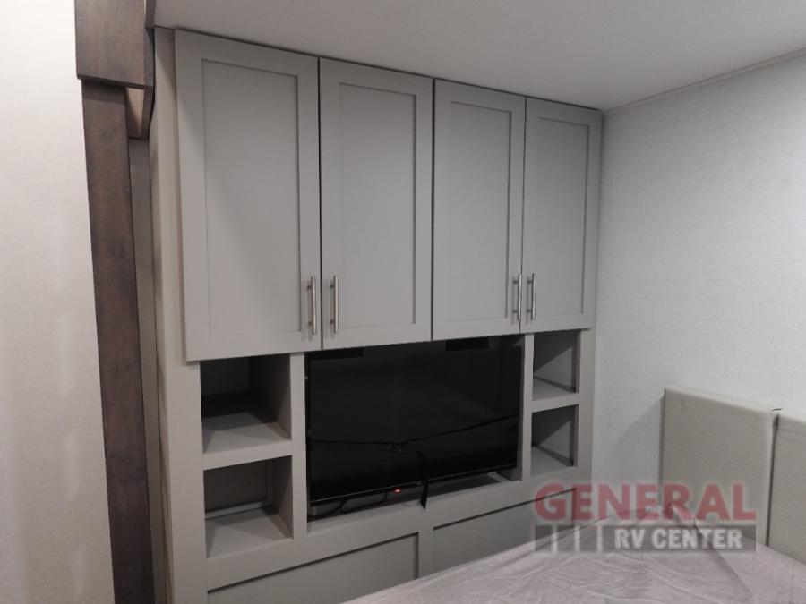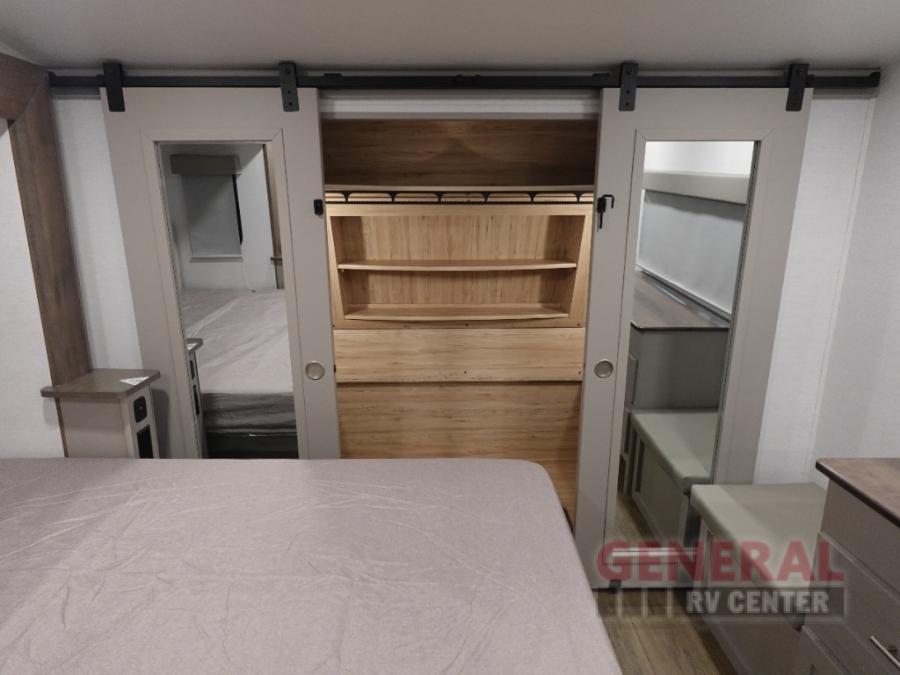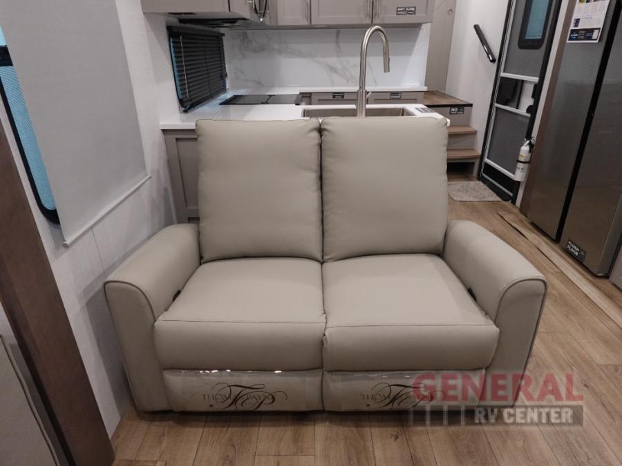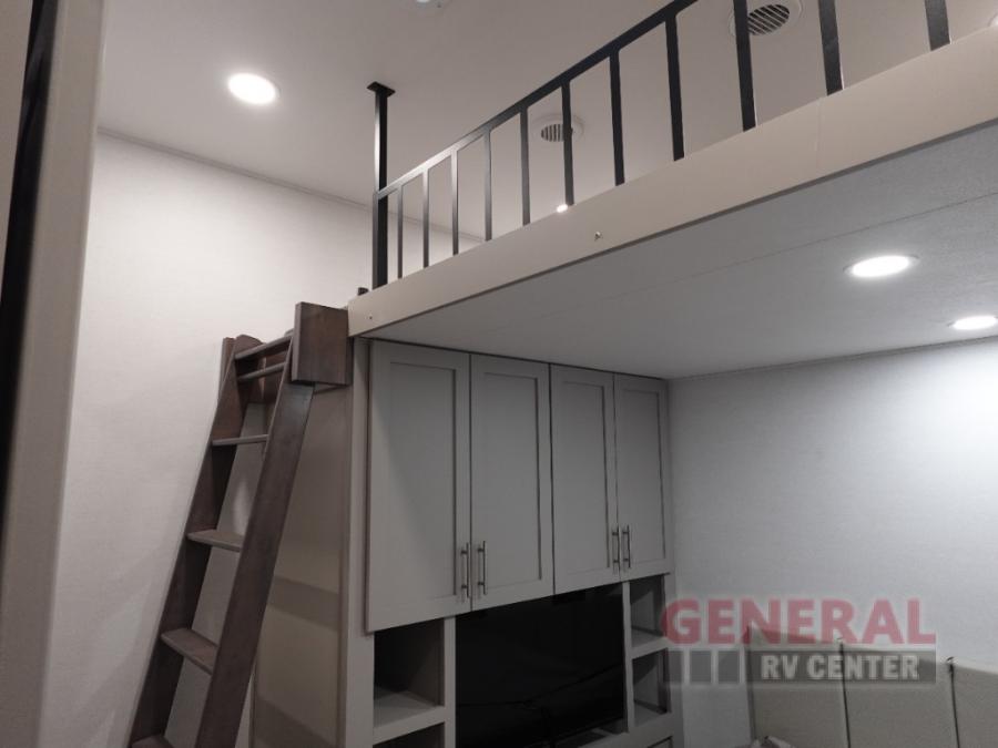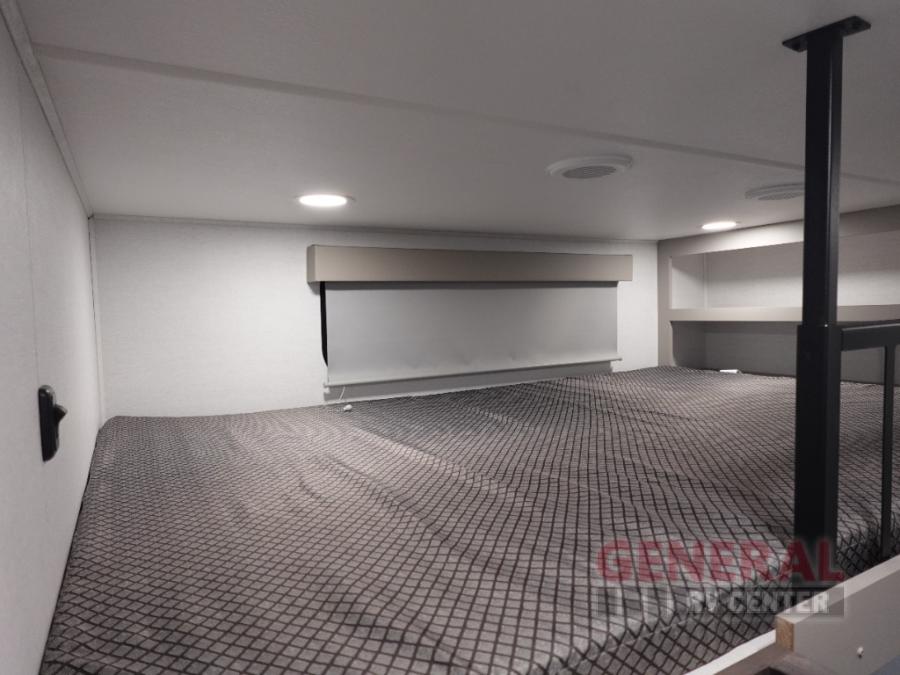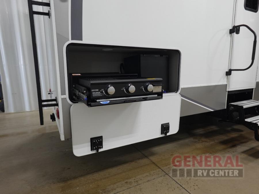 The whole gang can join in on the fun in this fifth wheel! The rear private 54" x 74"  loft bed features a lower 60" x 70" bed beneath with storage and a TV, and its very own half bathroom with private entry/exit to the outside. There is also an exterior baggage door so you can easily pack gear straight into this room. The living area comes with dual recliner theater seating, a swing out 50" class HDTV, and a floating dinette table with two chairs and a movable ottoman with flip up storage. There is also a 16 cu. ft. 12 volt refrigerator and pull-out pantry here for food storage. And you can easily prepare your best home cooked meals using the three burner cooktop. When you're ready to wind down your night, head to the front private bedroom and relax on the king bed slide! This unit also features an outdoor griddle and refrigerator under the loft space.