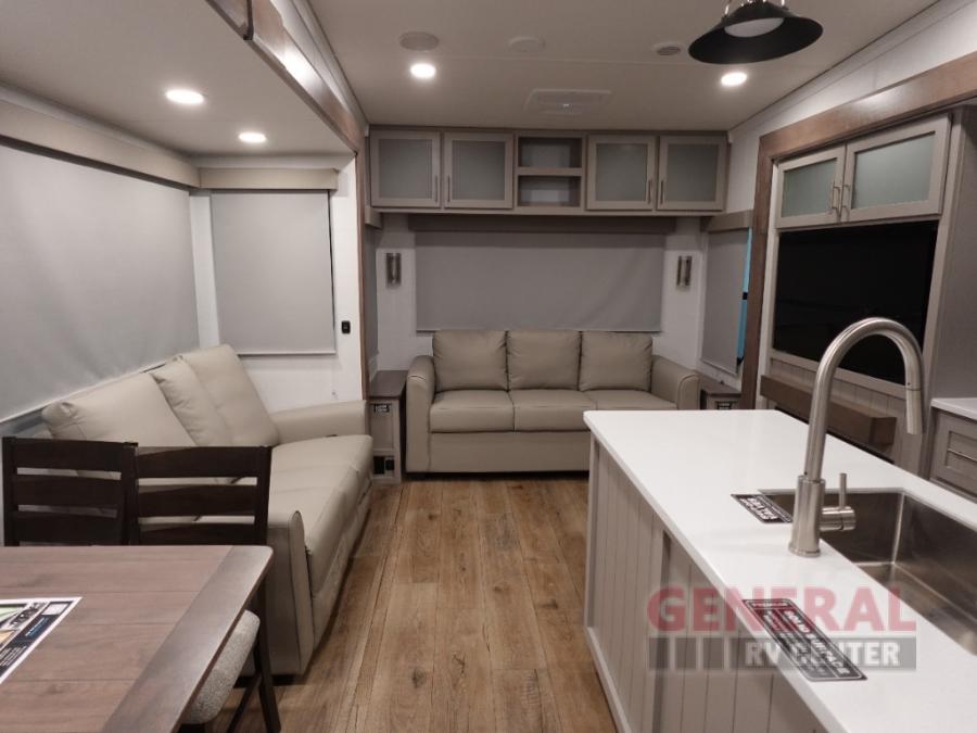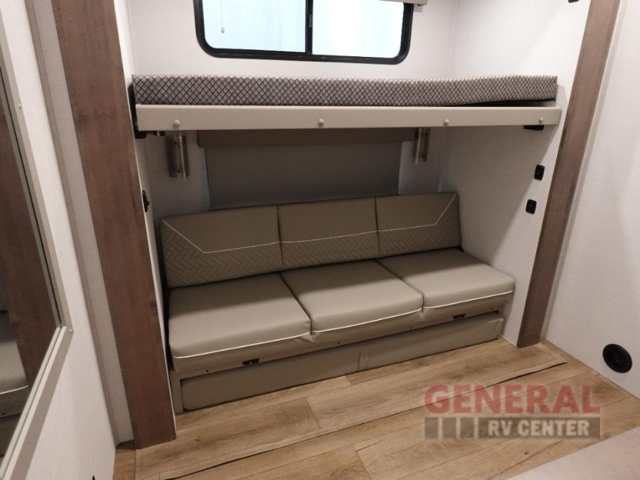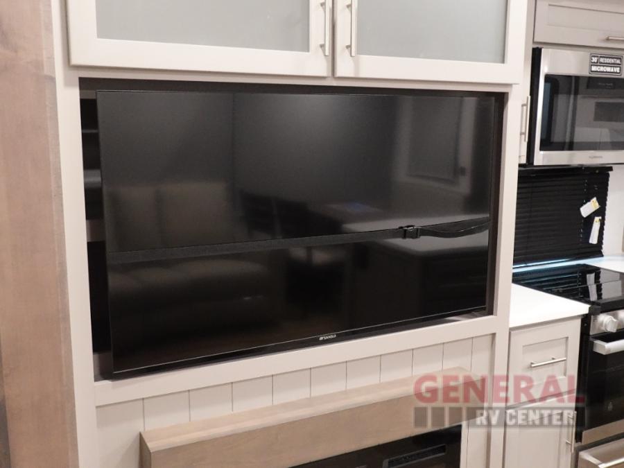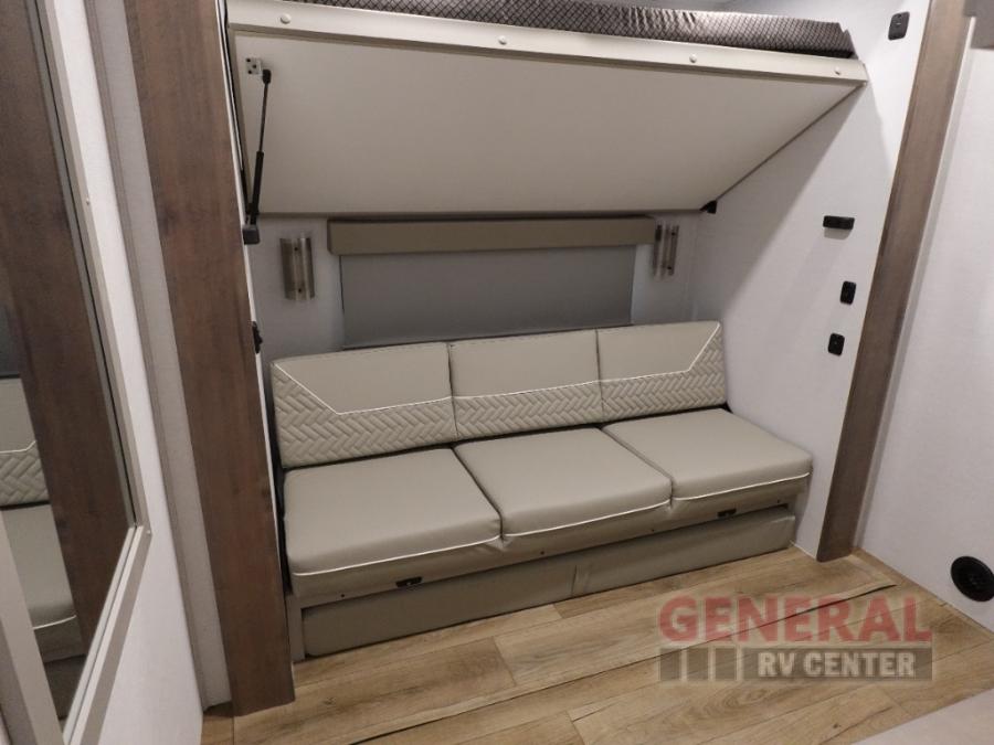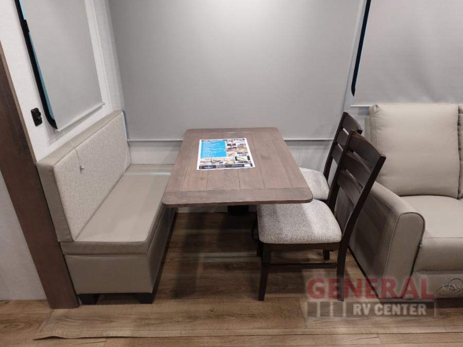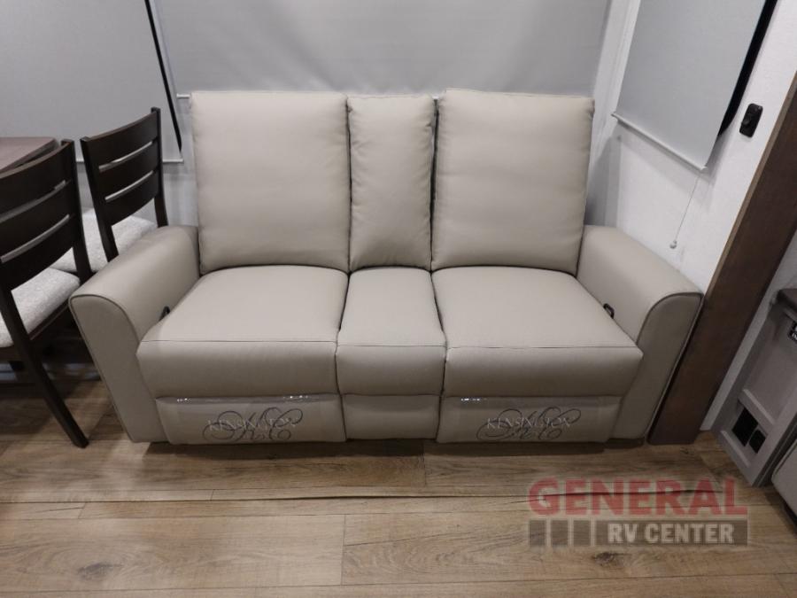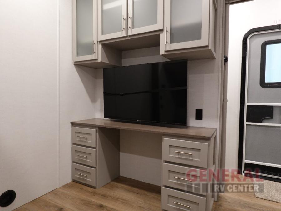 Life will be easy in this fifth wheel! The floating dinette table has two chairs on one side and a movable ottoman with flip up storage on the other side to keep your games or extra table cloths in. The kitchen island makes it easy to prepare a delicious home cooked meal. You can store your dishes and snacks inside the hutch/pantry or in the second pantry. The front private bedroom has a king bed slide. There is also a dresser and large wardrobe for storage, and either side of the wardrobe with washer and dryer prep. The rear living area features a dual recliner theater seat across from an entertainment center with a 50" class HDTV with hidden storage behind it, and easy for all to see even at the rear sleeper sofa. Plus, you have a second bedroom with a slide that houses a sleeper sofa bunk and trundle across from a dresser with a 40" TV above it!