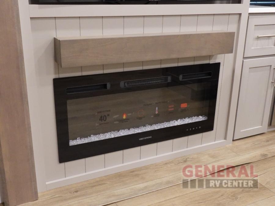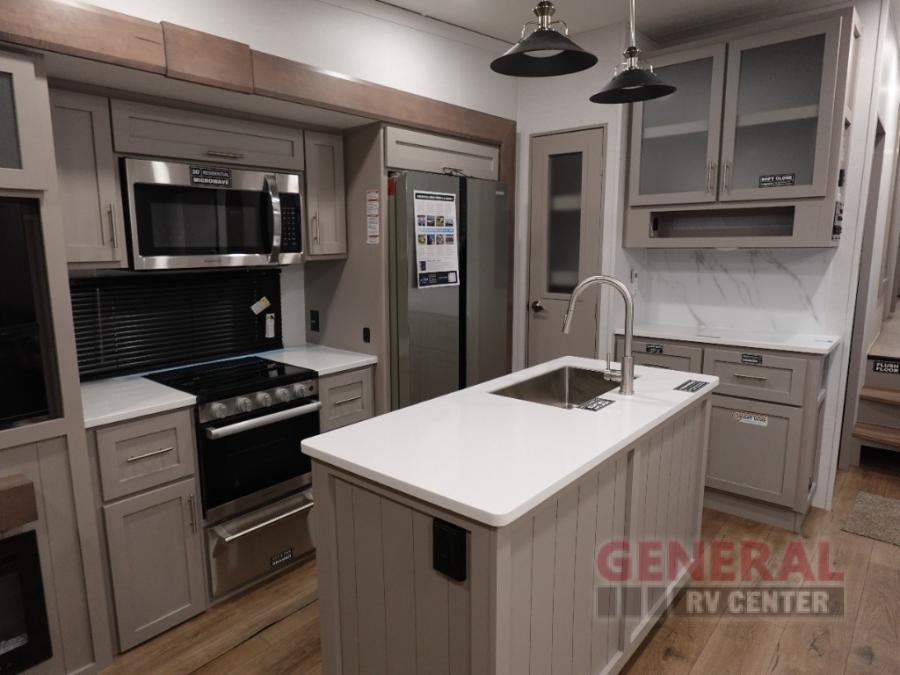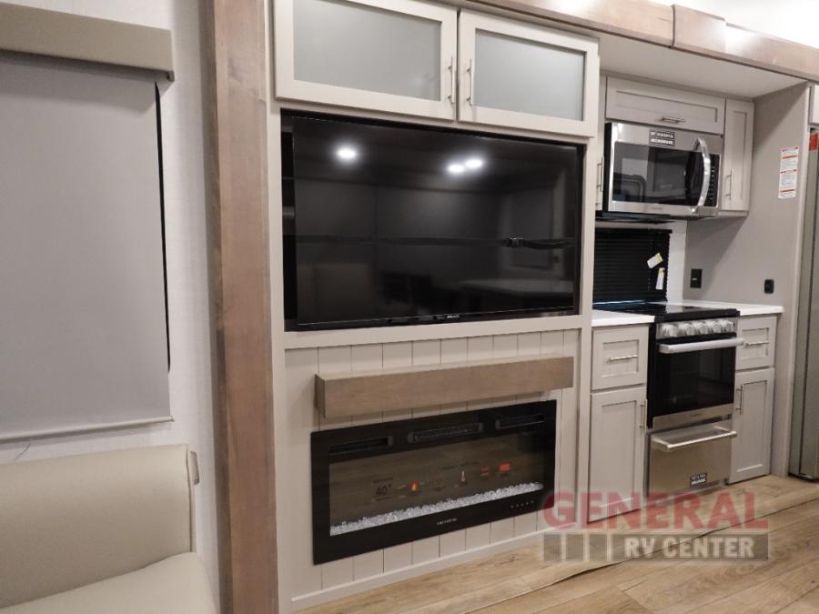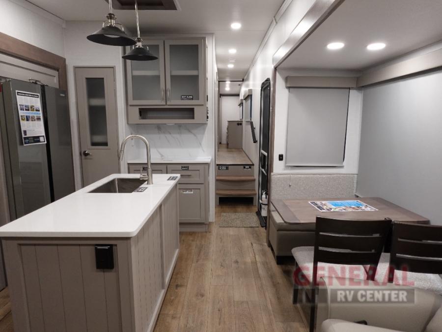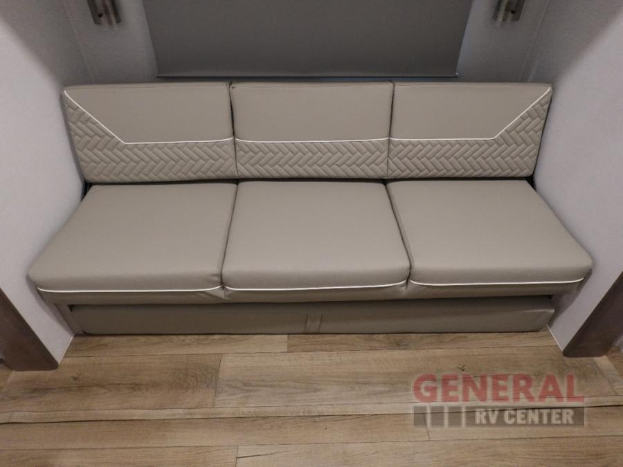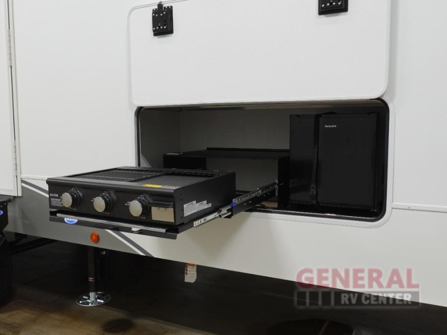 Life will be easy in this fifth wheel! The floating dinette table has two chairs on one side and a movable ottoman with flip up storage on the other side to keep your games or extra table cloths in. The kitchen island makes it easy to prepare a delicious home cooked meal. You can store your dishes and snacks inside the hutch/pantry or in the second pantry. The front private bedroom has a king bed slide. There is also a dresser and large wardrobe for storage, and either side of the wardrobe with washer and dryer prep. The rear living area features a dual recliner theater seat across from an entertainment center with a 50" class HDTV with hidden storage behind it, and easy for all to see even at the rear sleeper sofa. Plus, you have a second bedroom with a slide that houses a sleeper sofa bunk and trundle across from a dresser with a 40" TV above it!