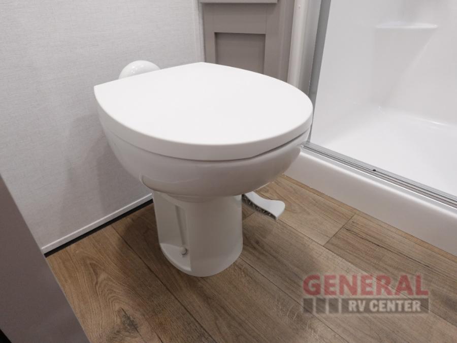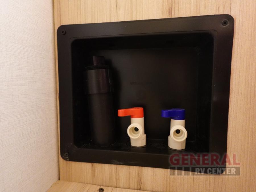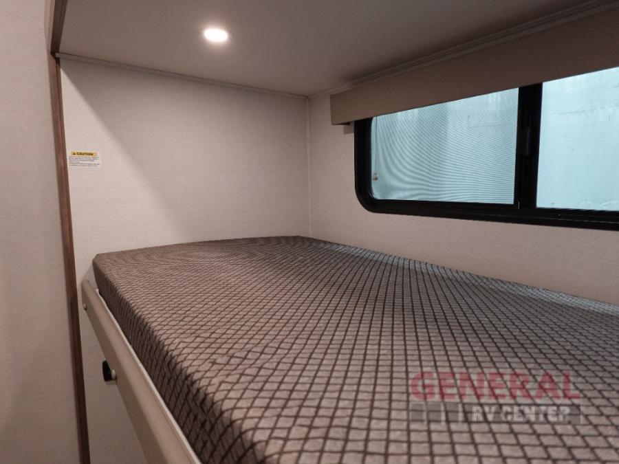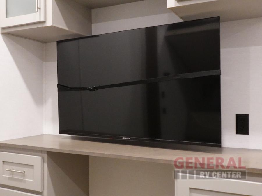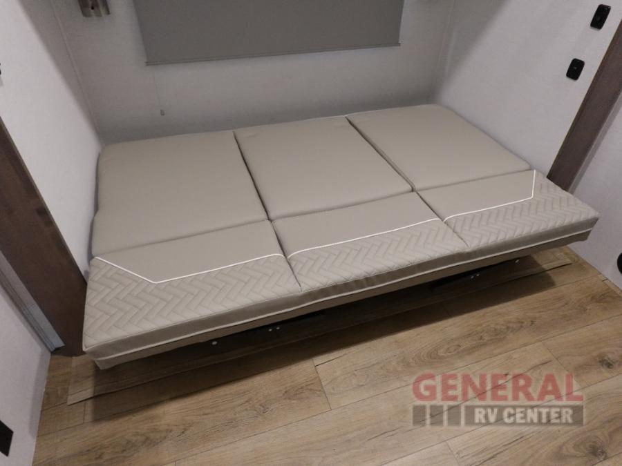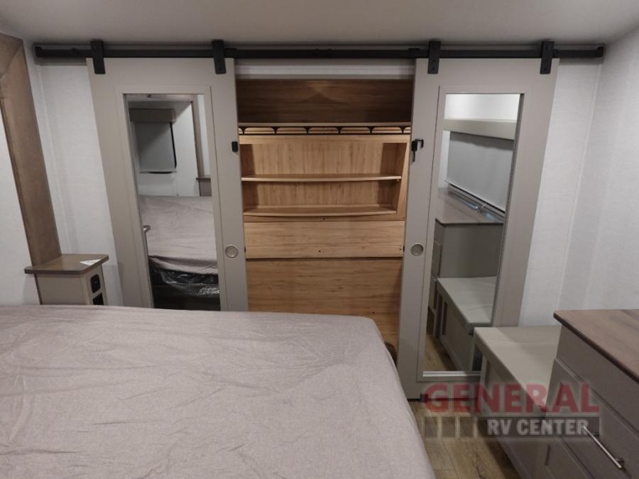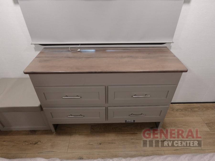 Life will be easy in this fifth wheel! The floating dinette table has two chairs on one side and a movable ottoman with flip up storage on the other side to keep your games or extra table cloths in. The kitchen island makes it easy to prepare a delicious home cooked meal. You can store your dishes and snacks inside the hutch/pantry or in the second pantry. The front private bedroom has a king bed slide. There is also a dresser and large wardrobe for storage, and either side of the wardrobe with washer and dryer prep. The rear living area features a dual recliner theater seat across from an entertainment center with a 50" class HDTV with hidden storage behind it, and easy for all to see even at the rear sleeper sofa. Plus, you have a second bedroom with a slide that houses a sleeper sofa bunk and trundle across from a dresser with a 40" TV above it!