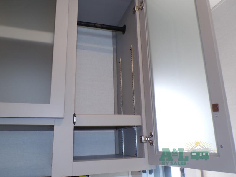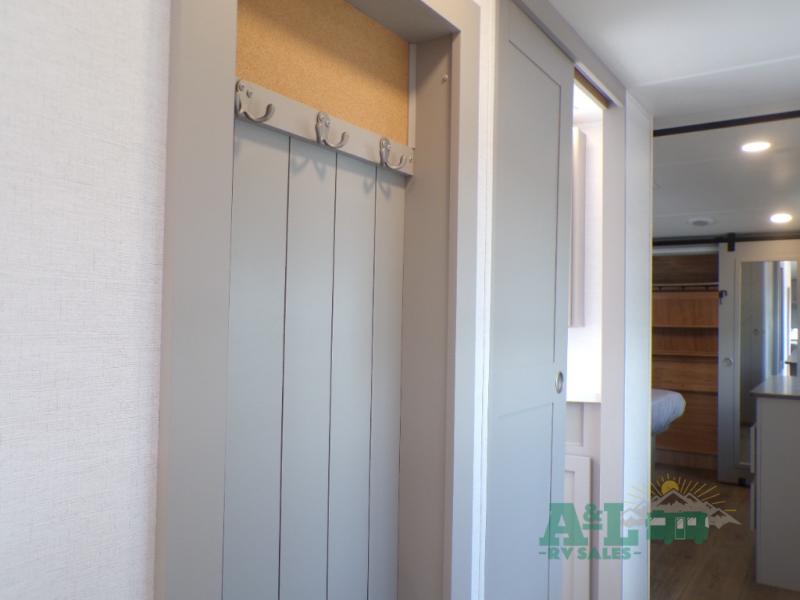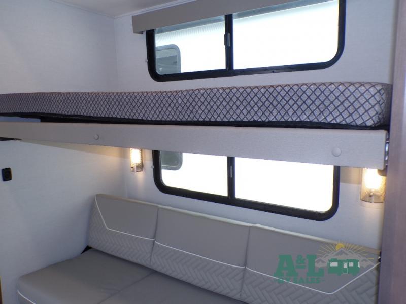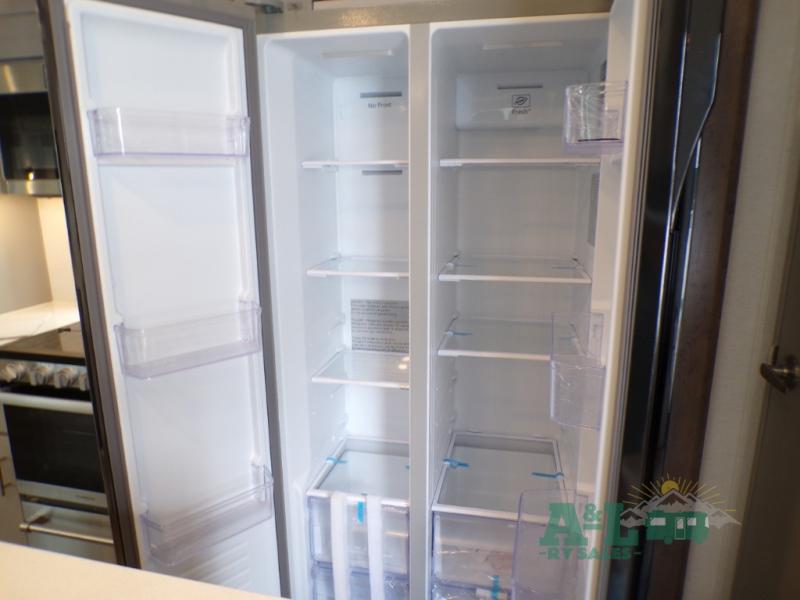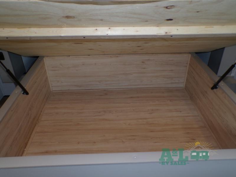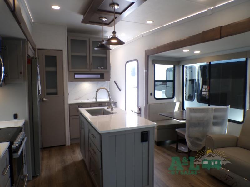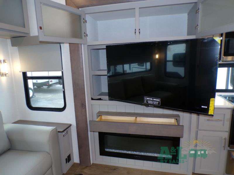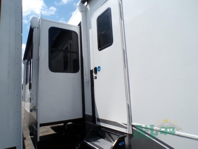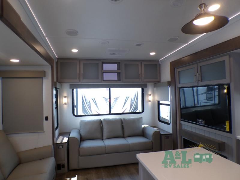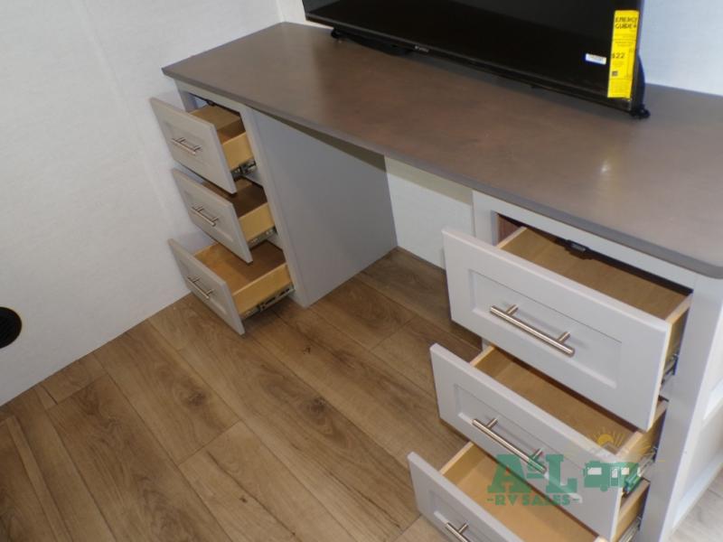 Life will be easy in this fifth wheel! The floating dinette table has two chairs on one side and a movable ottoman with flip up storage on the other side to keep your games or extra table cloths in. The kitchen island makes it easy to prepare a delicious home cooked meal. You can store your dishes and snacks inside the hutch/pantry or in the second pantry. The front private bedroom has a queen bed slide but can be switched out for the optional king bed if you like. There is also a dresser and large wardrobe for storage, and either side of the wardrobe with washer and dryer prep. The rear living area features a dual recliner theater seat across from an entertainment center with a 50" class HDTV with hidden storage behind it, and easy for all to see even at the rear sleeper sofa. Plus, you have a second bedroom with a slide that houses a sleeper sofa bunk and trundle across from a dresser with a 40" TV above it!