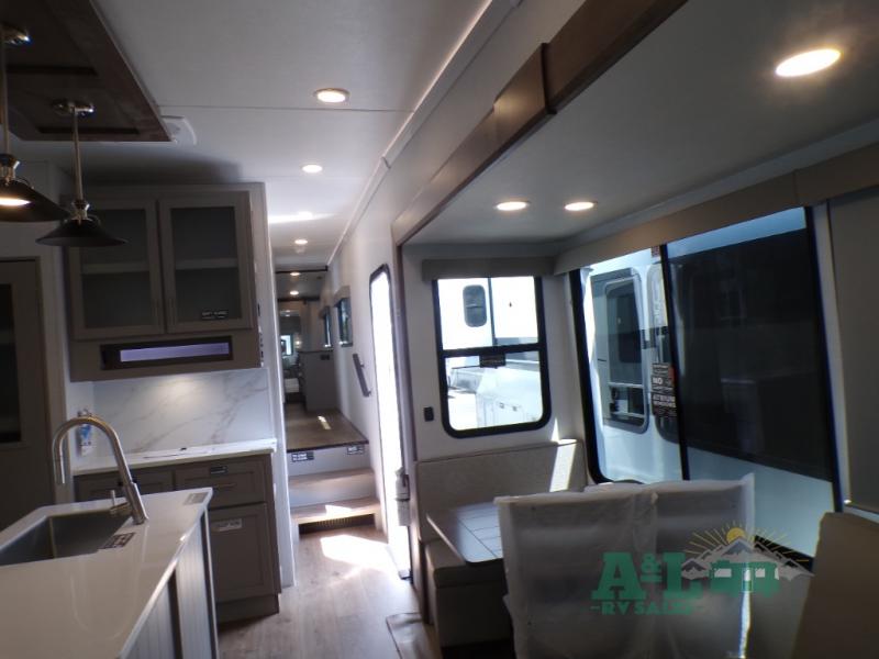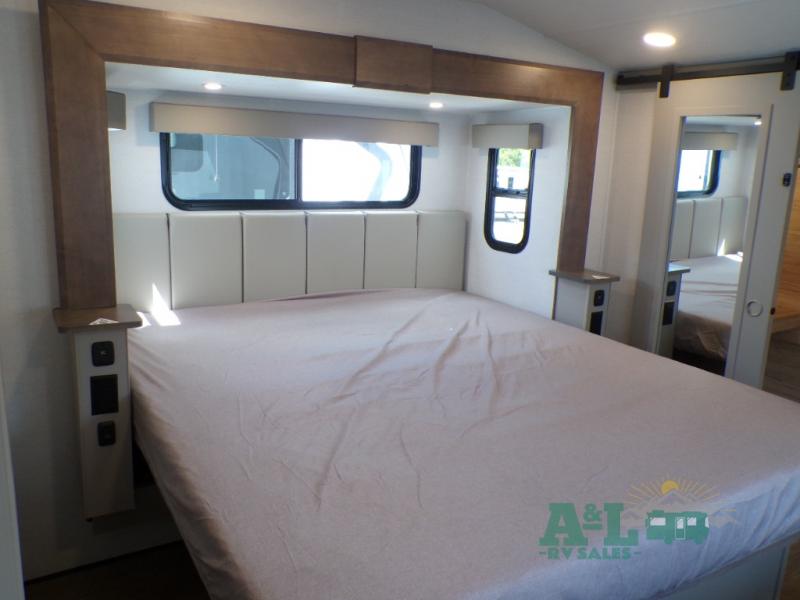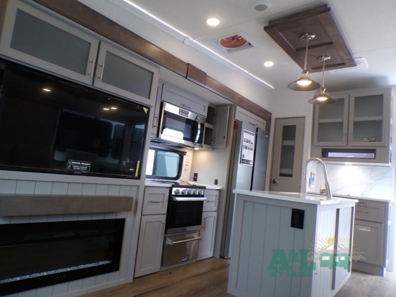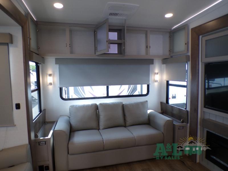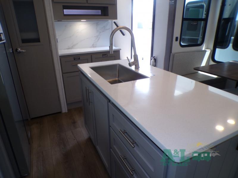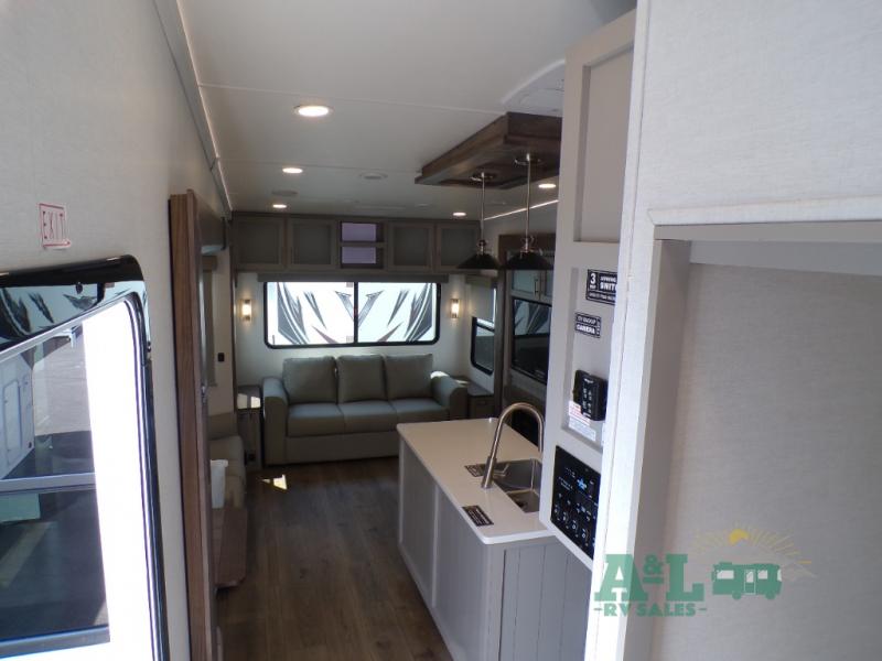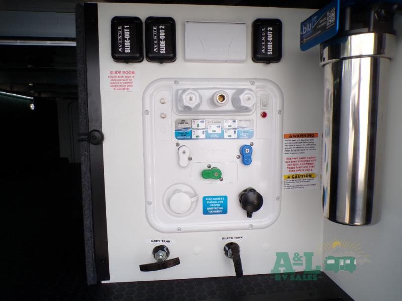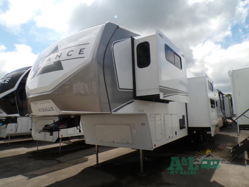 With any Avenue fifth wheel or travel trailer by Alliance RV, you will enjoy more interior space provided by the 8' 5" wide-body construction, and a long list of luxury features. Each is built with Azdel composite sidewalls both inside and out, along with a PVC roof for added strength. There are innovative storage solutions that include hidden storage behind the TV, within end tables and ottomans, and more. Since these units feature no carpet throughout, cleaning will be easier than ever, and there are flush floor slides throughout for seamless living spaces. The Avenue also comes with the OTG Solar Package with a 400 watt solar panel, inverter prep, multiple outlets, and more to keep you charged up!