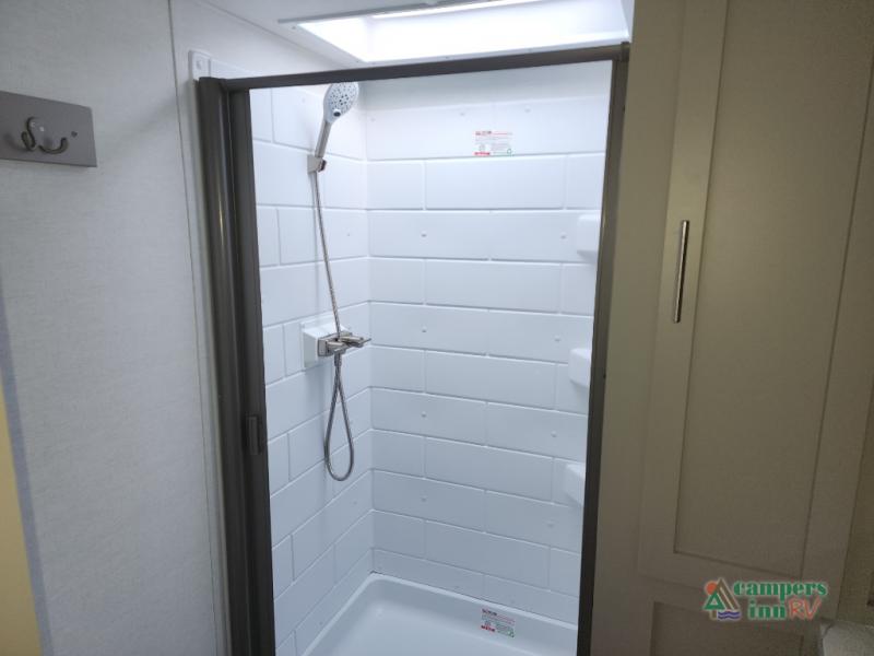 This fifth wheel is ready for adventure when you are! Once you arrive at the campground, you can put out the 16' awning, then start lunch on the exterior griddle. A booth dinette and theater sofa provide seating space inside, and there is a 50" Class HDTV to enjoy movies. The chef will also love the interior kitchen with its ample counter space, and there is plenty of storage with a hutch/pantry, second pantry, and 10 cu. ft. 12V refrigerator. Freshen up in the full bath before heading off to bed in the front private bedroom. Here, you'll find a queen bed, dual nightstands and overhead storage, plus a wardrobe with washer and dryer prep if you choose to add those appliances!