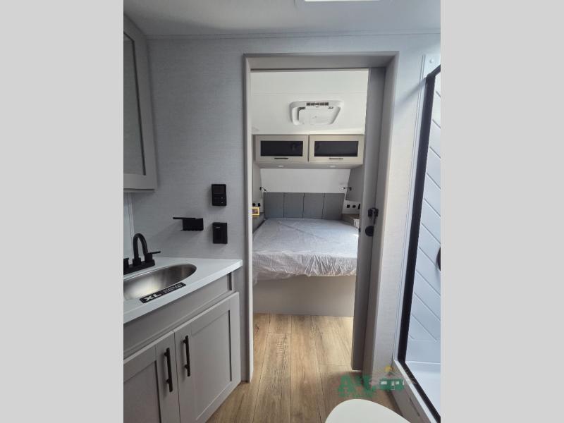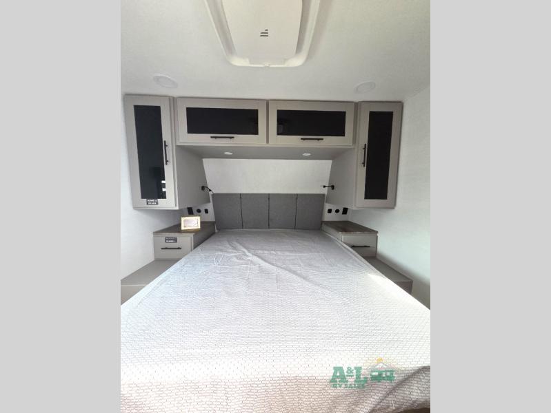 Grab your hiking boots and your sense of adventure for fun camping trips in this single slide out travel trailer. The rear booth dinette includes overhead storage for your things and the sofa slide out is in great view of the 40" HDTV. There is also a fireplace here that will make your space feel more like home plus more storage space, including an entryway pantry and storage above the 10 cu. ft. 12V refrigerator. A walk-through bath will take you to the front master bedroom with a queen bed, wardrobe nightstands, plus its own exterior entry door!