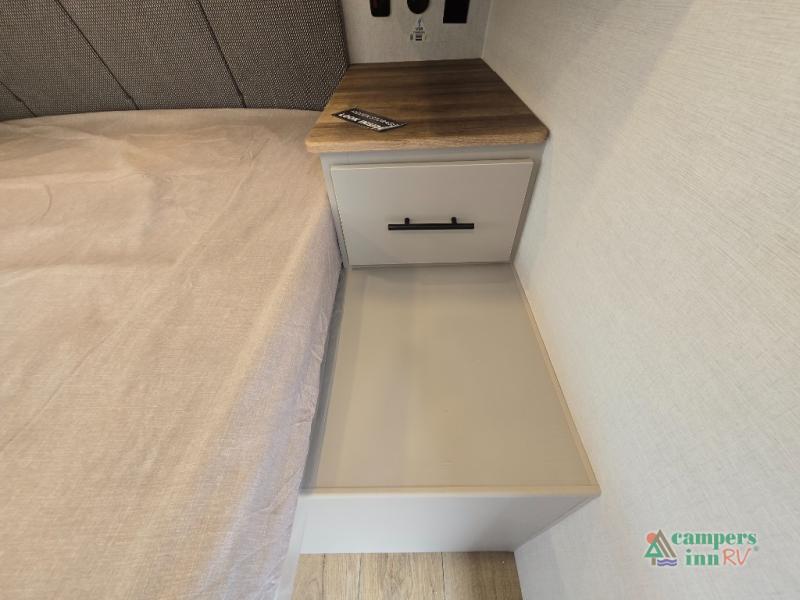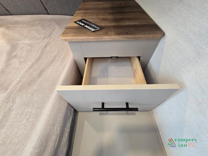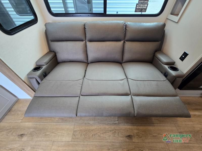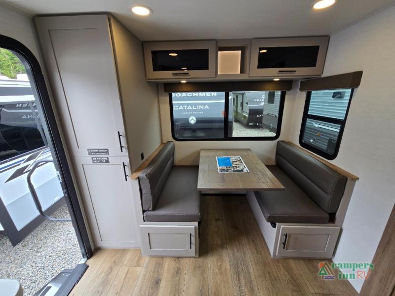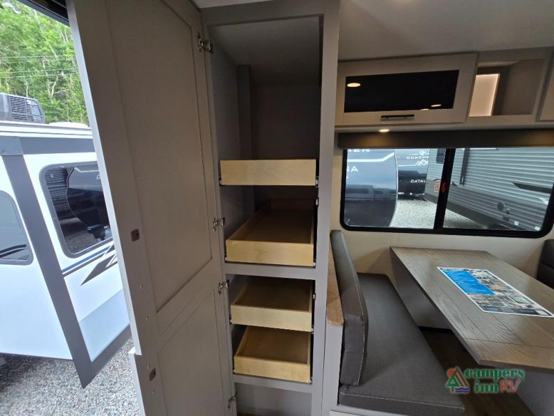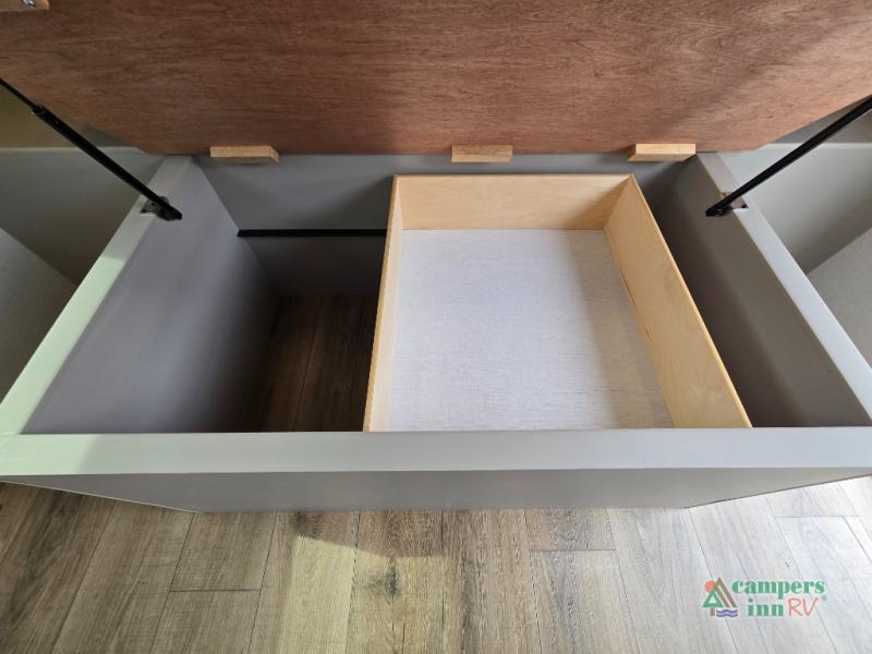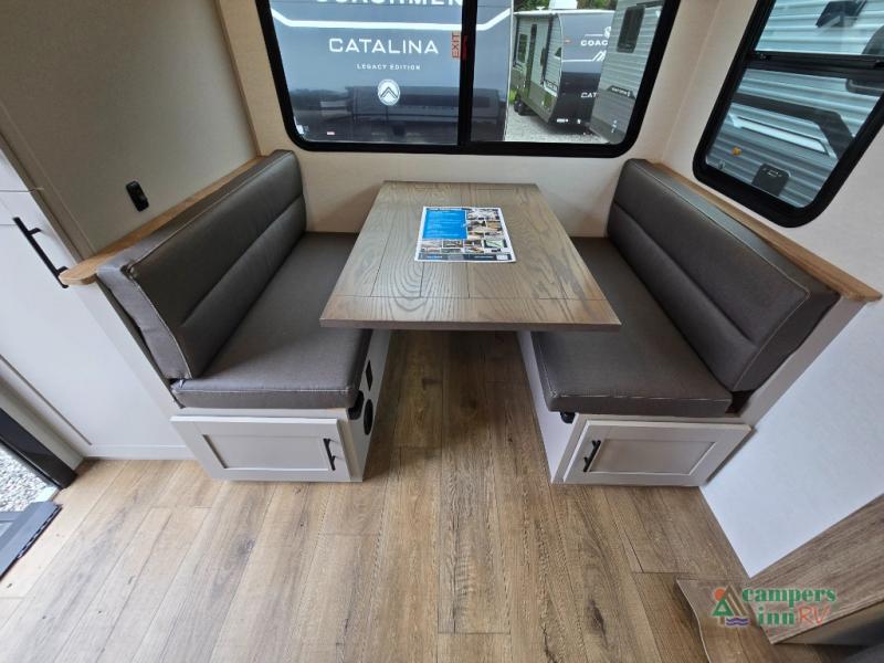 Offers comfortable dining and lounging space while still being compact. The slide-out creates roominess without overextending the length of the trailer.