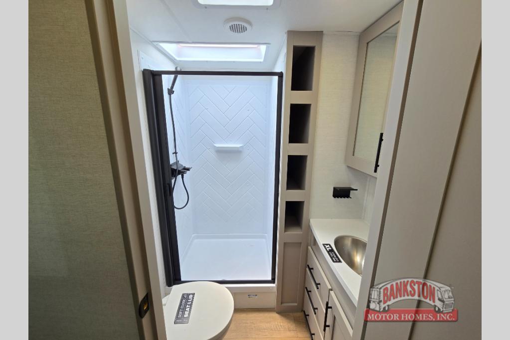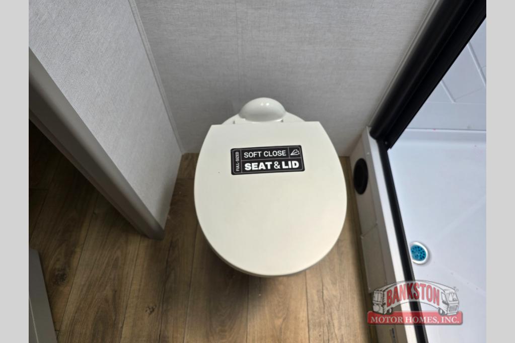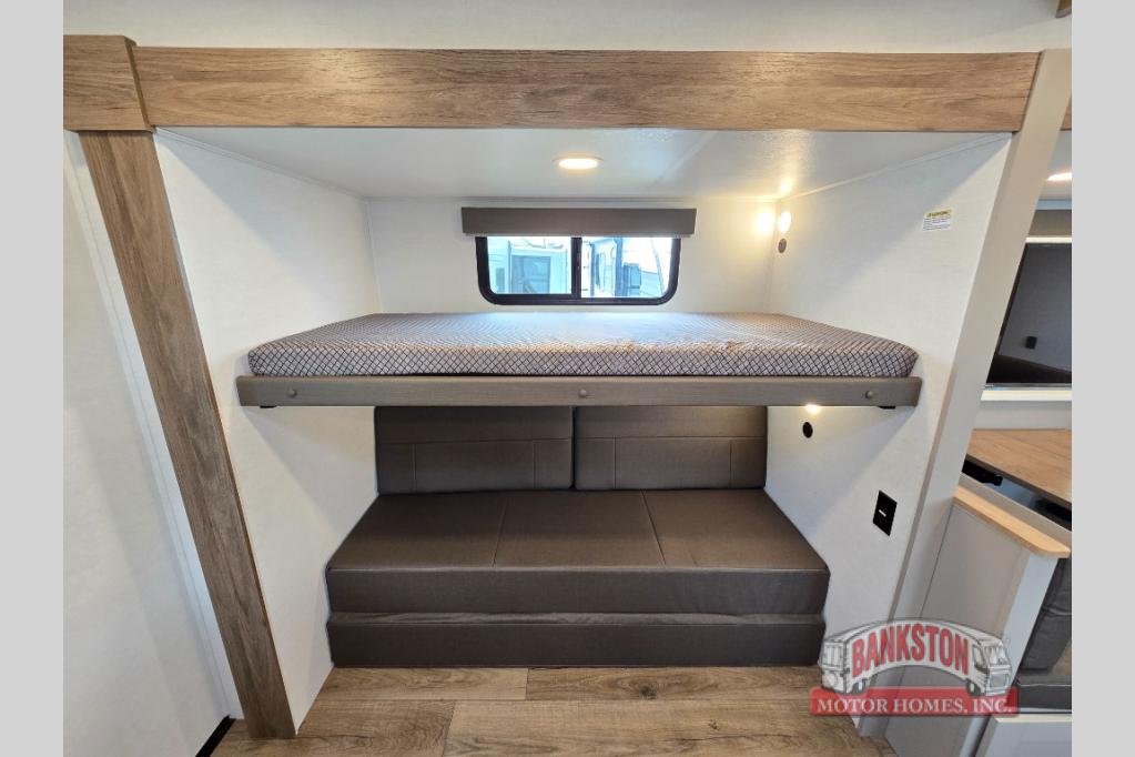 Enjoy glamping in this spacious travel trailer for eight! Your guests or the kids will love the rear bunkhouse with 40" x 72" bunk beds across from a third bunk with a cube sofa below, and the slide out will make this space more open. The slide out also includes the booth dinette in the main living area, which is across from the sofa slide out. The chef will love cooking in this Delta kitchen with generous counter space, a 10 cu. ft. 12V refrigerator, plus pull-out pantry trays for dry goods and snacks. The full bath with a 30" x 36" shower and a soft close porcelain foot flush toilet will allow you to fresh up each day without having to use the camp's facilities. And don't overlook the front private bedroom with a queen bed, wardrobe nightstands, a third wardrobe plus overhead storage; now nothing has to get left behind!