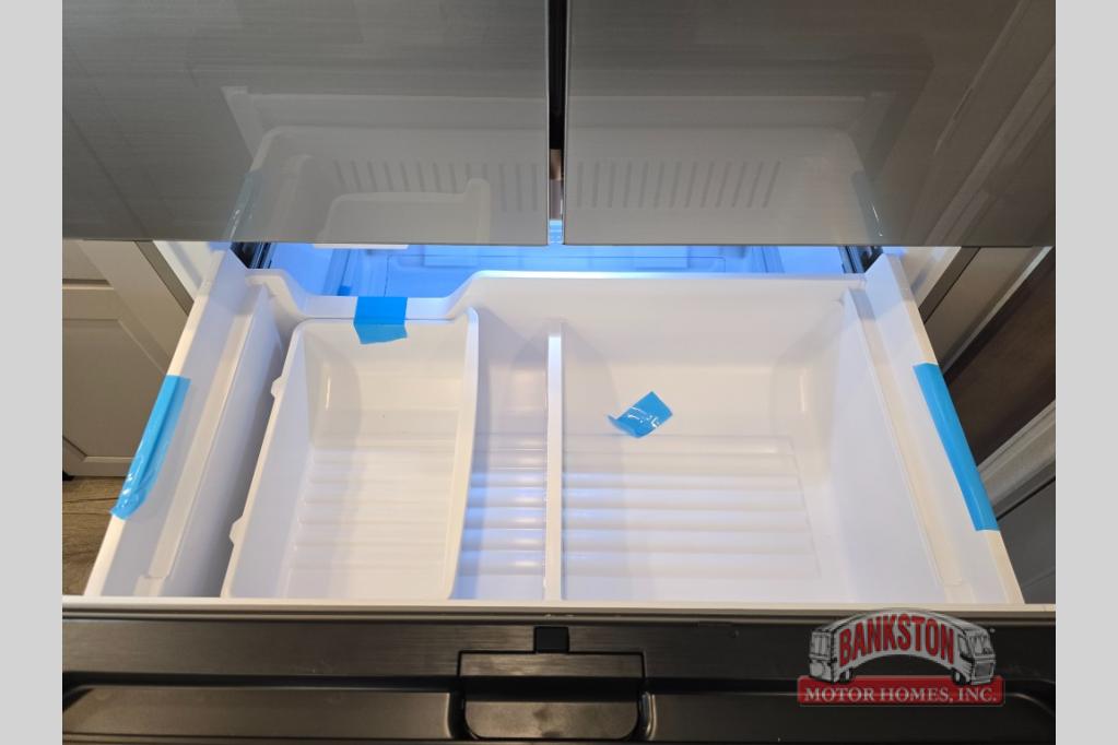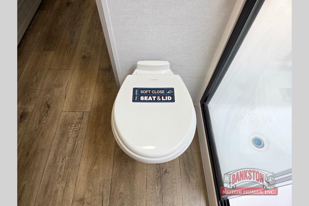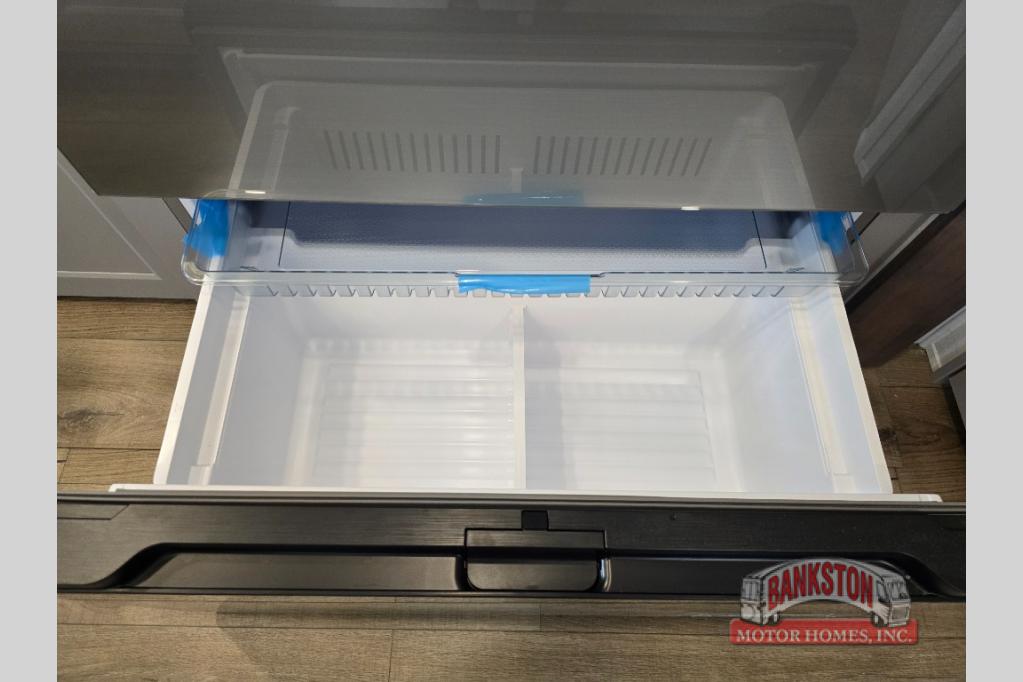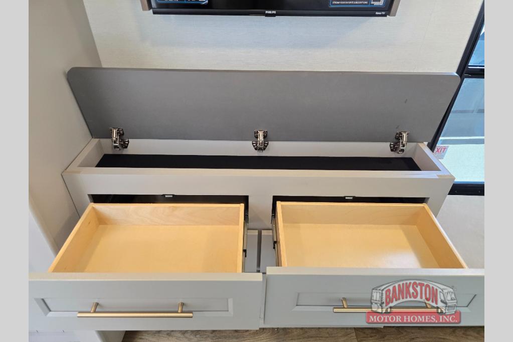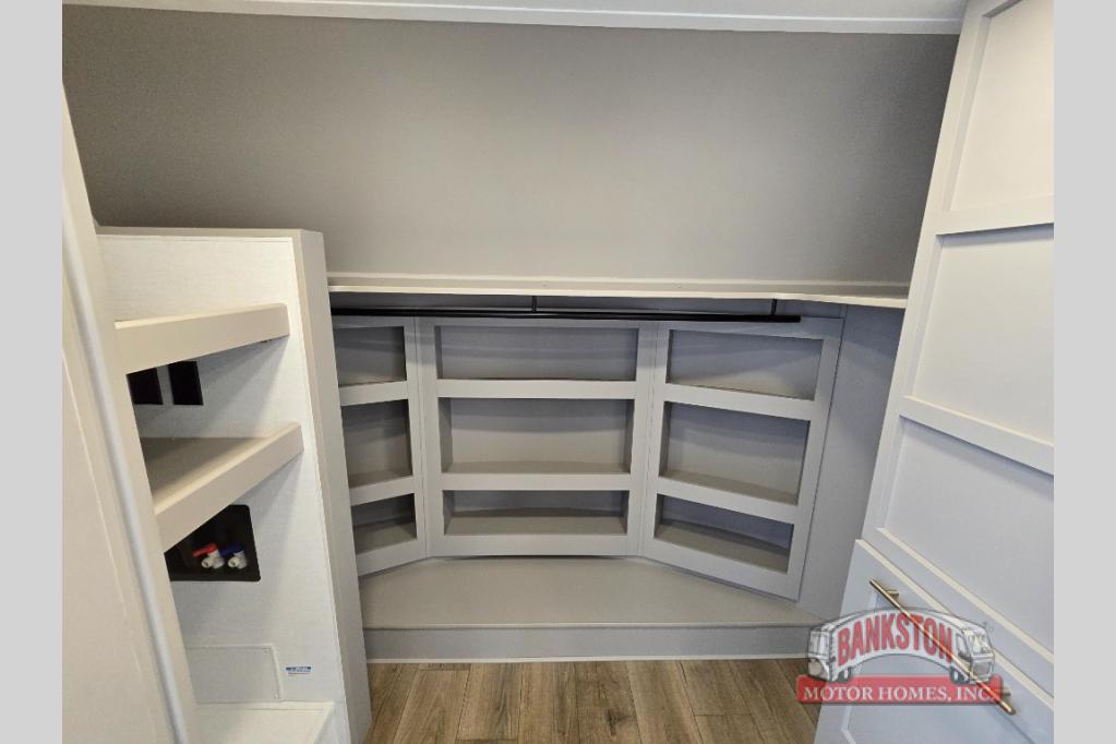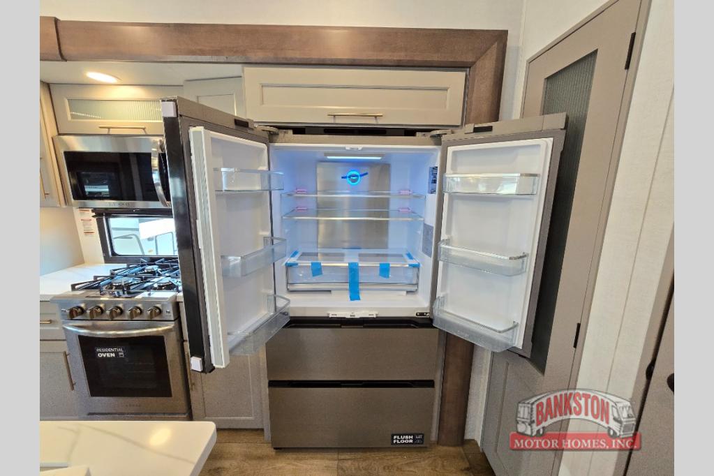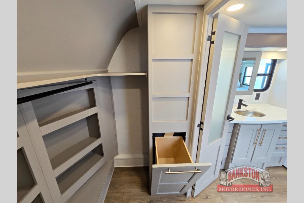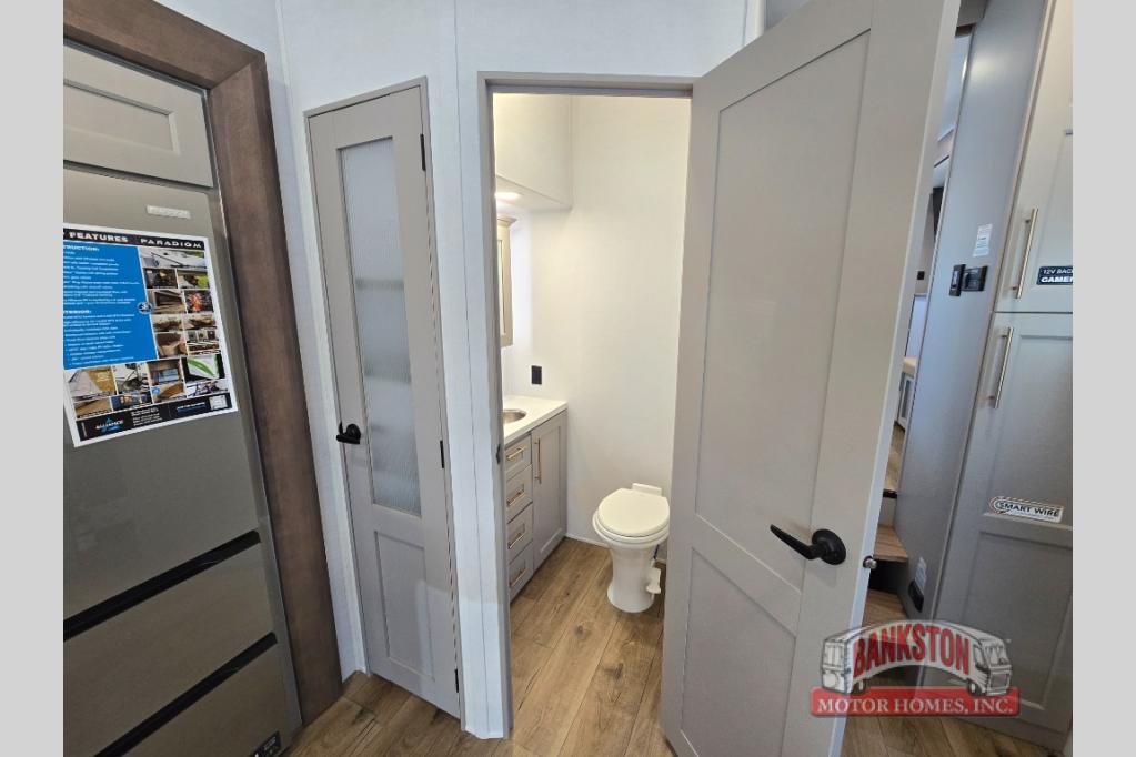 Whether you decide to be a full-timer or a long-trip traveler, this Paradigm offers so many comforts and conveniences you will love! The large full bathroom might be the reason you decide to be a new owner because you will have a large 61" x 30" shower to get cleaned up in, linen storage, and a walk-in closet with a hamper, shelves, and a space prepped for an optional washer/dryer. The bedroom allows you to sleep like a king and gives you extra floor space with the two slides, and there is storage in the flip-top dresser and under the seat, plus you can watch the Smart TV. The space saving sliding doors offer style as well. The cook will love all the residential appliances, including a residential refrigerator. The kitchen island gives you a large sink and dishwasher prep also. The half bath is super convenient just like the entry sitting bench/coat rack and closet. And you can relax on the sleeper sofa, dual recliner love seat, or swivel table and desk.