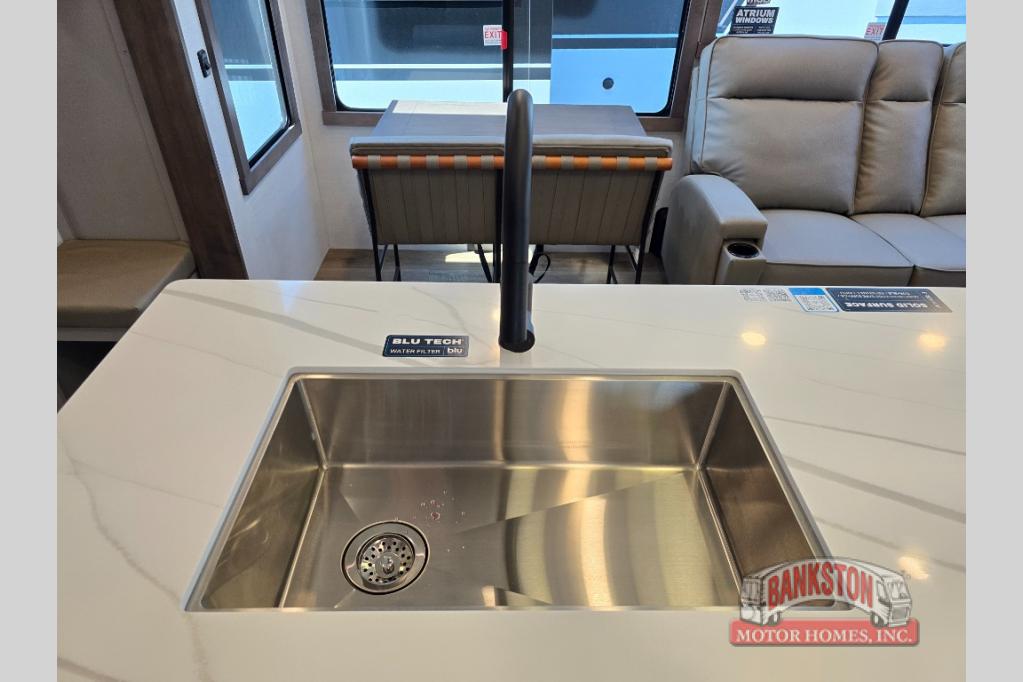 The Paradigm fifth wheels by Alliance RV are functional, high-quality, and luxurious for an unforgettable camping experience. There are three A/C units and a 40K BTU furnace to keep you comfortable year around, and you'll appreciate additional convenient amenities, like the all-in-one enclosed/heated utility center and the color coded and numbered wiring. A Helux Series coil spring pin box comes standard for hassle-free towing, along with Super-G 4,400 lb. rated tires and Dexter 7,000 lb. axles. You'll love the kitchen with its LG solid surface countertops and Lusso range, plus there is LED motion lighting in the pantry and a Maxx fan with a rain sensor to keep everything fresh when making dinner. Each model also includes an HD Smart TV in the living room and bedroom, plus a Winegard Air 360 antenna to keep you connected to the outside world. And of course there are a variety of options you can choose from to further customize your fifth wheel; dual pane windows, Super Solar Plus, slide out awning toppers, and generator prep or a generator to name a few!