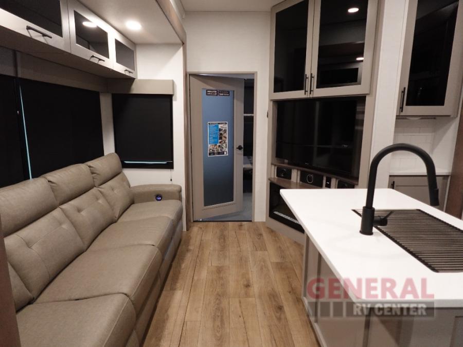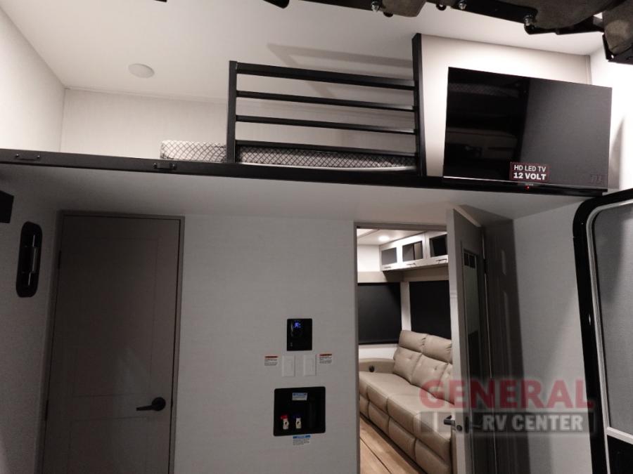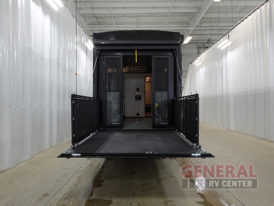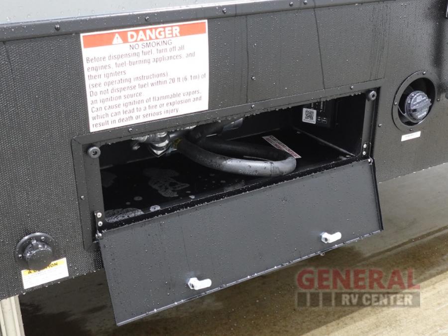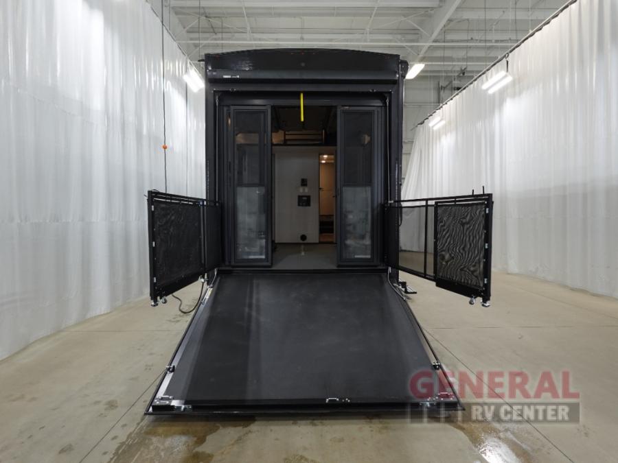 The whole family will have a fun time camping in this toy hauler! You can easily load up your toys into the 11' garage area with the 8' weather resistant ramp door and keep them filled with the dual 30 gallon fuel tanks. Once you unload your toys from the garage area, you can set up the opposing HappiJac sofas with a queen mattress above them, the loft that opens to the living room, and the half bathroom. The kitchen has everything you need to prepare your best meals including two hutches, three pantries, and a kitchen island with two bar stools to enjoy your morning coffee and eggs. The dual entry bathroom has a 48" x 30" shower and leads directly into the front private bedroom. Inside the bedroom is a king bed slide for more floor space, a flip top dresser, and a front wardrobe with washer and dryer prep!