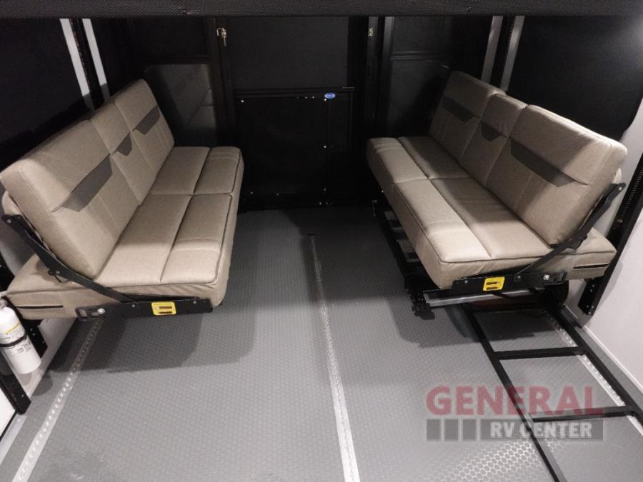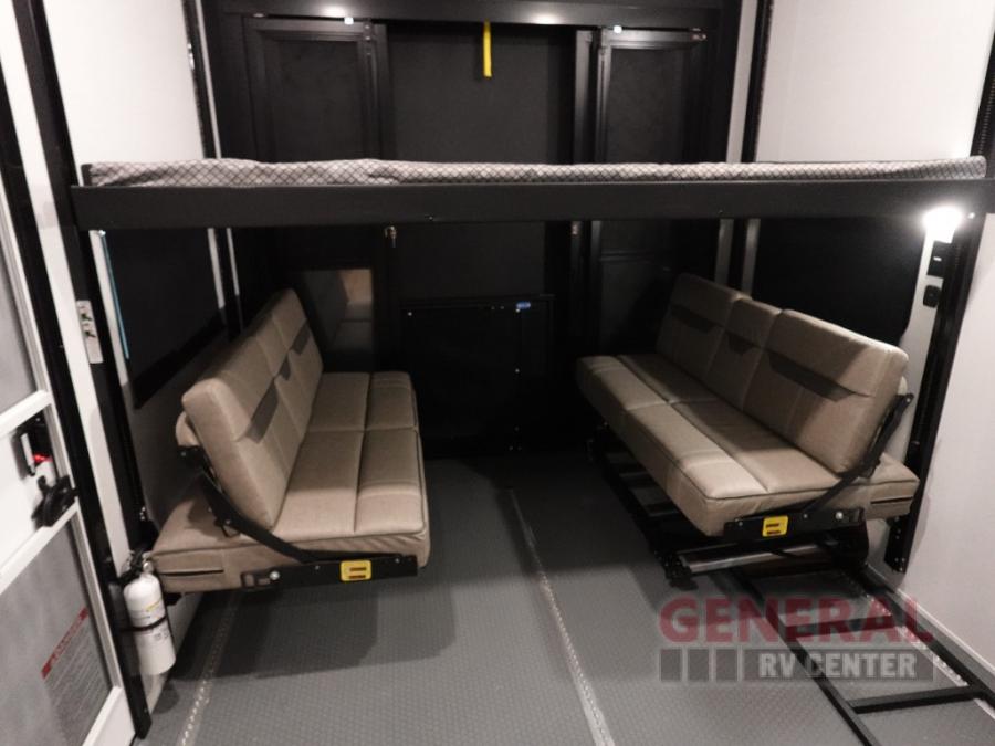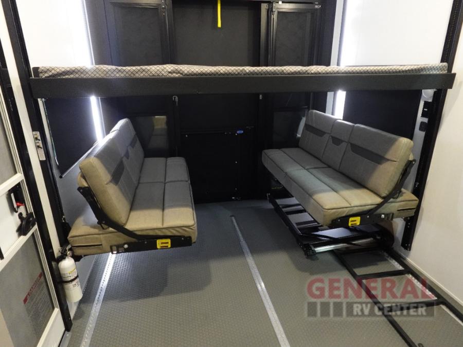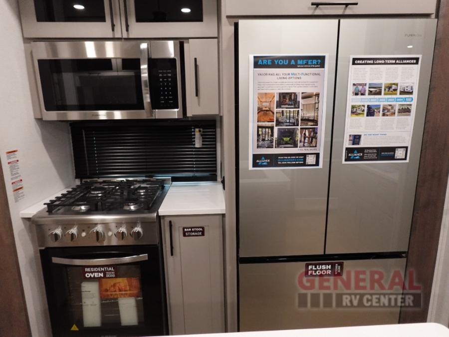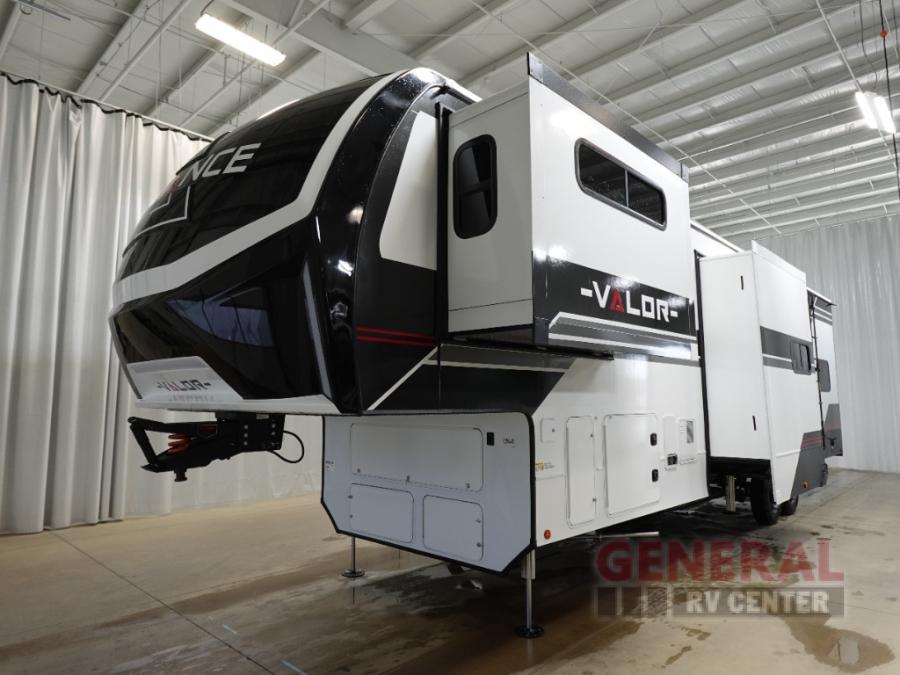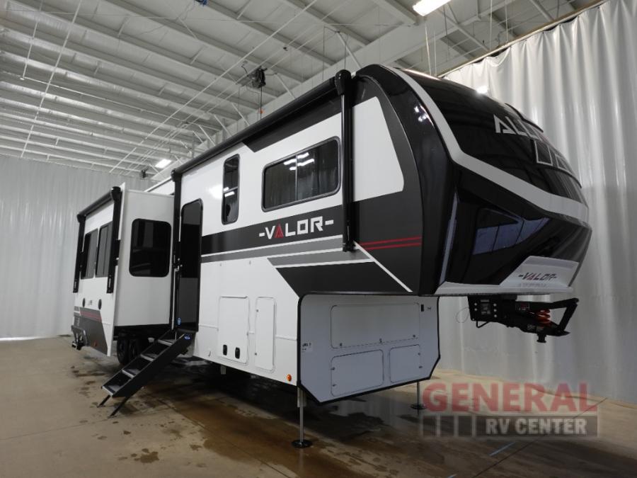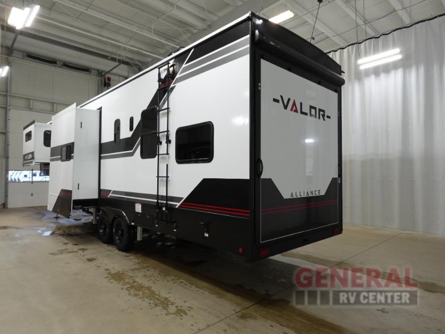 You can bring your toys with you wherever you go with any one of these Alliance RV Valor toy hauler fifth wheels! They are adventure-ready with a quality build from the walk on roof with seamless PVC roof covering to the commercial grade vinyl flooring and MorRyde CRE3000 suspension system. The Performance Running Gear package comes with a 101" wide-body benchmark chassis platform, 7,000 lb. Dexter axles, and a space enhancing drop frame storage compartment to pack in all your riding gear. You can even go off-gridding thanks to the Off the Grid Pack that has two 400 watt solar panels, generator prep, a 40 amp charge controller, and a 100 amp hour lithium iron phosphate battery. Some of the interior comforts you will enjoy are the hardwood cabinet doors and drawers, solid surface kitchen countertops, and commercial grade vinyl flooring with no carpet to make clean up a breeze. The Valor toy haulers are also the Masters of 12 Volt with USB charging station throughout, a stainless steel refrigerator, and more 12 volt features to make camping hassle-free!