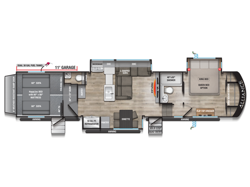 The 2026 Alliance Valor 37V11 is a luxury fifth wheel toy hauler built for RVers who want high-performance hauling capability without sacrificing residential comfort. With a fully enclosed 11-foot garage, dual fuel tanks, and a feature-rich interior, this model is perfect for both weekend warriors and full-time travelers seeking the ultimate in flexibility and style.