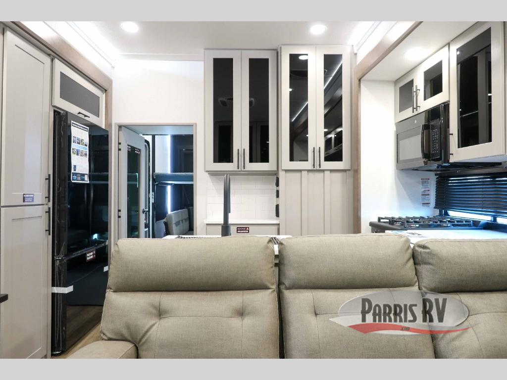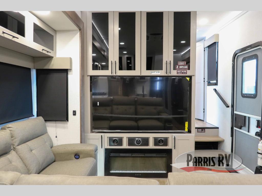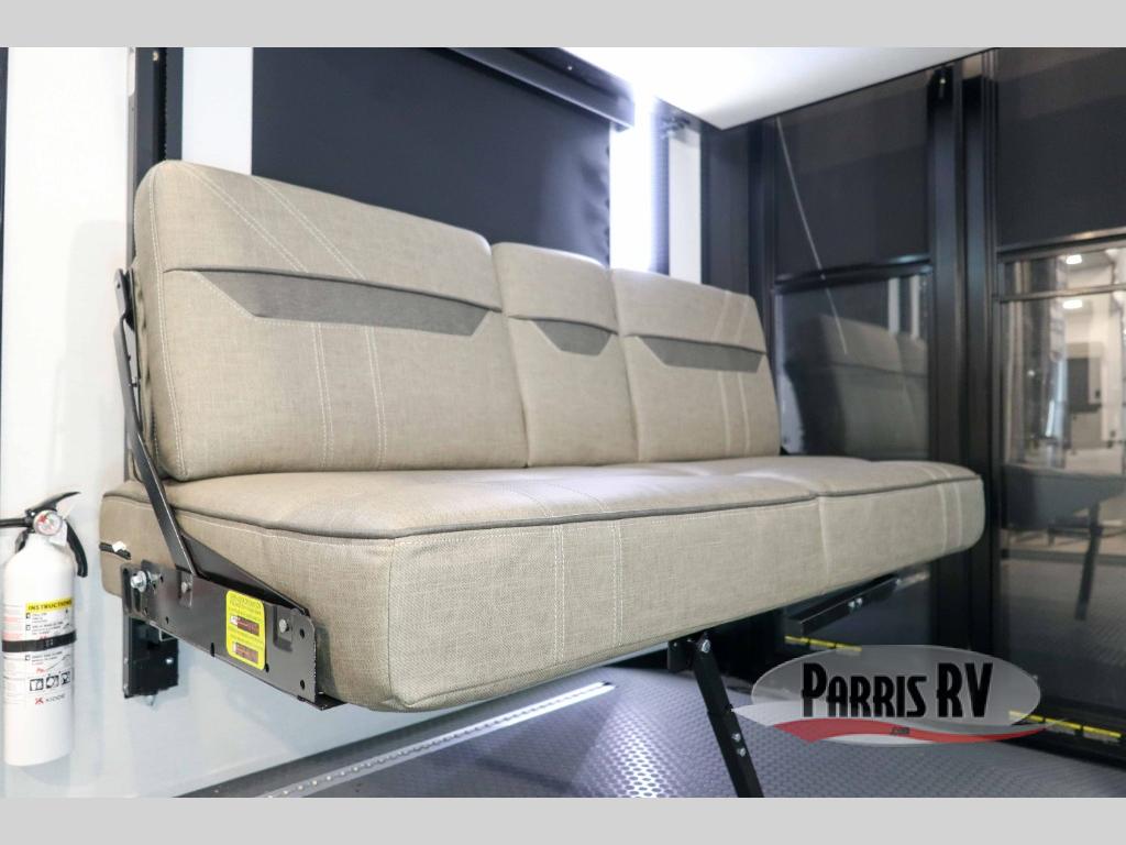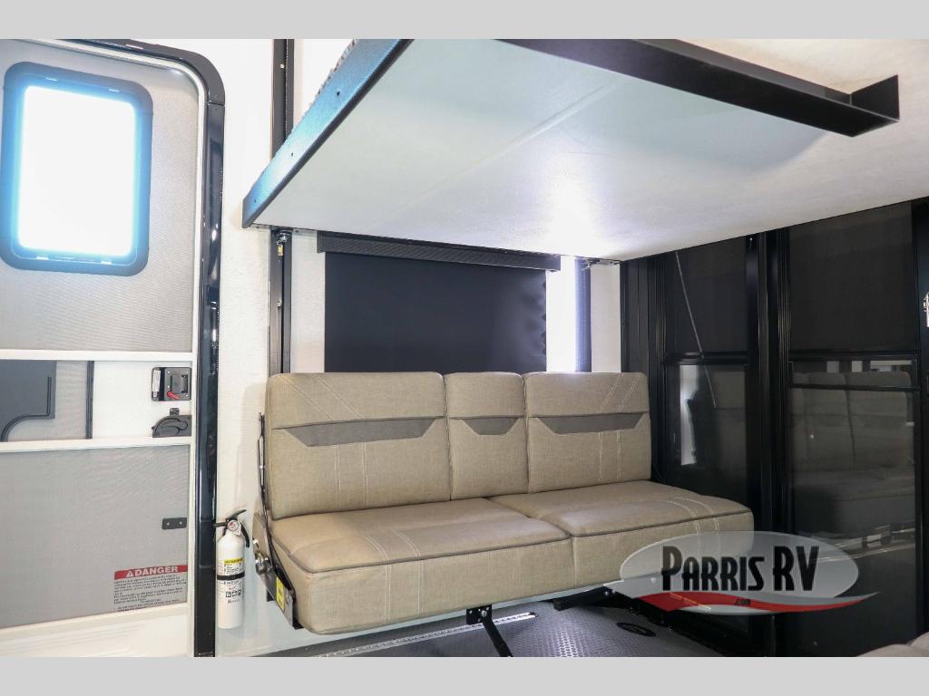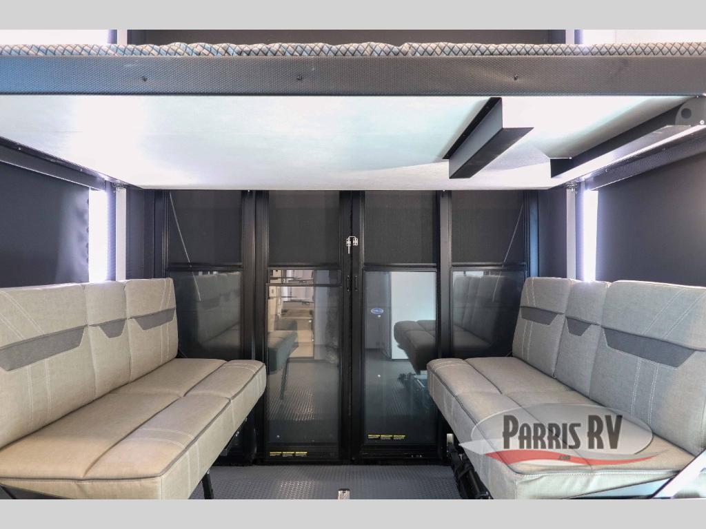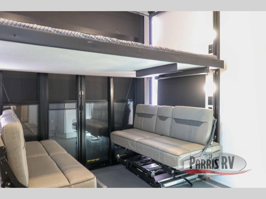 This spacious toy hauler will be perfect for weekend trips to the lake or woods! Once you've unloaded your toys from the 11' separate garage, you can relax on the 60" dual opposing sofas or set up the HappiJac bed for guests if it's getting late. There is also a 30" x 72" bunk/loft bed above the garage, a 40" garage TV, and a half bath for added convenience. As you head into the kitchen area, you'll find ample counter space to prep meals, along with a buffet, a spacious pantry and a 12V refrigerator for perishables. You can dine together at the dinette with chairs, then head to the L-shaped sofa across from the fireplace and 65" TV for movie night. The full bath includes an entrance from the hallway and into the front master bedroom. Here, you'll enjoy a king bed slide out, a flip-up dresser with a 32" TV, plus a front wardrobe with washer and dryer prep if you plan to go full-time!