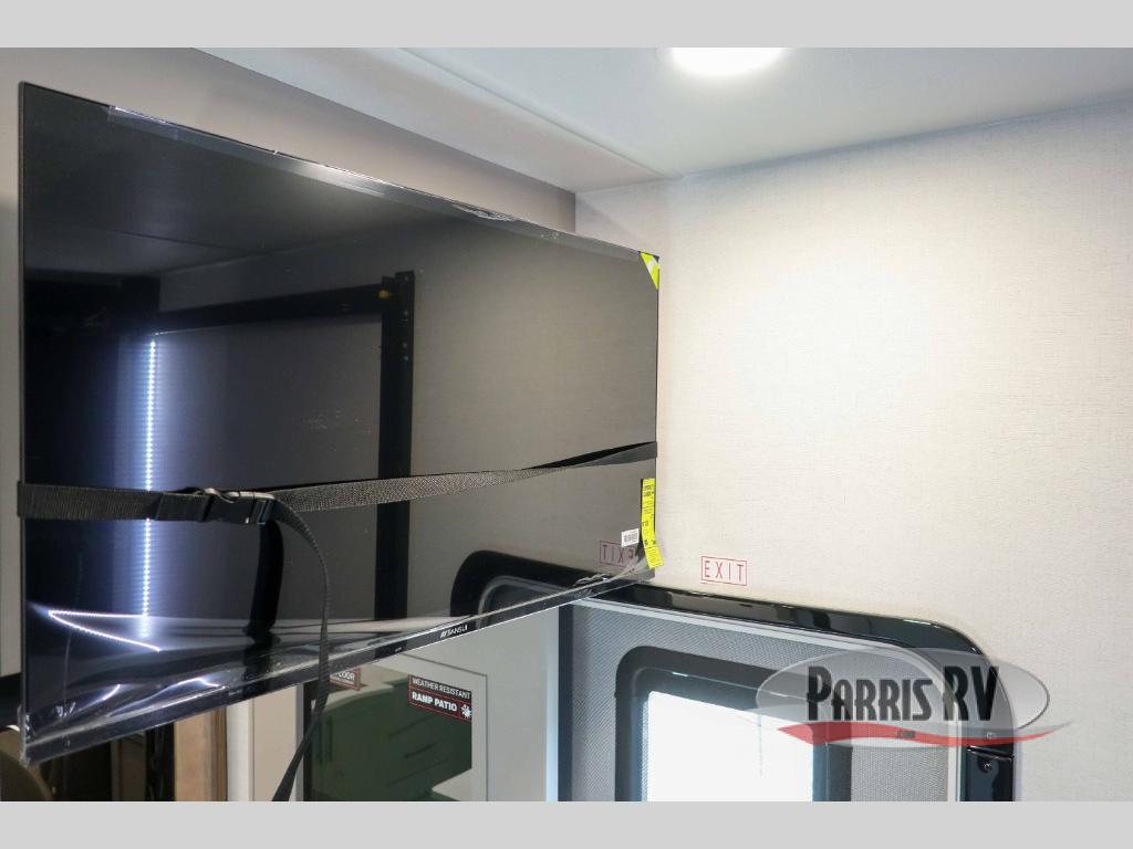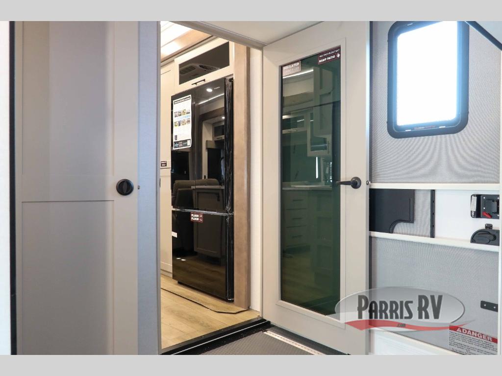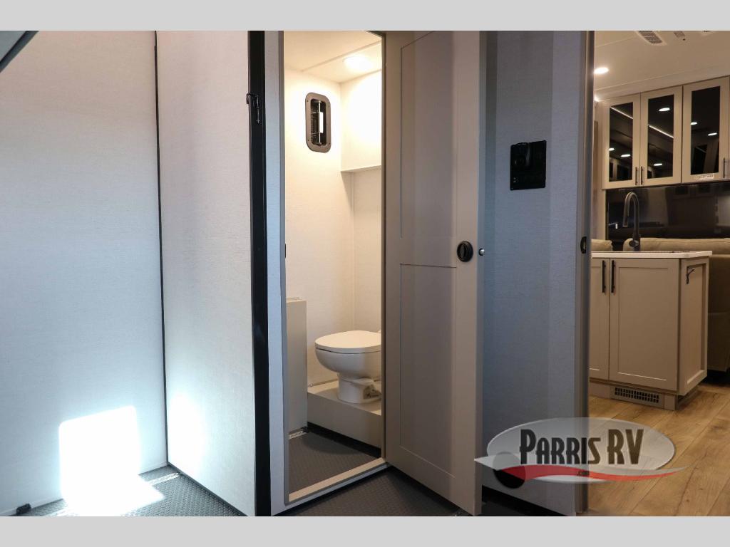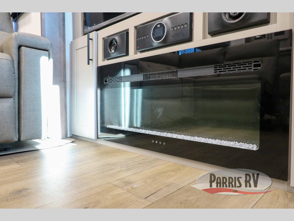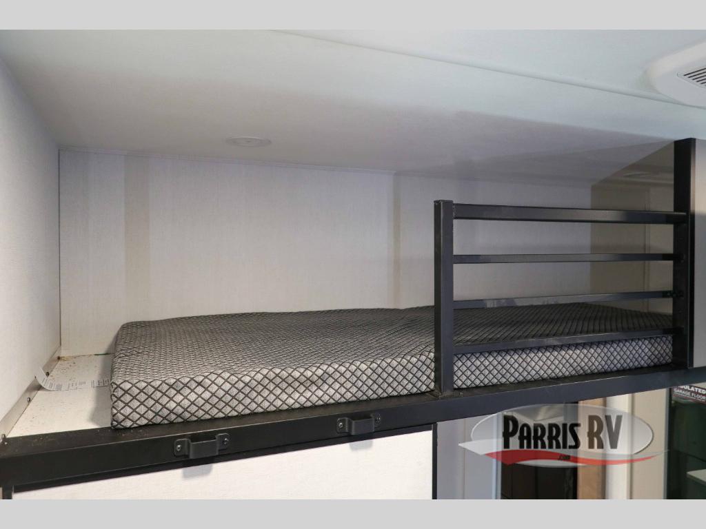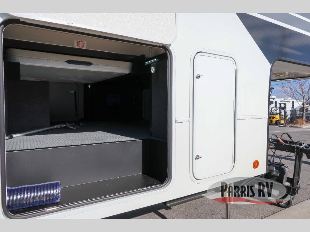 This spacious toy hauler will be perfect for weekend trips to the lake or woods! Once you've unloaded your toys from the 11' separate garage, you can relax on the 60" dual opposing sofas or set up the HappiJac bed for guests if it's getting late. There is also a 30" x 72" bunk/loft bed above the garage, a 40" garage TV, and a half bath for added convenience. As you head into the kitchen area, you'll find ample counter space to prep meals, along with a buffet, a spacious pantry and a 12V refrigerator for perishables. You can dine together at the dinette with chairs, then head to the L-shaped sofa across from the fireplace and 65" TV for movie night. The full bath includes an entrance from the hallway and into the front master bedroom. Here, you'll enjoy a king bed slide out, a flip-up dresser with a 32" TV, plus a front wardrobe with washer and dryer prep if you plan to go full-time!