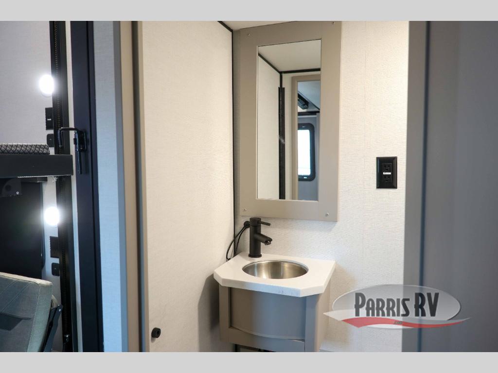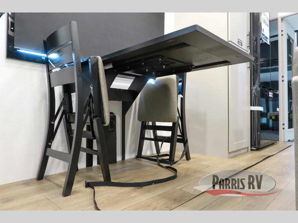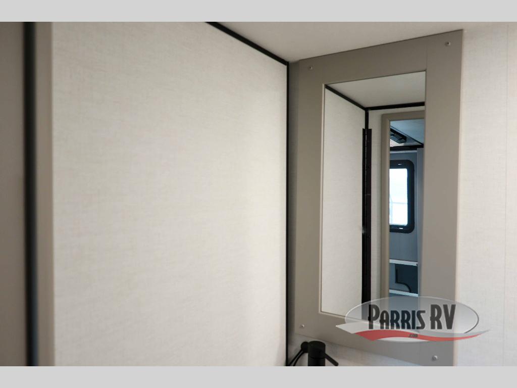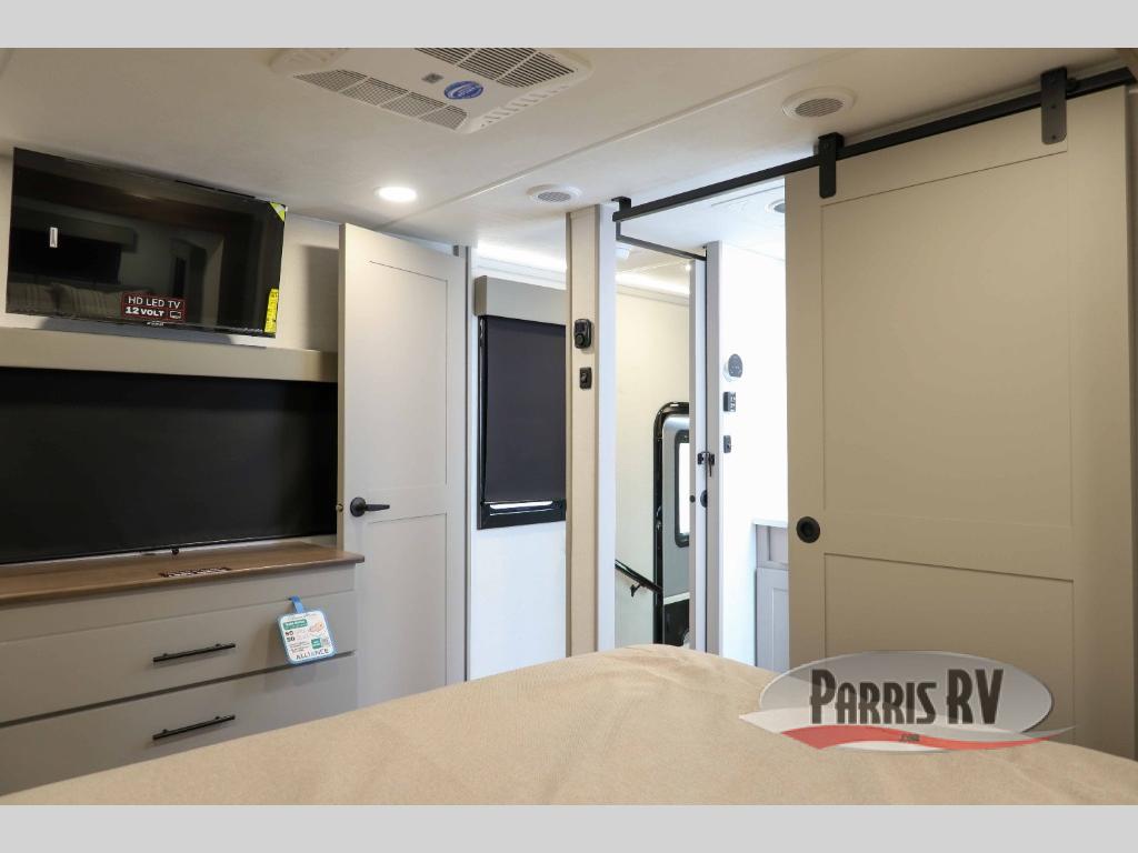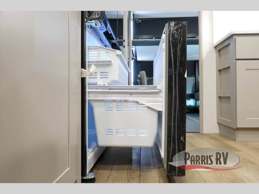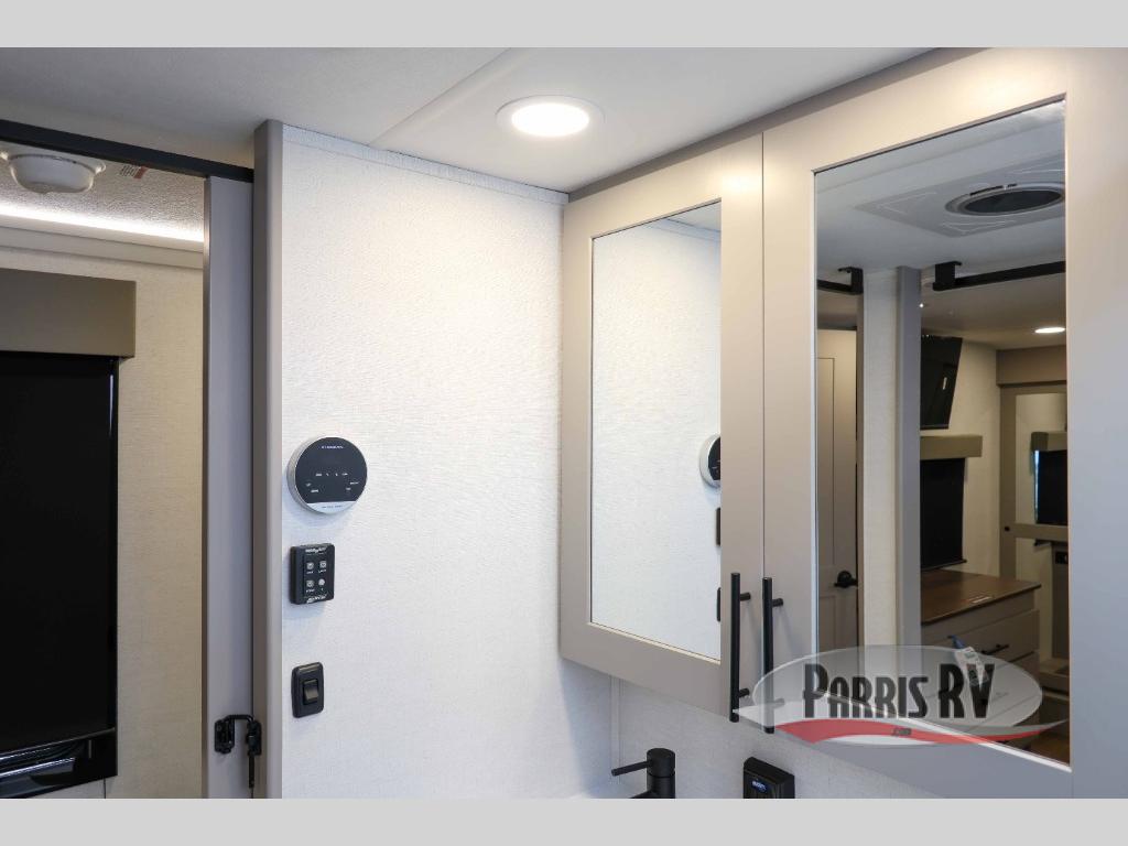 This spacious toy hauler will be perfect for weekend trips to the lake or woods! Once you've unloaded your toys from the 11' separate garage, you can relax on the 60" dual opposing sofas or set up the HappiJac bed for guests if it's getting late. There is also a 30" x 72" bunk/loft bed above the garage, a 40" garage TV, and a half bath for added convenience. As you head into the kitchen area, you'll find ample counter space to prep meals, along with a buffet, a spacious pantry and a 12V refrigerator for perishables. You can dine together at the dinette with chairs, then head to the L-shaped sofa across from the fireplace and 65" TV for movie night. The full bath includes an entrance from the hallway and into the front master bedroom. Here, you'll enjoy a king bed slide out, a flip-up dresser with a 32" TV, plus a front wardrobe with washer and dryer prep if you plan to go full-time!