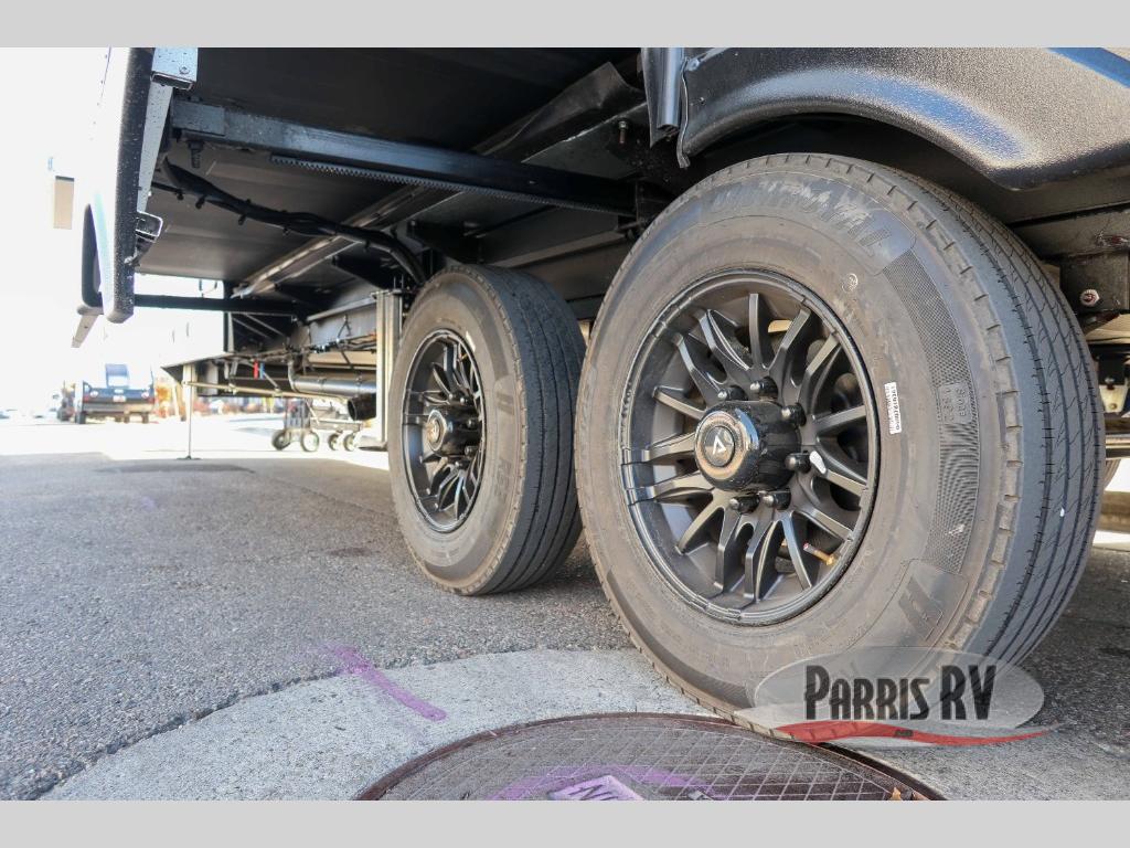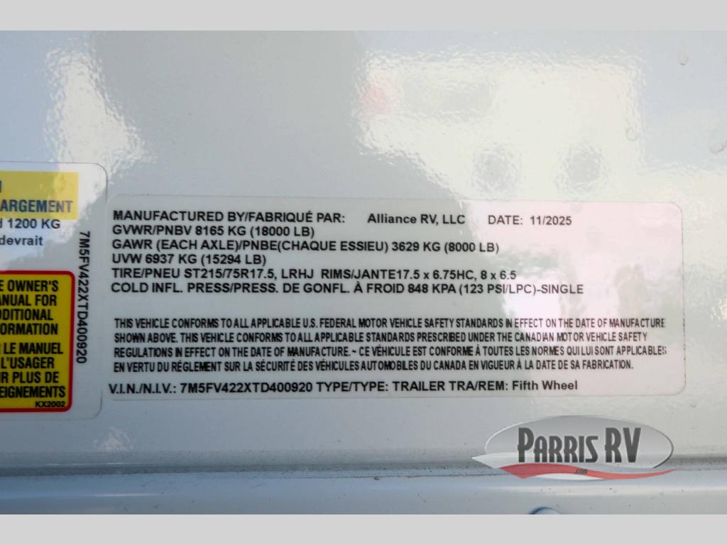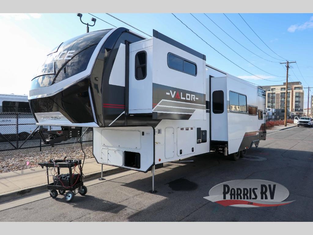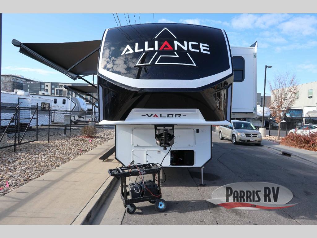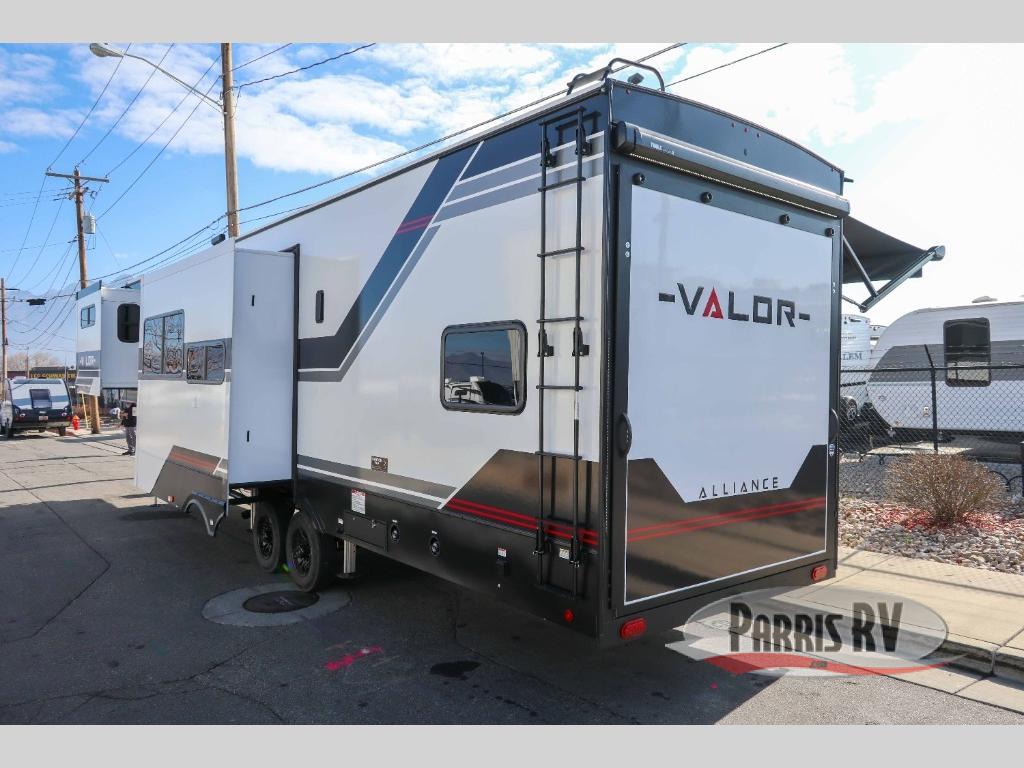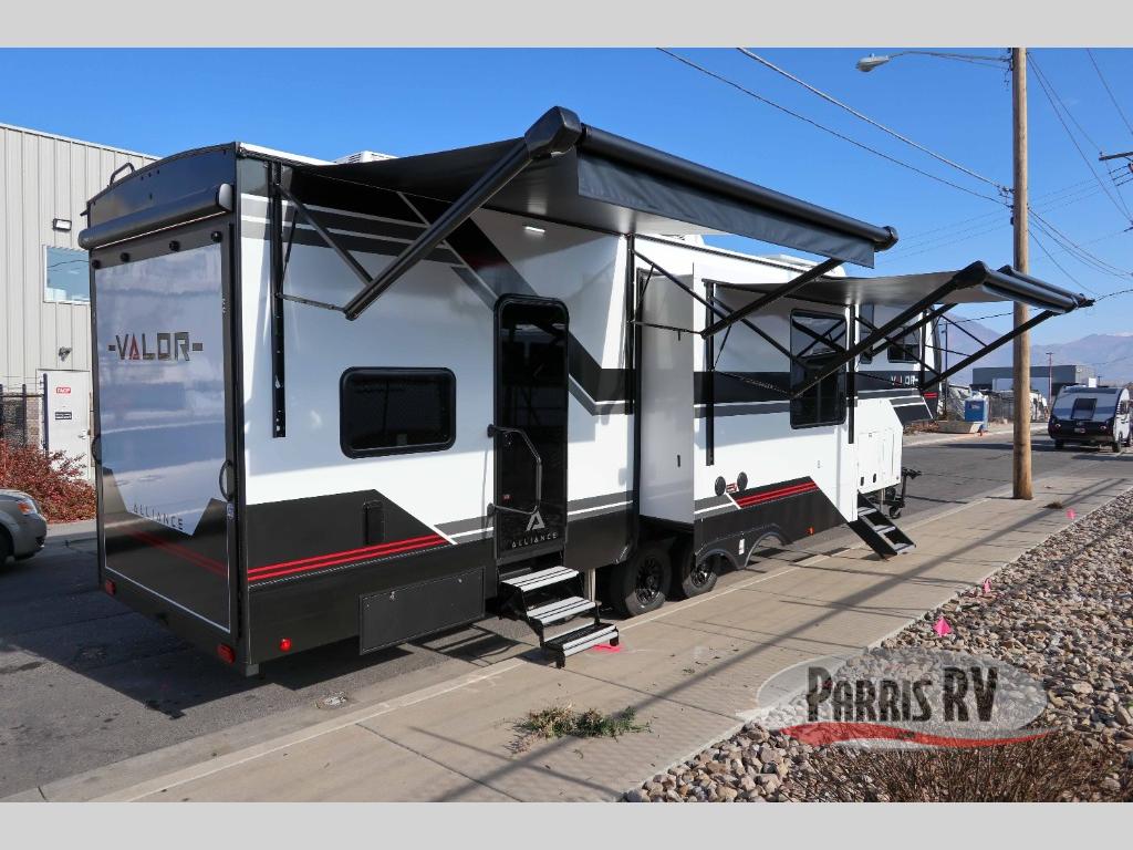 You can bring your toys with you wherever you go with any one of these Alliance RV Valor toy hauler fifth wheels! They are adventure-ready with a quality build from the walk on roof with seamless PVC roof covering to the commercial grade vinyl flooring and MorRyde CRE3000 suspension system. The Performance Running Gear package comes with a 101" wide-body benchmark chassis platform, Dexter axles, and a space enhancing drop frame storage compartment to pack in all your riding gear. You can even go off-gridding thanks to the Off the Grid Pack that has two 400-watt solar panels, generator prep, a 60-amp charge controller, and a 100-amp hour lithium iron phosphate battery. Some of the interior comforts you will enjoy are the hardwood cabinet doors and drawers, solid surface kitchen countertops, and commercial grade vinyl flooring with no carpet to make clean up a breeze. The Valor toy haulers are also the Masters of 12 Volt with USB charging station throughout, a 12V refrigerator, and more 12-volt features to make camping hassle-free!