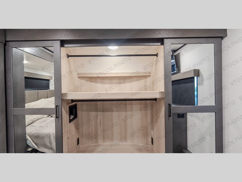 You can easily load up your toys into the 16' garage area of this toy hauler with the 8' weather resistant ramp door and keep them filled with the dual 30 gallon fuel tanks! Once you unload your toys from the garage area, you can set up the opposing HappiJac sofas with a queen mattress above them, the loft that opens to the garage, and the half bathroom. The kitchen has everything you need to prepare your best meals including two hutches, three pantries, and a kitchen island with two bar stools to enjoy your morning coffee and eggs. The dual entry bathroom has a 48" x 30" shower and leads directly into the front private bedroom. Inside the bedroom, a king bed slide allows for more floor space. There is also a flip top dresser, and a front wardrobe with washer and dryer prep.