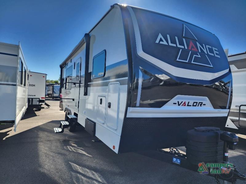 With any Valor All-Access toy hauler by Alliance RV, you will be getting a travel trailer or fifth wheel with exceptional features at a great value! There is a painted fiberglass front cap, Mylar reinforced exterior seals, Azdel-backed fiberglass sidewalls, and a walk-on roof with a seamless PVC roof covering for added strength and durability. The 101" wide-body Benchmark chassis means you can bring along your larger toys, and the multipoint tie-down system will keep your toys safe and secure on the way to the campground. All of your power needs will be met with the Masters of 12 Volt Package that includes a 12V JBL sound system and USB charging stations throughout, plus the Off the Grid Pack comes with a 400-watt solar panel, 30-amp charge controller, and generator prep to keep you going all week long. Some of the interior comforts you'll enjoy are commercial grade vinyl flooring with no carpet so you can easily clean up, black cabinetry hardware, residential LED recessed ceiling lights, and so much more!
