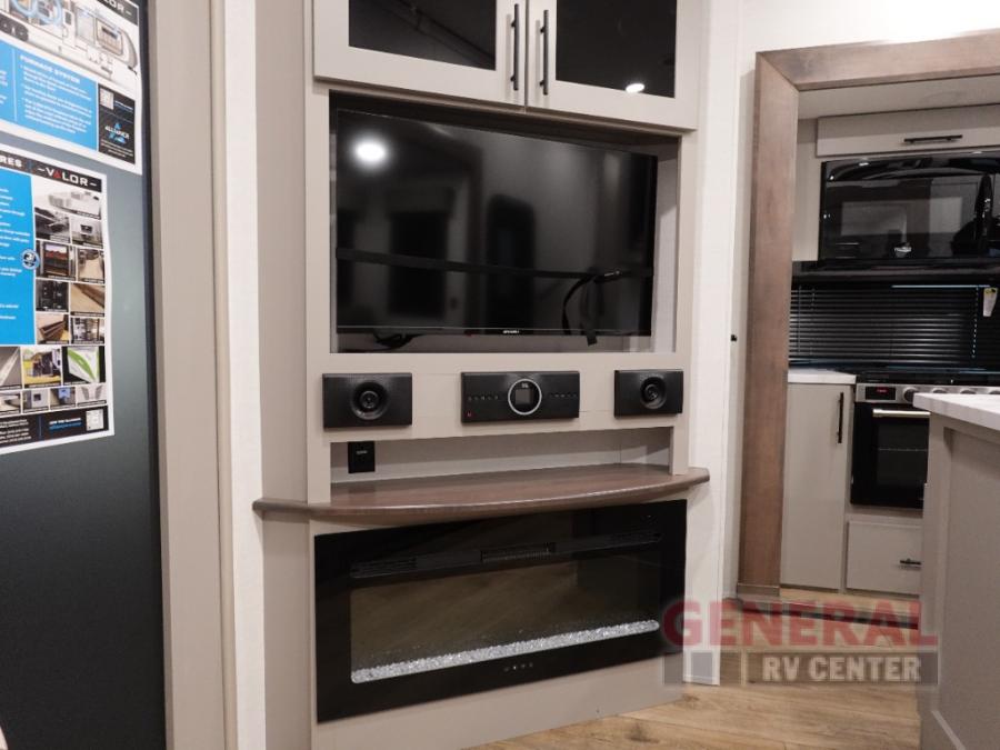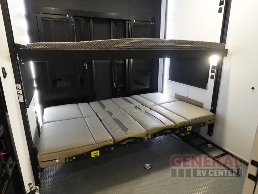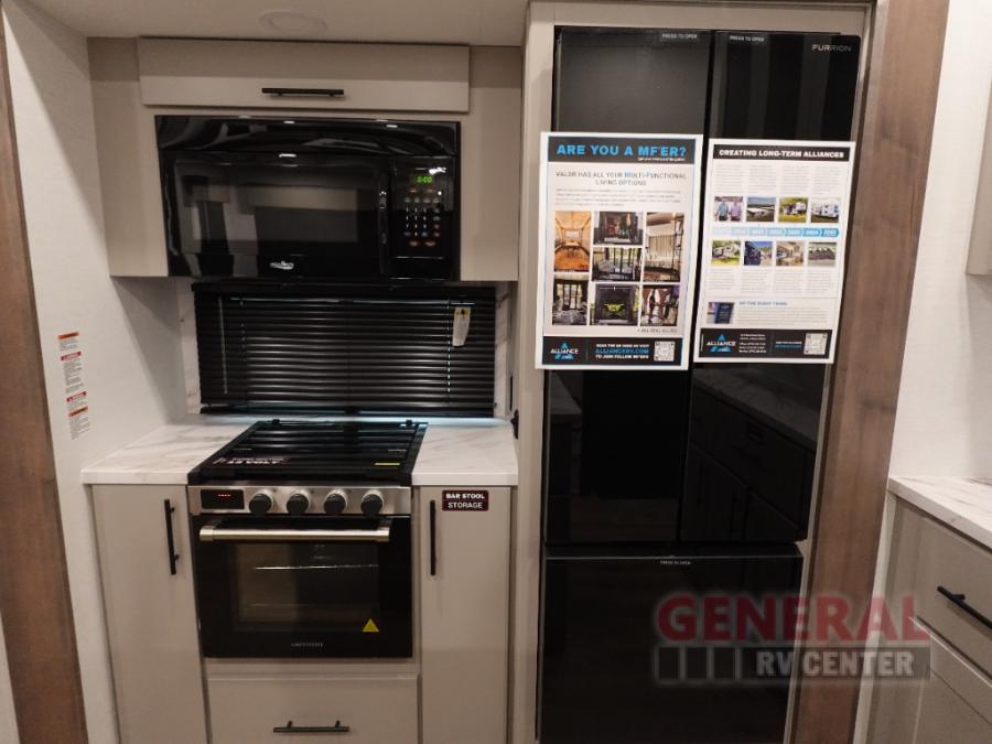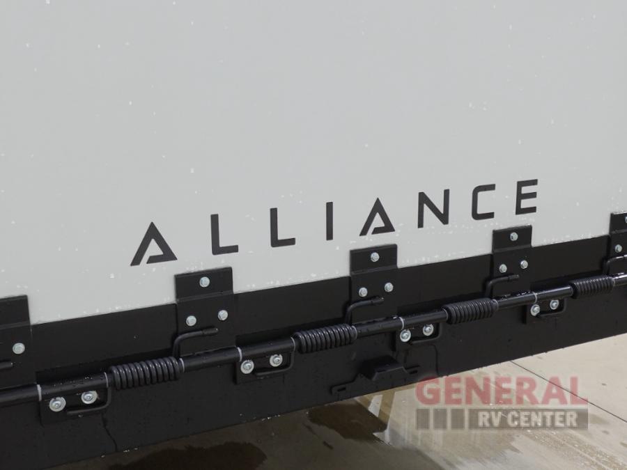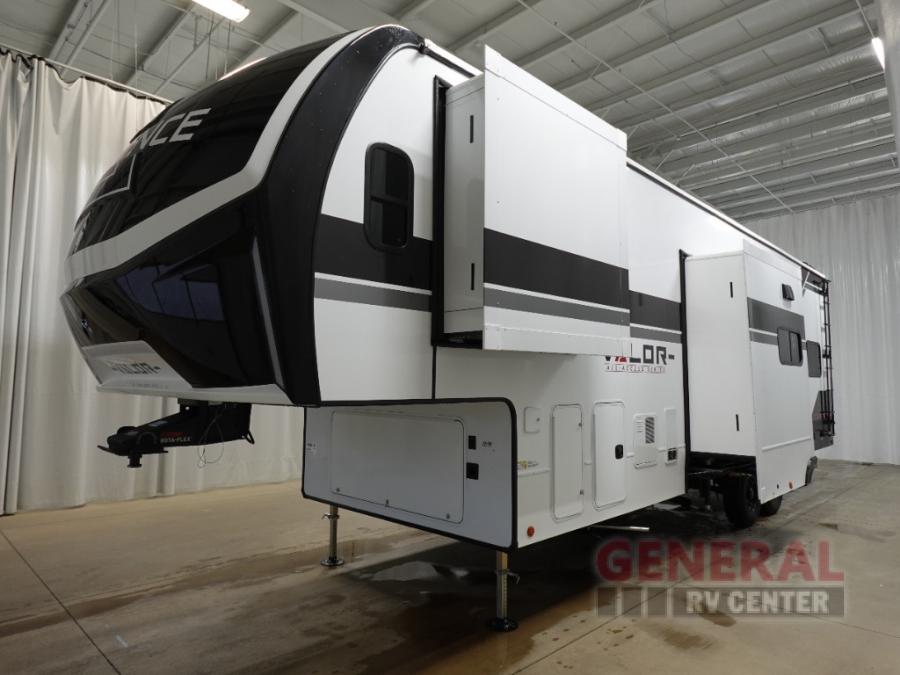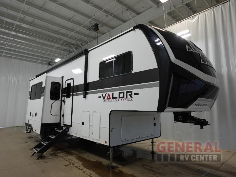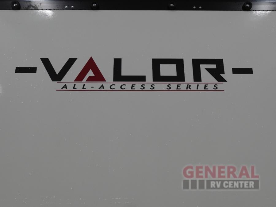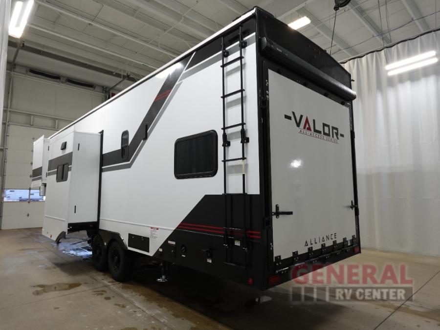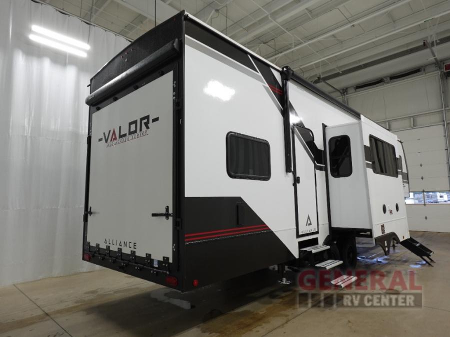 With any Valor All-Access toy hauler by Alliance RV you will be getting a travel trailer or fifth wheel with exceptional features at a great value! There is a painted fiberglass front cap, Mylar reinforced exterior seals, Azdel-backed fiberglass sidewalls, and a walk-on roof with a seamless PVC roof covering for added strength and durability. The 101" wide-body Benchmark chassis means you can bring along your larger toys, and the multipoint tie-down system will keep your toys safe and secure on the way to the campground. All of your power needs will be met with the Masters of 12 Volt Package that includes a 12V JBL sound system and USB charging stations throughout, plus the Off The Grid Pack comes with a 400 watt solar panel, 40 amp charge controller, and generator prep to keep you going all week long. Some of the interior comforts you'll enjoy are commercial grade vinyl flooring with no carpet so you can easily clean up, black cabinetry hardware, residential LED recessed ceiling lights, and so much more!