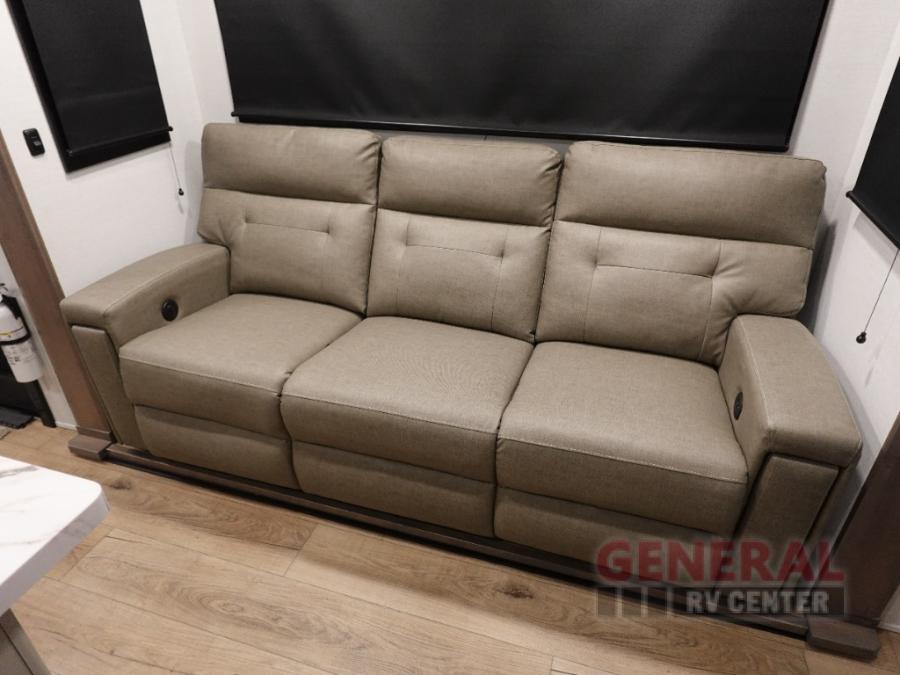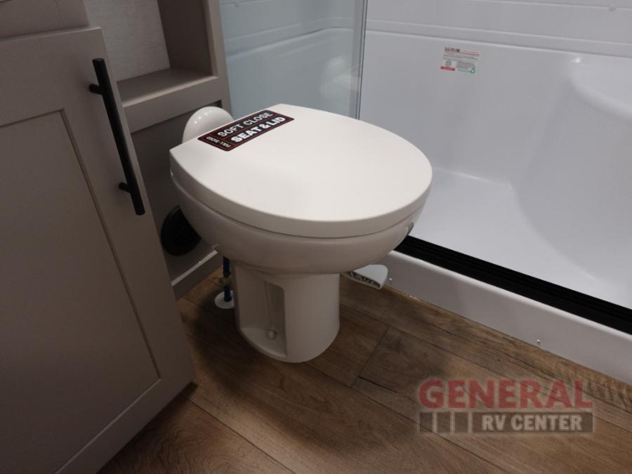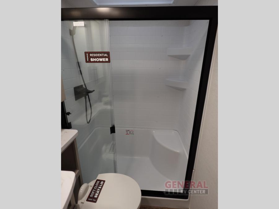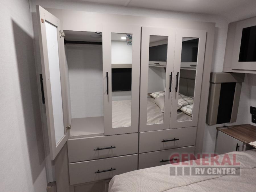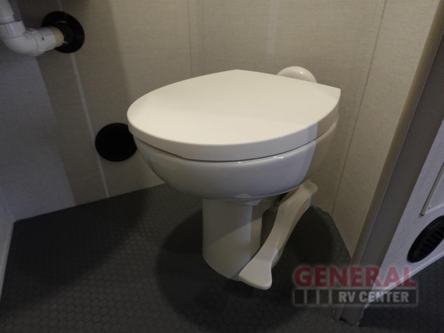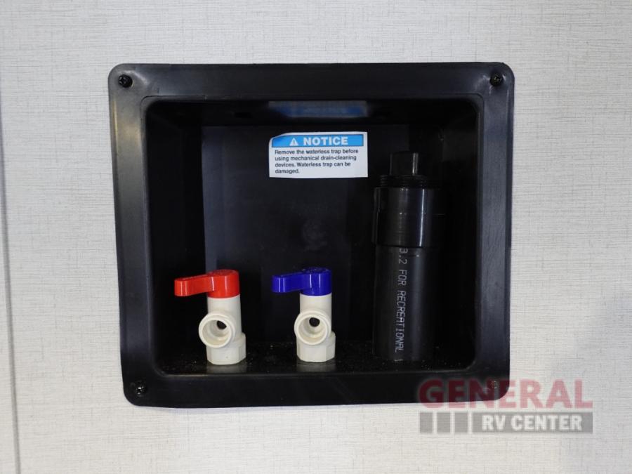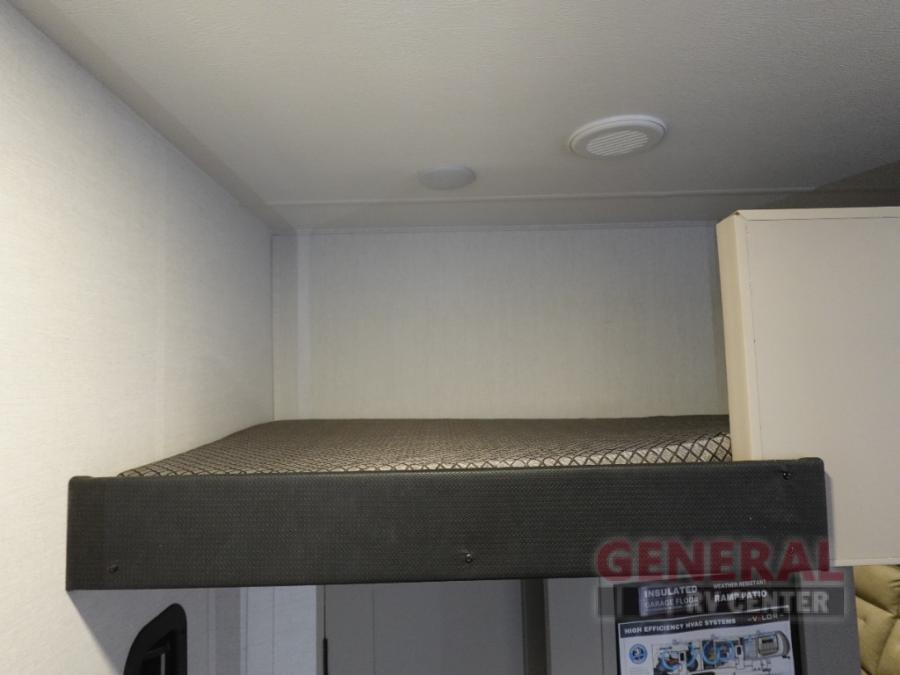 Load up the dirt bikes, pack your bags, and head to the campground in this spacious toy hauler. Once your toys are unloaded using the weather resistant ramp door, relax on the HappiJac roll-over sofas with a folding table in between, and this area can become your guests' bedroom at night since there is a drop-down queen bed, a half bath, plus an additional 30" x 72" bunk/loft bed. You will have the front bedroom all to yourselves that includes a king bed plus a wardrobe slide out to keep your space tidy. Everyone can meet in the main living area/kitchen for movie night with the HDTV and sofa slide out, while the chef of makes dinner on the three burner cooktop. There is also a hutch and pantry for storage and a kitchen island for more counter space!