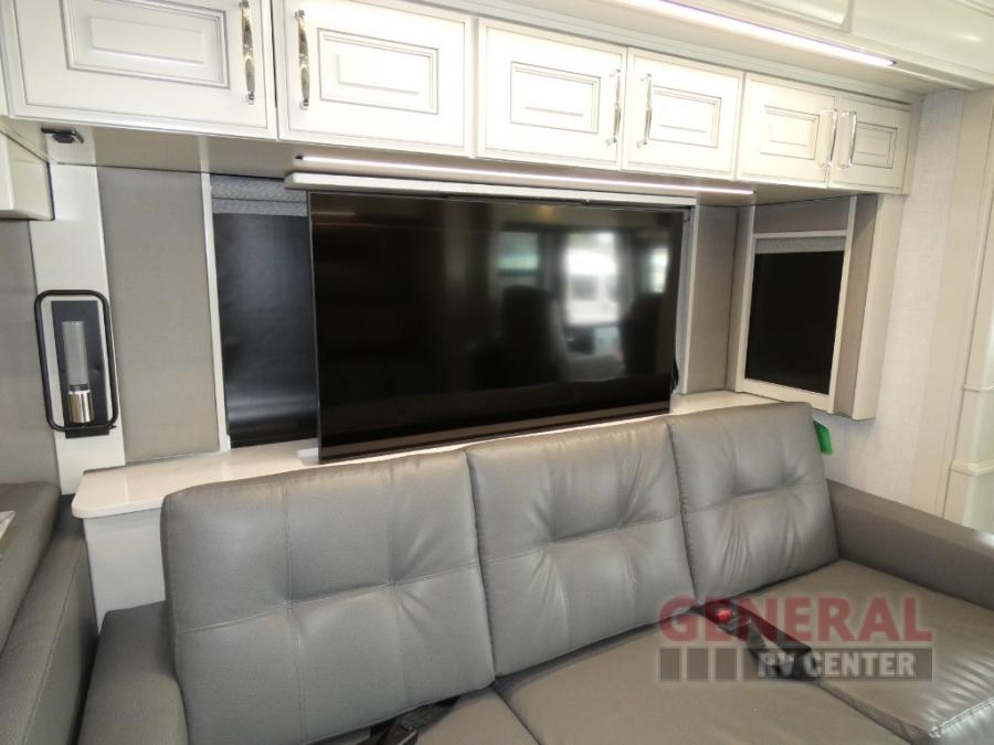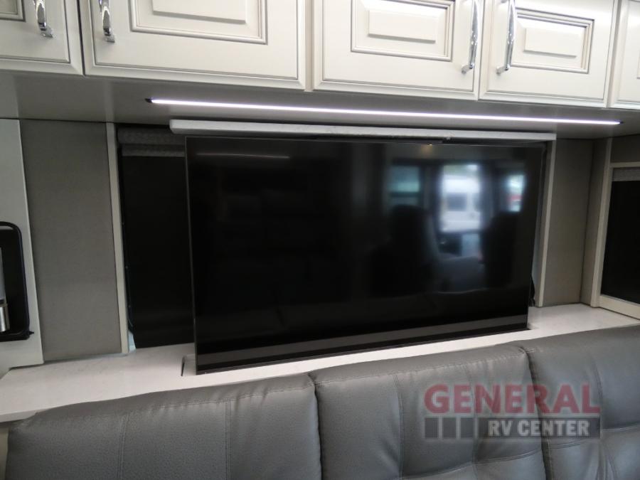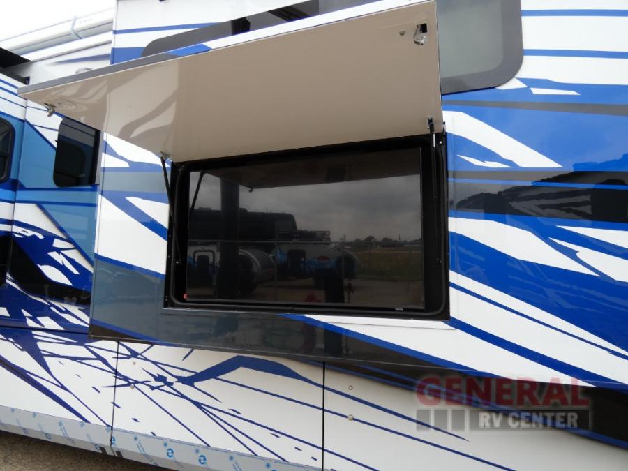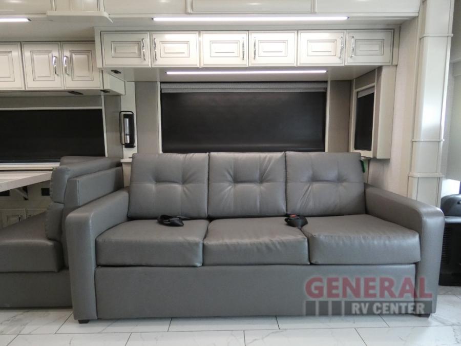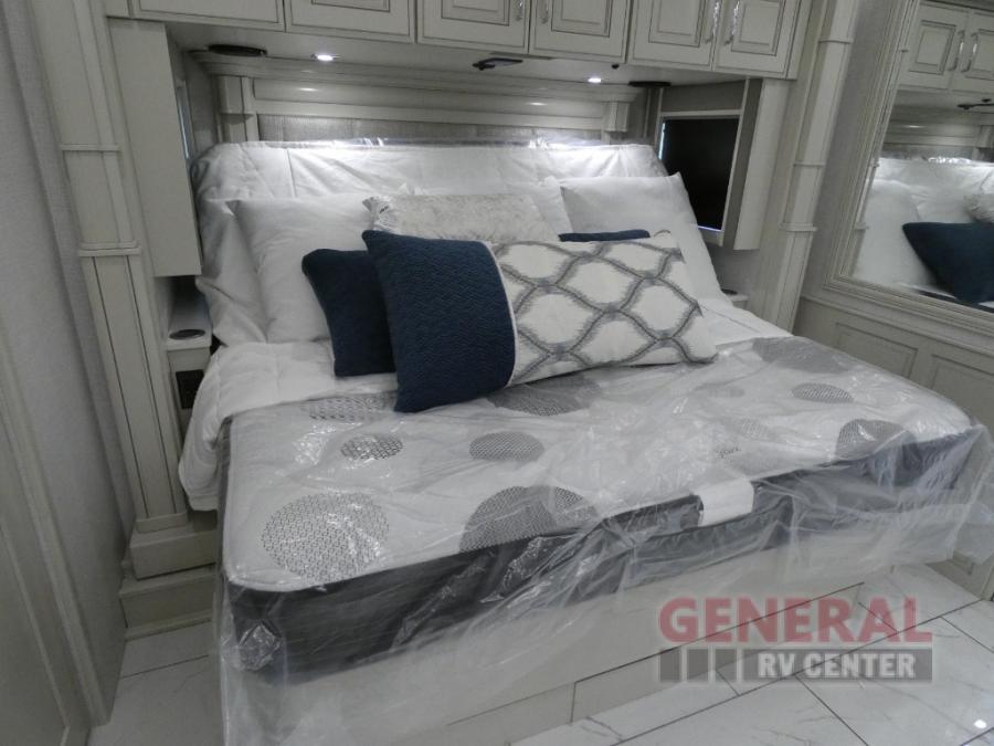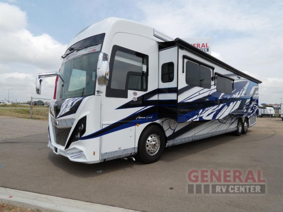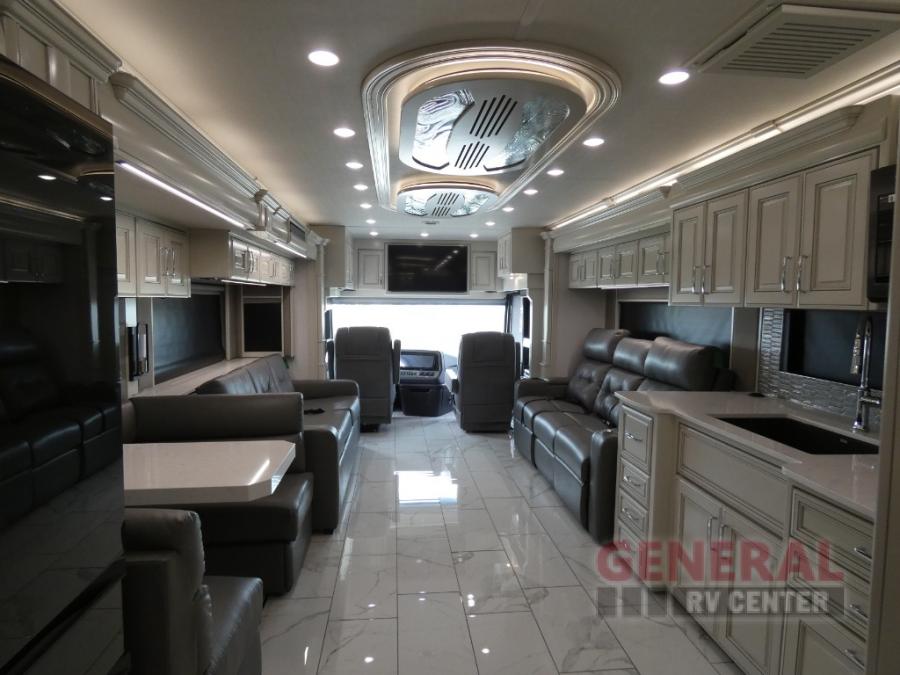 Hit the road with confidence in any one of these American Coach American Dream Class A diesel motorhomes with their Freightliner Custom Chassis and Cummins diesel engine! You will travel stress free thanks to the RoadWatch safety system that comes with collision mitigation, adaptive cruise, and electronic stability, automatic traction, and roll stability control. You'll appreciate the Aqua View Showermiser fresh water reclamation system, along with the Aqua-Hot 450D water heating system, 12.5kW Onan generator, and many more convenient utilities. The interior includes beautiful Quartz kitchen countertops, porcelain tile flooring, hardwood cabinet doors, and spacious wardrobes so nothing gets left behind. Head outdoors to find a roof-mounted electric awning with LED lighting, side-swing aluminum bus-style luggage doors, automatic leveling jacks, and carriage lighting to name a few conveniences.
