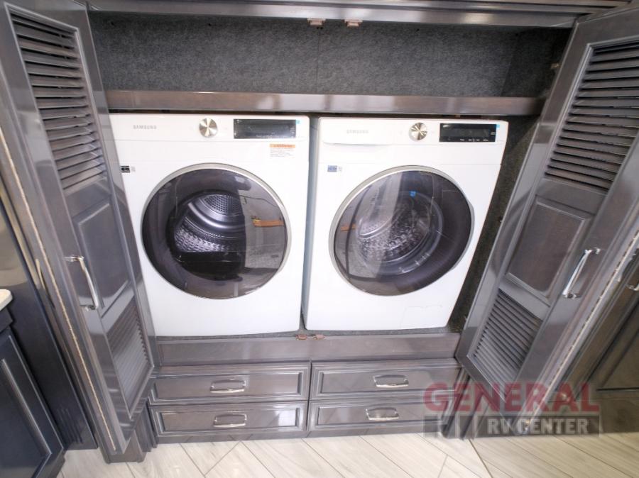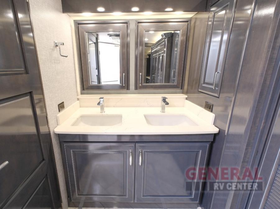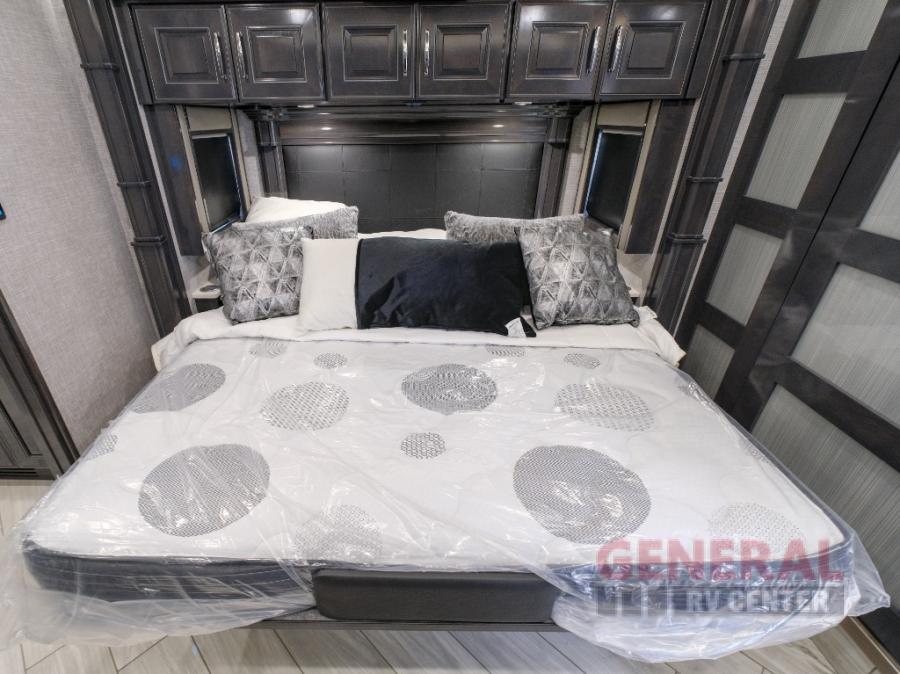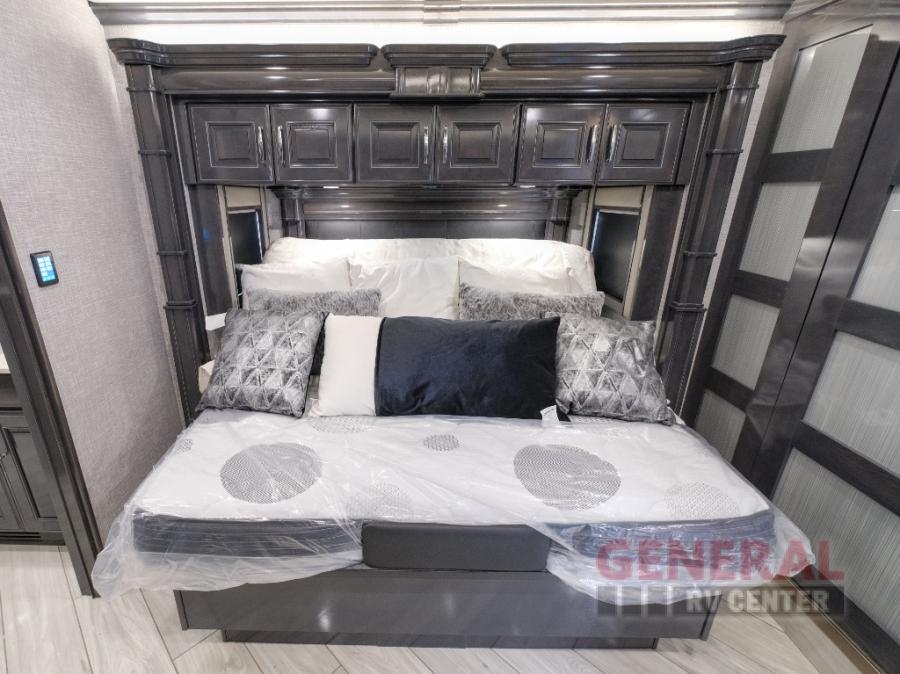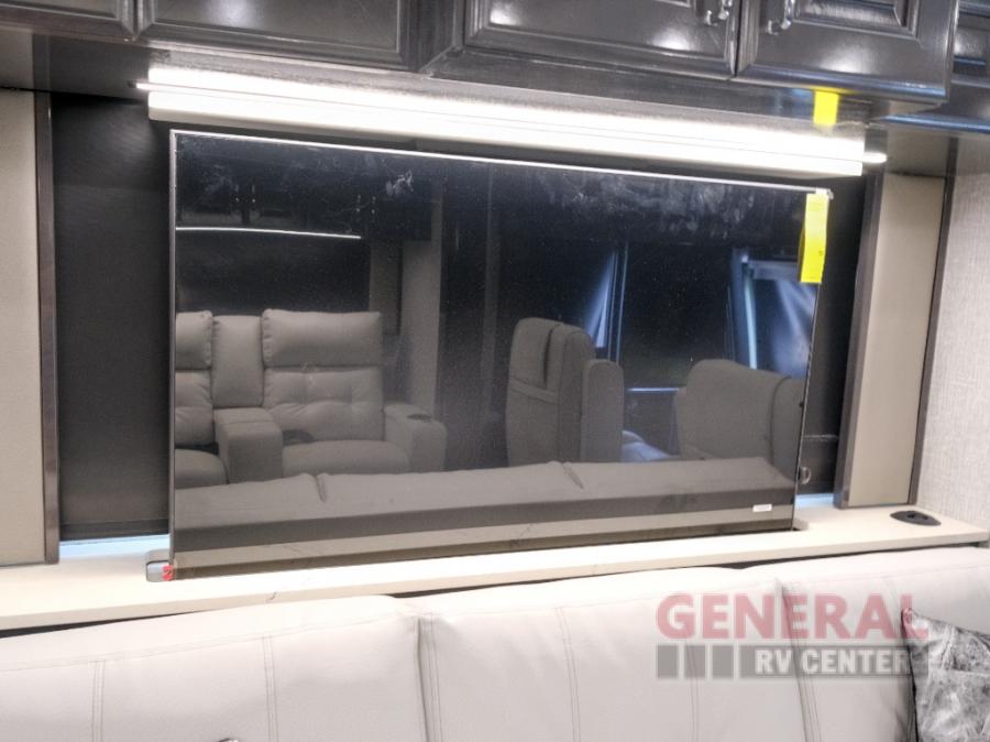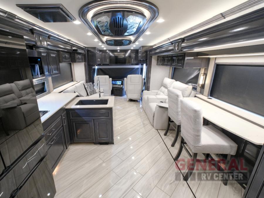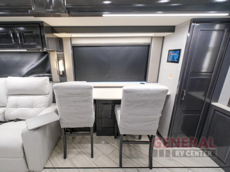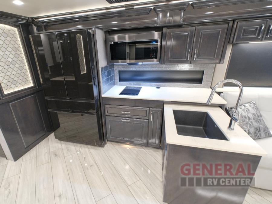 Comfort will be easy to find in this four slide out coach! You will love the master bedroom with an Encore Series king bed slide out and the rear master bathroom with a dual sink vanity and a side-by-side washer/dryer. There is also a spacious shower with a seat and a private toilet so you both can use this room before bed. If you have any guests, they can sleep on the sofa sleeper with a full mattress, and there is a mid-ship half bath for added convenience. This American Dream kitchen includes everything you need to prepare meals each day, including a two burner induction cooktop, a residential over-the-range convection microwave oven, and a residential refrigerator with an ice and water dispenser. This model also includes a studio bar with two chairs where you can work while you're on the road and a motion power lounge across from the televator LED TV for movie nights!