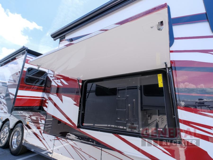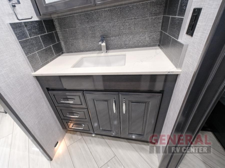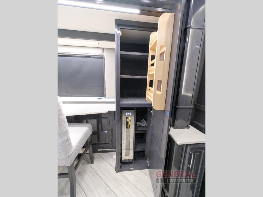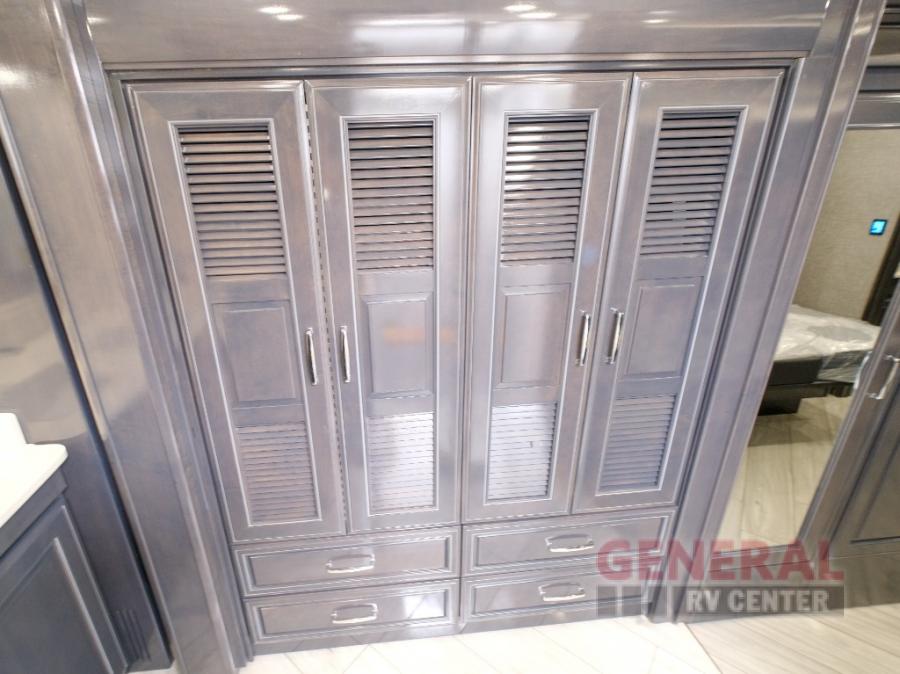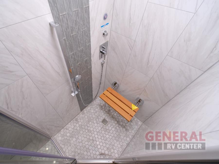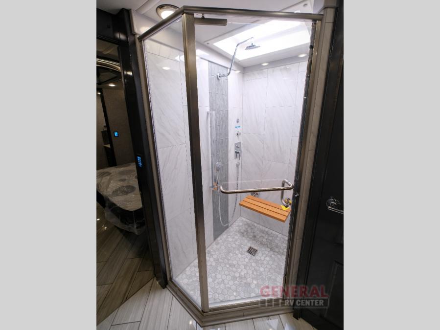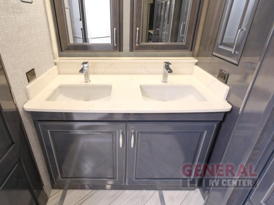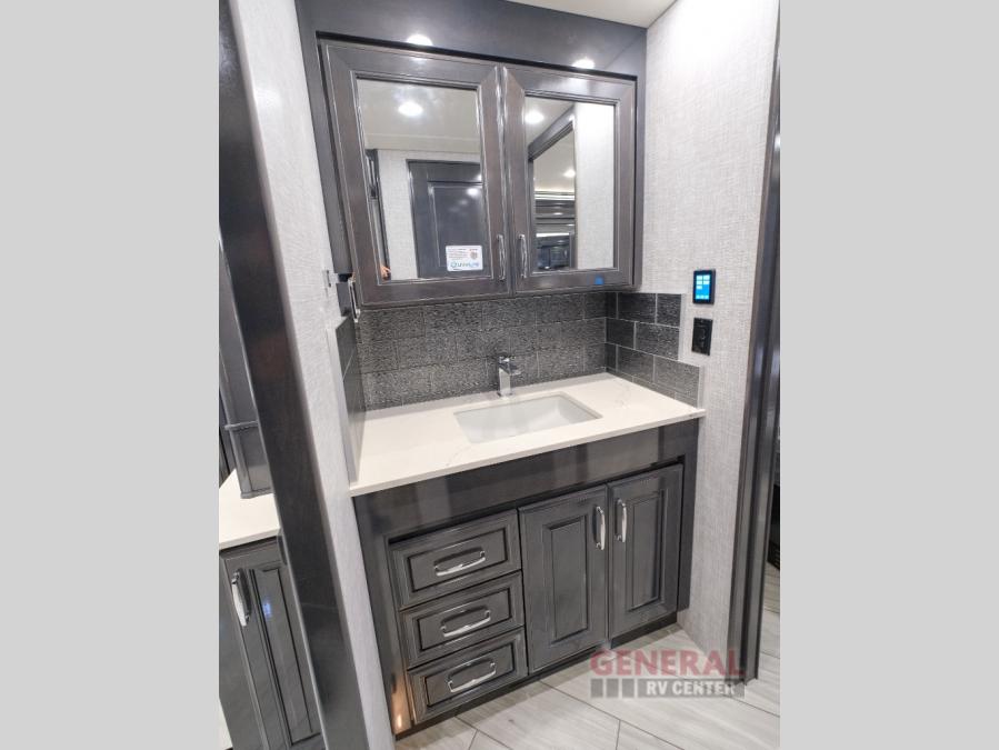 Comfort will be easy to find in this four slide out coach! You will love the master bedroom with an Encore Series king bed slide out and the rear master bathroom with a dual sink vanity and a side-by-side washer/dryer. There is also a spacious shower with a seat and a private toilet so you both can use this room before bed. If you have any guests, they can sleep on the sofa sleeper with a full mattress, and there is a mid-ship half bath for added convenience. This American Dream kitchen includes everything you need to prepare meals each day, including a two burner induction cooktop, a residential over-the-range convection microwave oven, and a residential refrigerator with an ice and water dispenser. This model also includes a studio bar with two chairs where you can work while you're on the road and a motion power lounge across from the televator LED TV for movie nights!