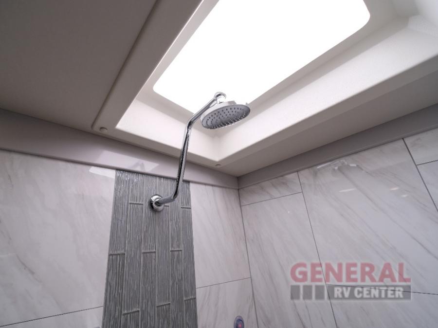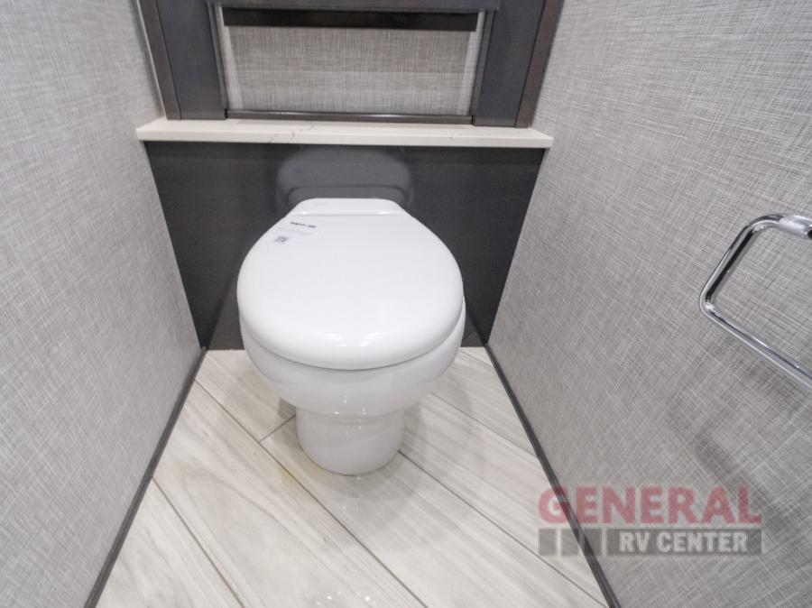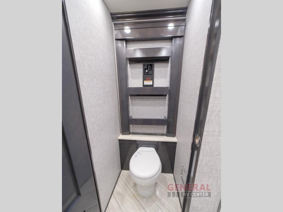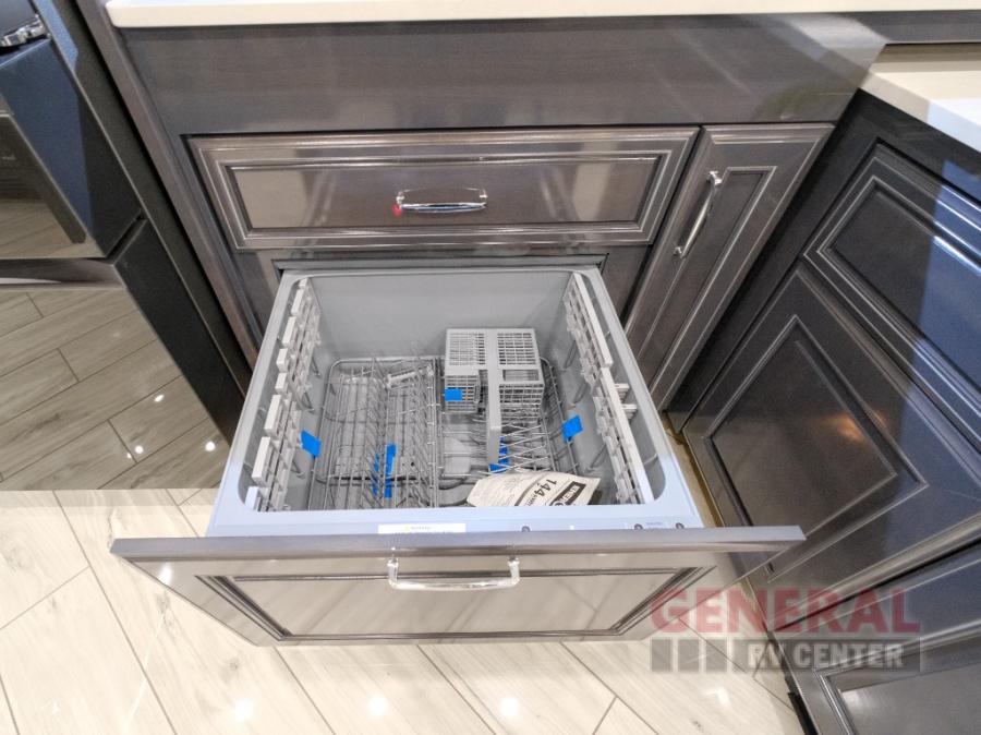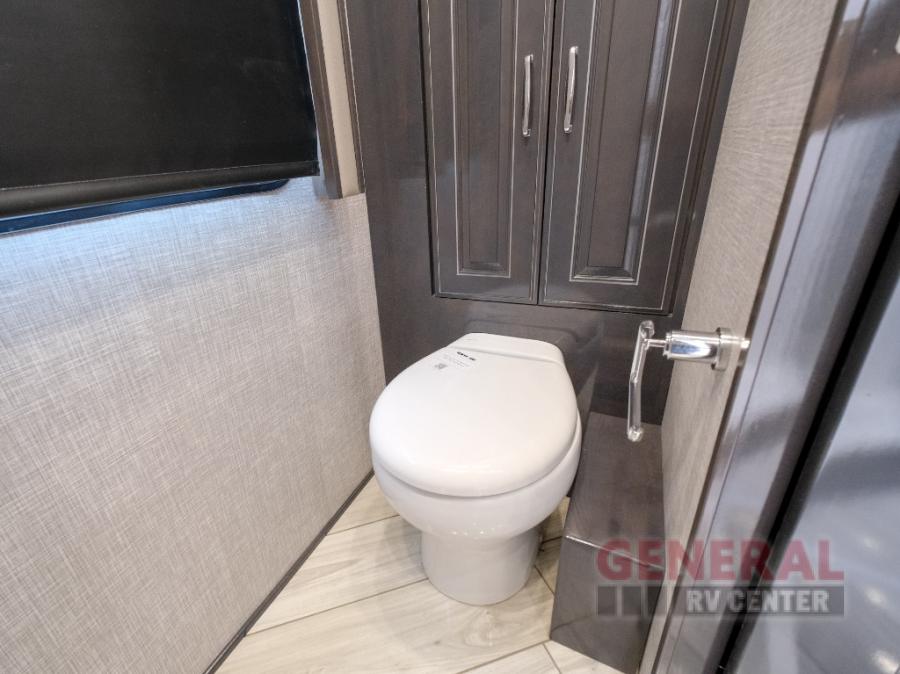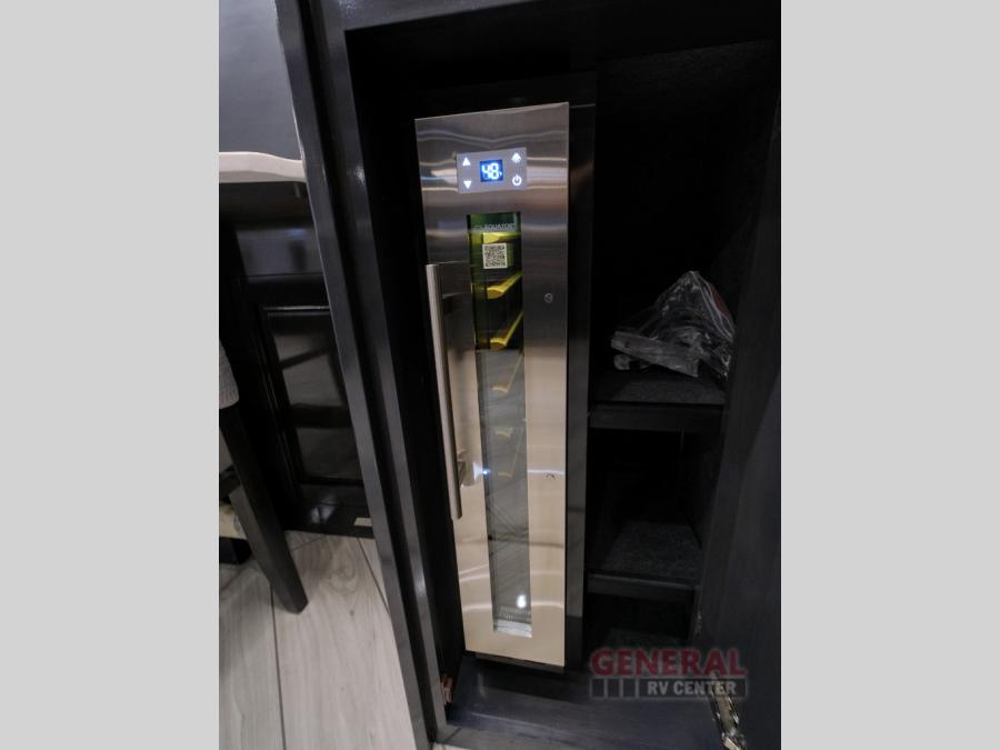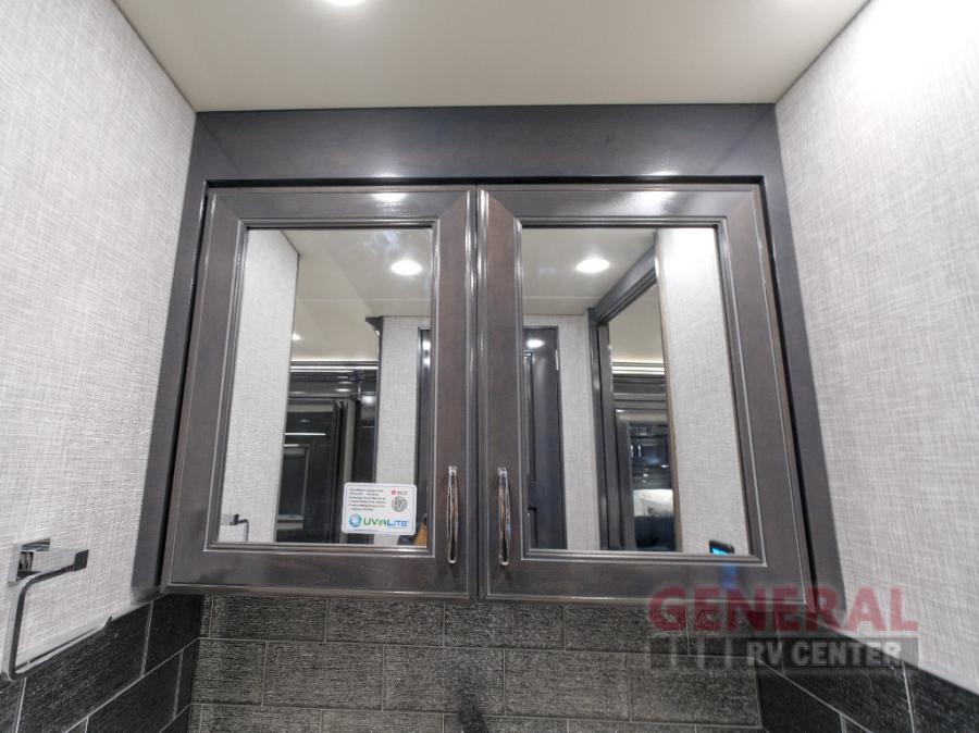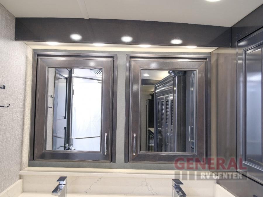 Comfort will be easy to find in this four slide out coach! You will love the master bedroom with an Encore Series king bed slide out and the rear master bathroom with a dual sink vanity and a side-by-side washer/dryer. There is also a spacious shower with a seat and a private toilet so you both can use this room before bed. If you have any guests, they can sleep on the sofa sleeper with a full mattress, and there is a mid-ship half bath for added convenience. This American Dream kitchen includes everything you need to prepare meals each day, including a two burner induction cooktop, a residential over-the-range convection microwave oven, and a residential refrigerator with an ice and water dispenser. This model also includes a studio bar with two chairs where you can work while you're on the road and a motion power lounge across from the televator LED TV for movie nights!