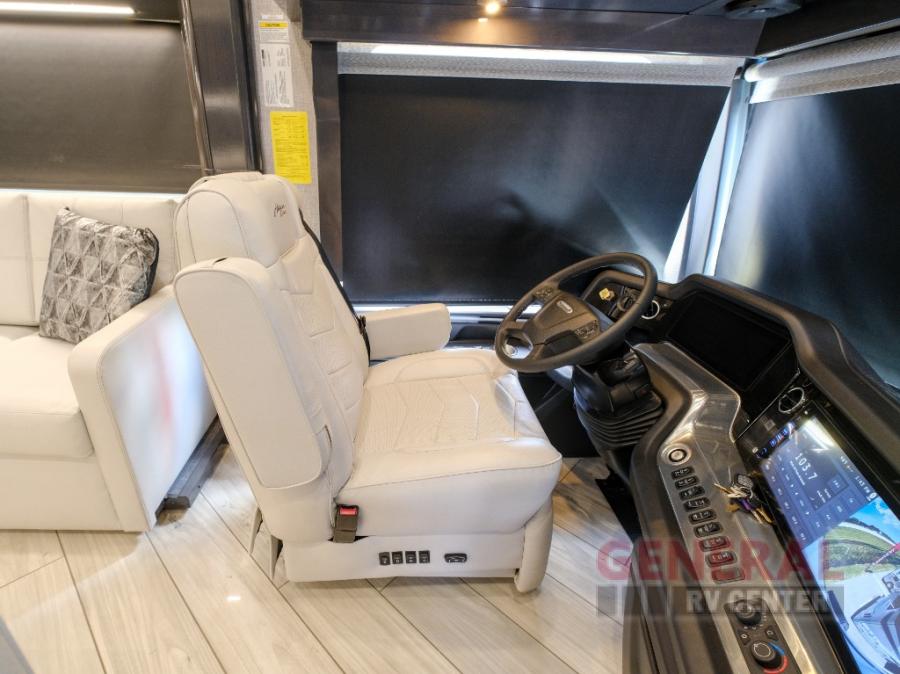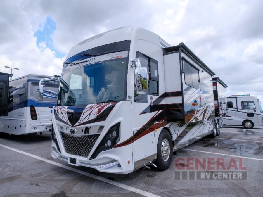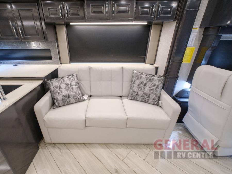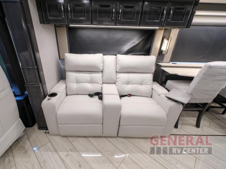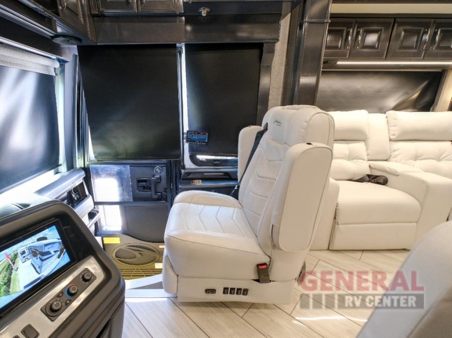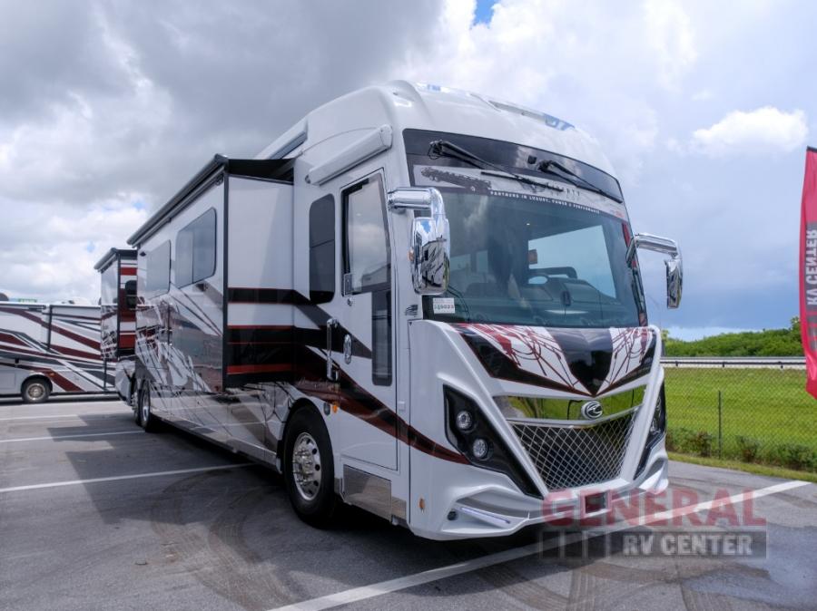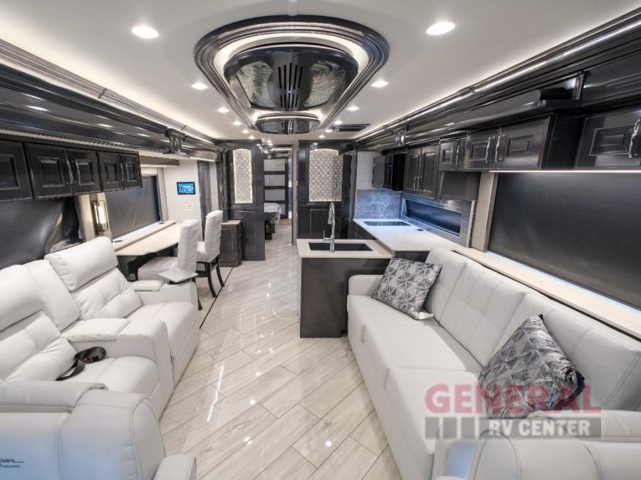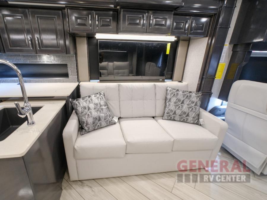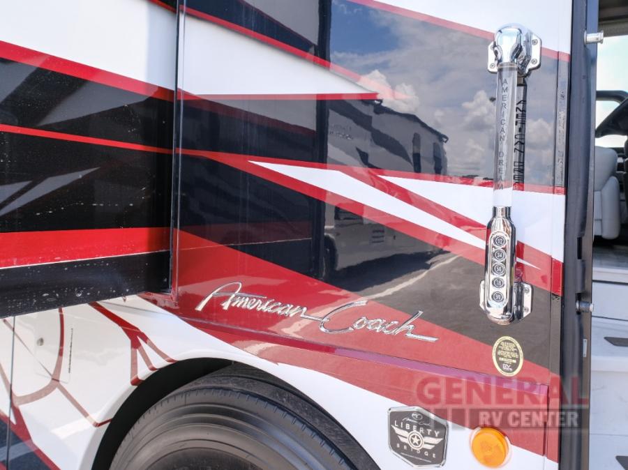 Hit the road with confidence in any one of these American Coach American Dream Class A diesel motorhomes with their Freightliner Custom Chassis and Cummins diesel engine! You will travel stress free thanks to the RoadWatch safety system that comes with collision mitigation, adaptive cruise, and electronic stability, automatic traction, and roll stability control. You'll love the new dual coat painted steel platform, upgraded water pump, and added exterior light strips to the rear engine grille and behind the rear upper spoiler. The interior includes beautiful Quartz kitchen countertops, an upgraded Blanco Anthracite galley sink, and Apex residential custom furniture designs!