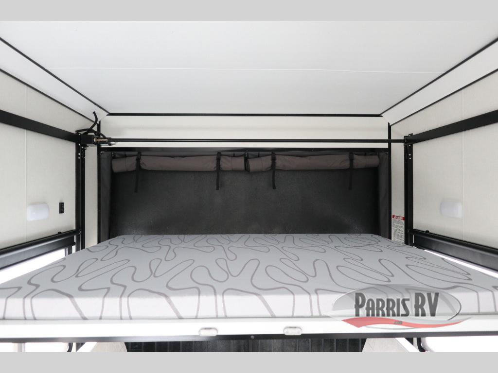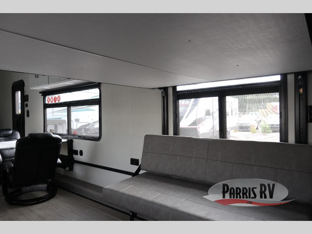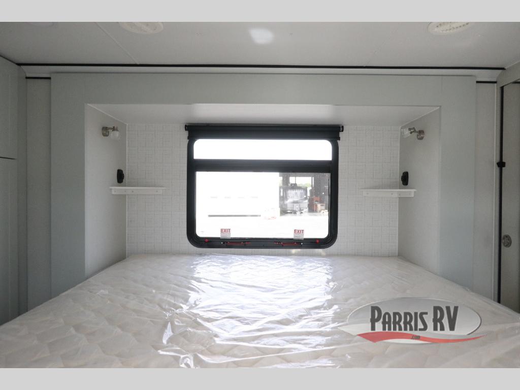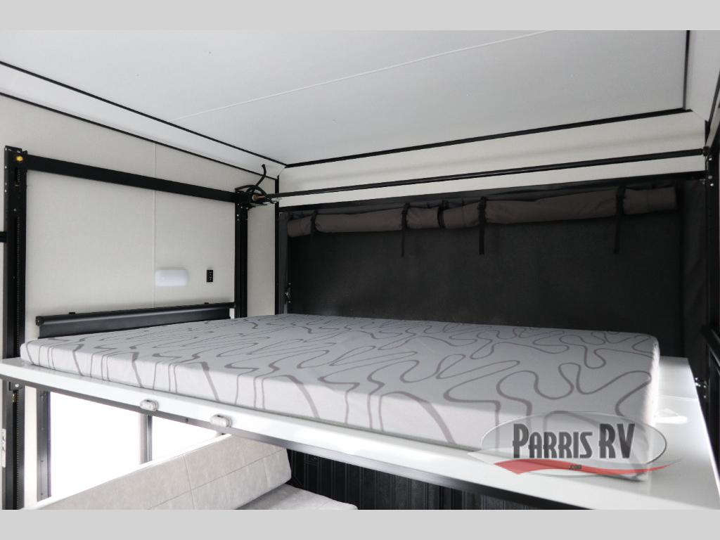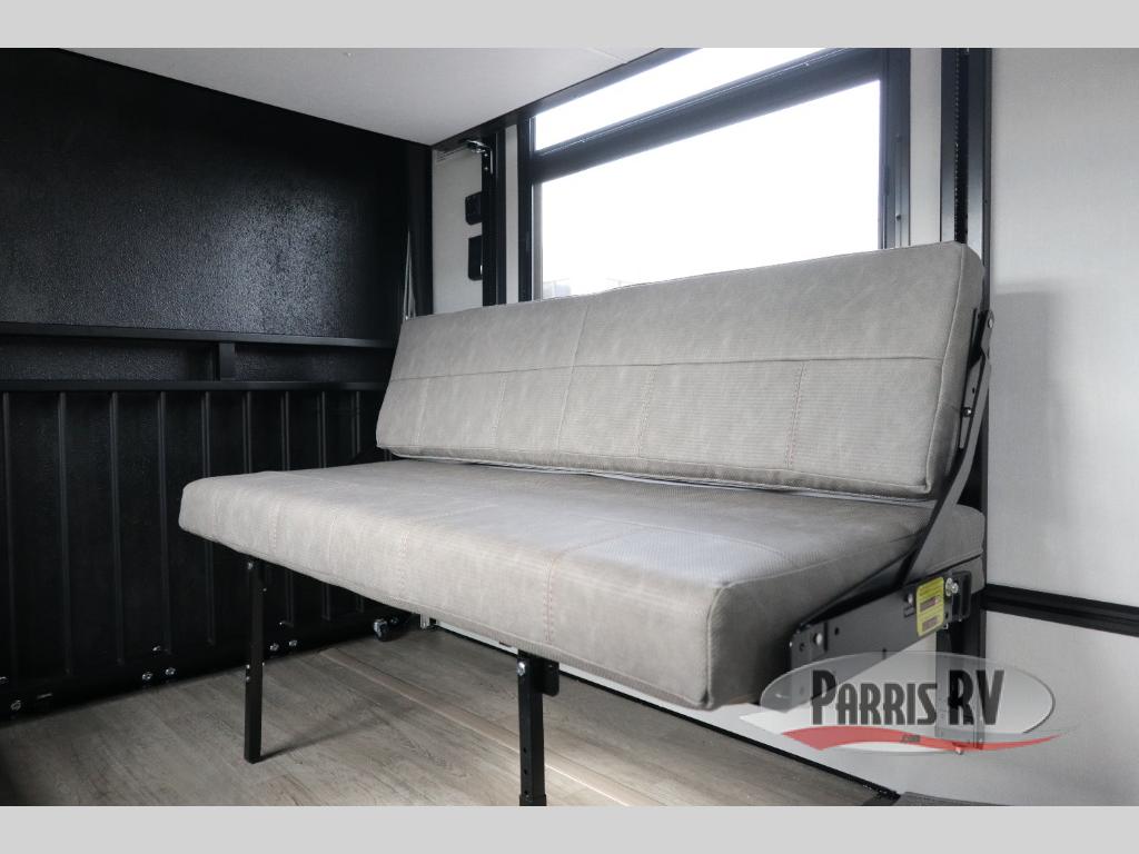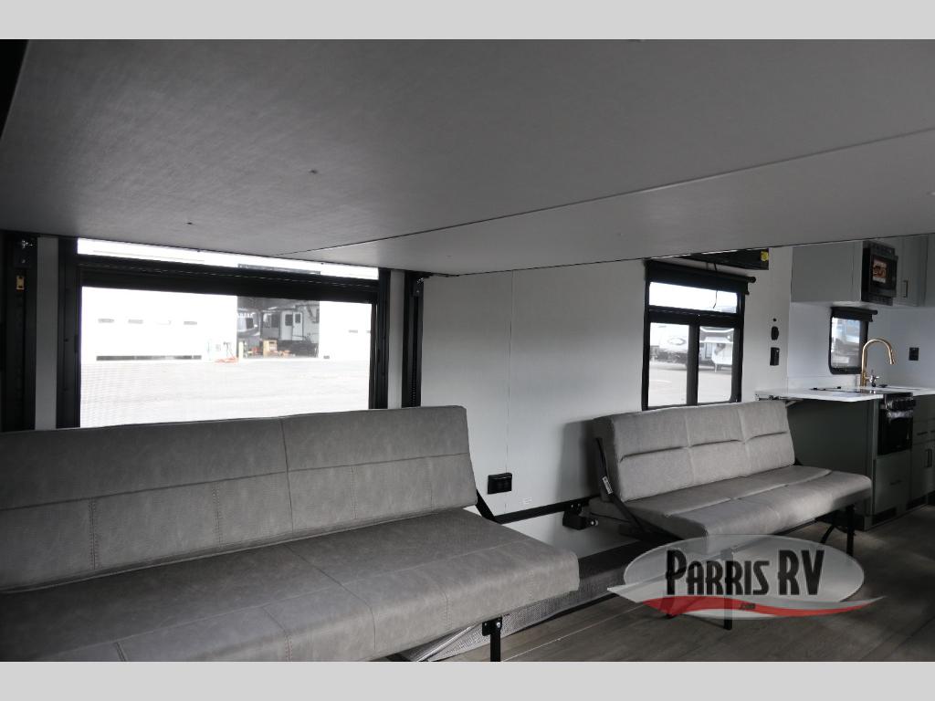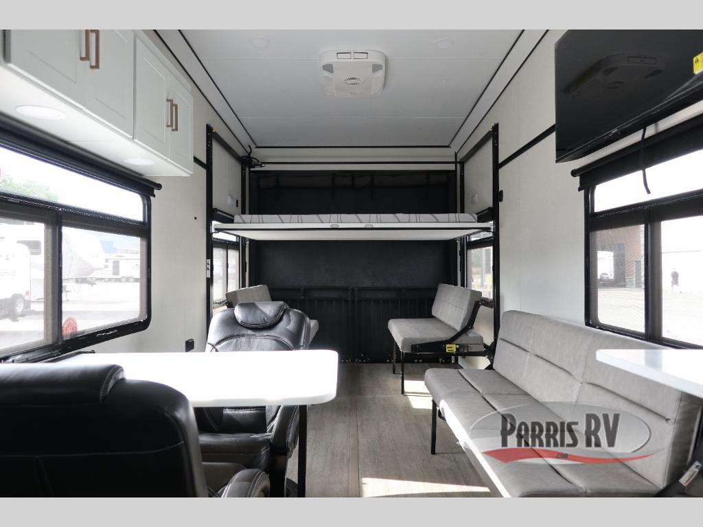 Start a new adventure in this spacious toy hauler that can sleep 2-12 depending on the options you choose to add! Once your toys are unloaded using the cableless rear ramp door, you can head out on a trail or two. You'll find a residential queen bed with storage in the front bedroom, along with a large front closet and TV prep if you want to add a television. The full bath includes a spa/jet shower fixture that is sure to be nice after a day of riding the trails, and there is a glass shower door for added luxury. Head to the kitchen where you can whip up a meal for your crew on the LP three burner cooktop or in the convection microwave, and you can dine at the dinette with four chairs. If you'd like to get some fresh air, take your plate outdoors to sit under the power awning with a light strip!