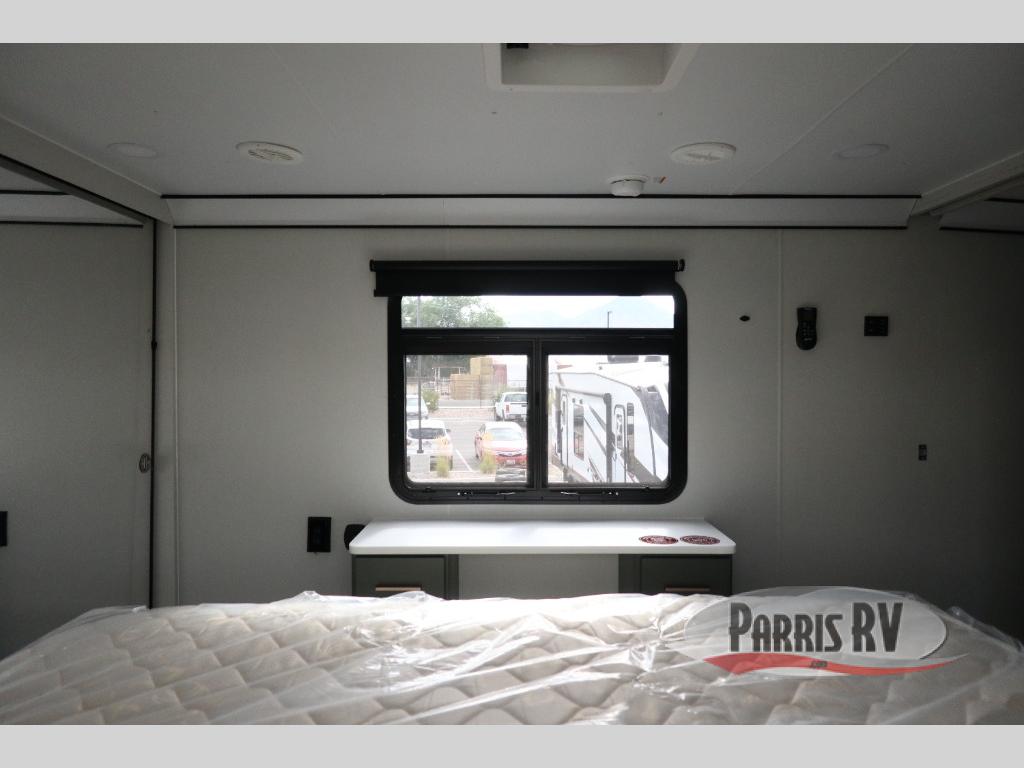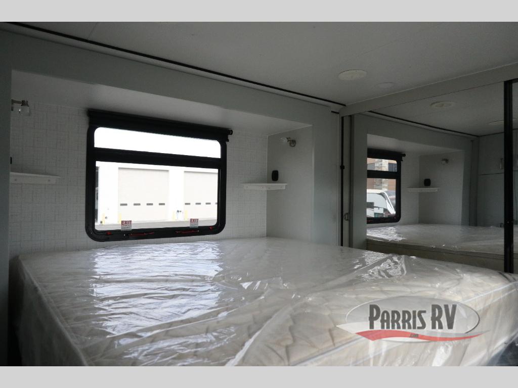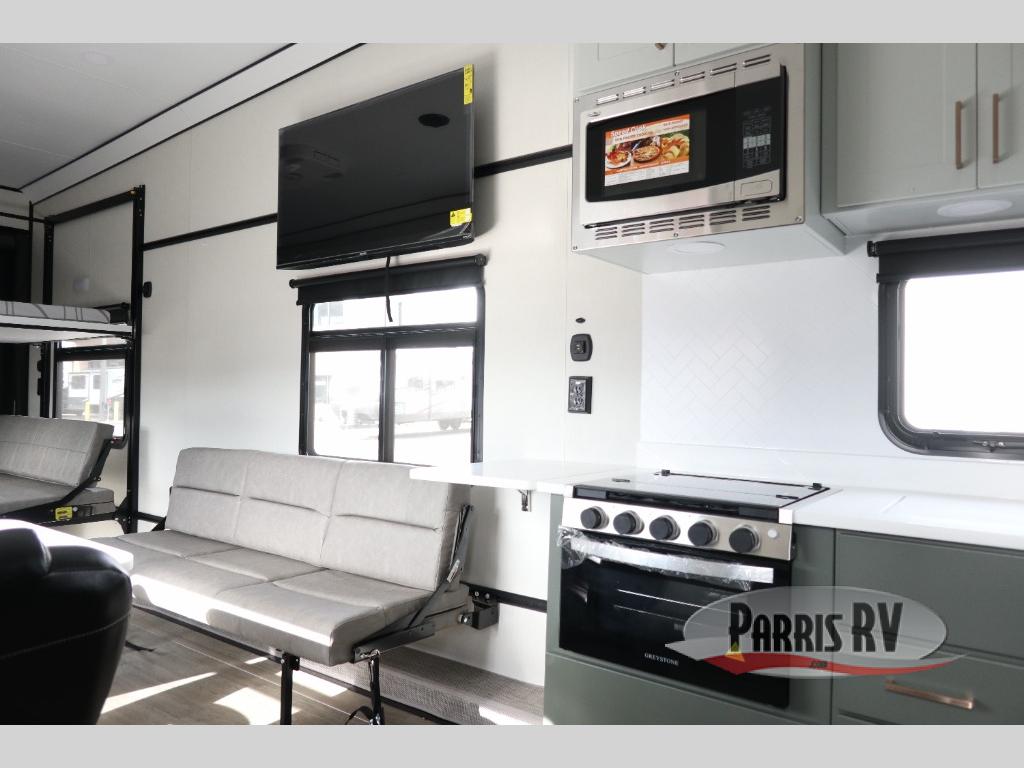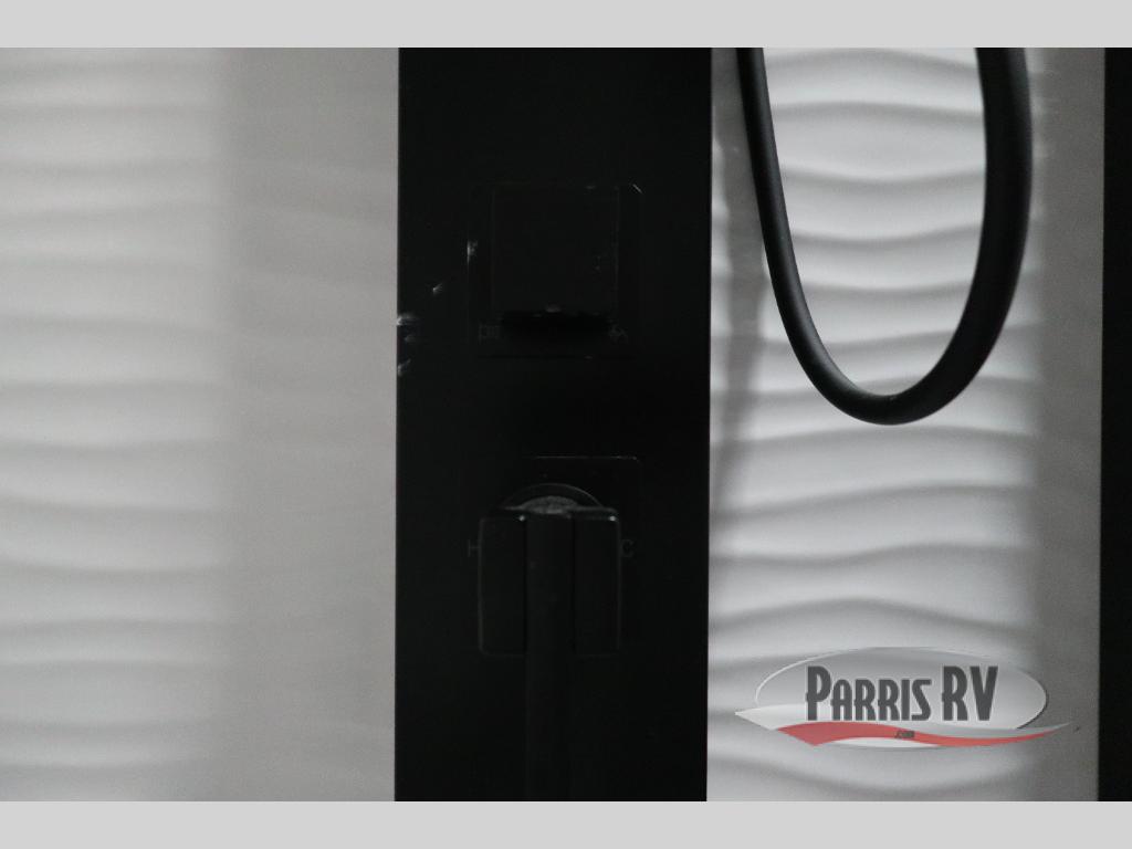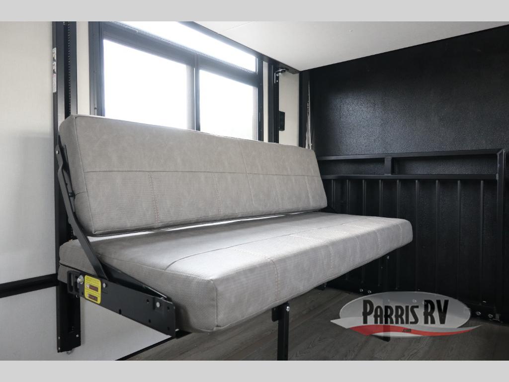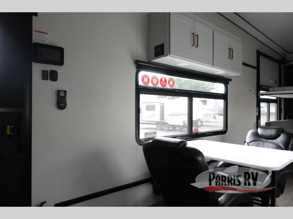 Start a new adventure in this spacious toy hauler that can sleep 2-12 depending on the options you choose to add! Once your toys are unloaded using the cableless rear ramp door, you can head out on a trail or two. You'll find a residential queen bed with storage in the front bedroom, along with a large front closet and TV prep if you want to add a television. The full bath includes a spa/jet shower fixture that is sure to be nice after a day of riding the trails, and there is a glass shower door for added luxury. Head to the kitchen where you can whip up a meal for your crew on the LP three burner cooktop or in the convection microwave, and you can dine at the dinette with four chairs. If you'd like to get some fresh air, take your plate outdoors to sit under the power awning with a light strip!