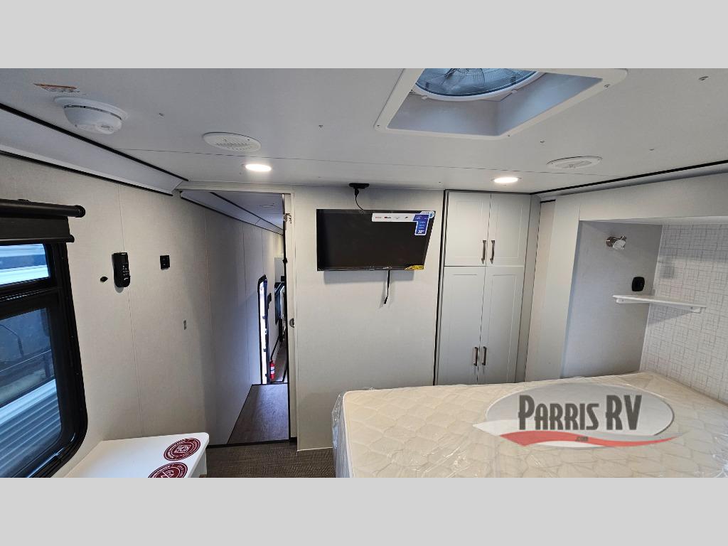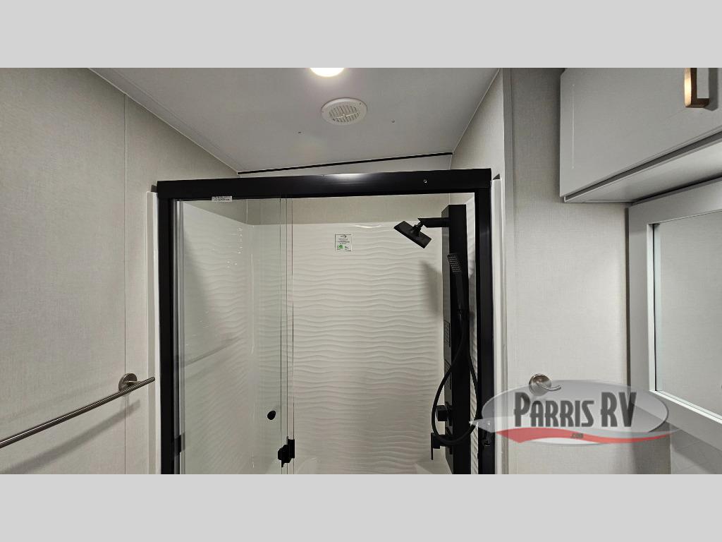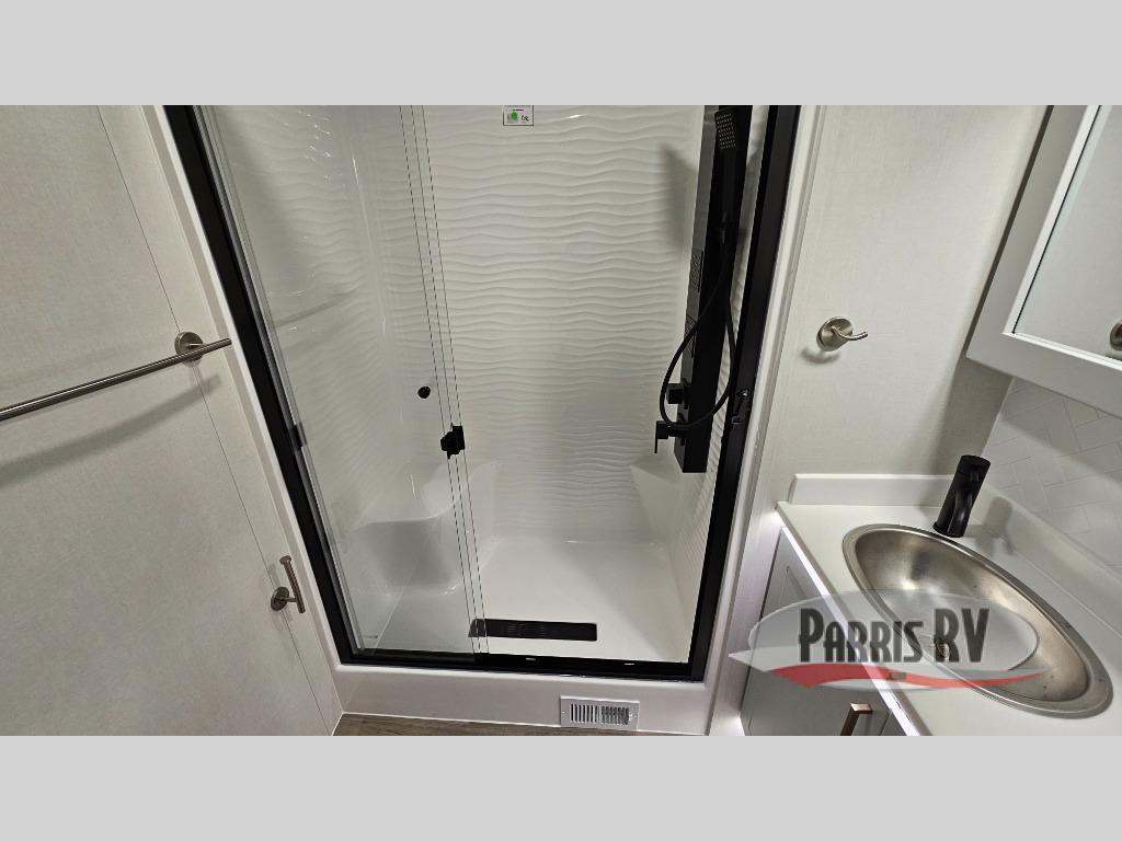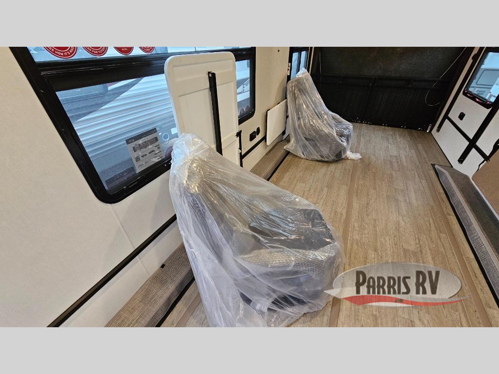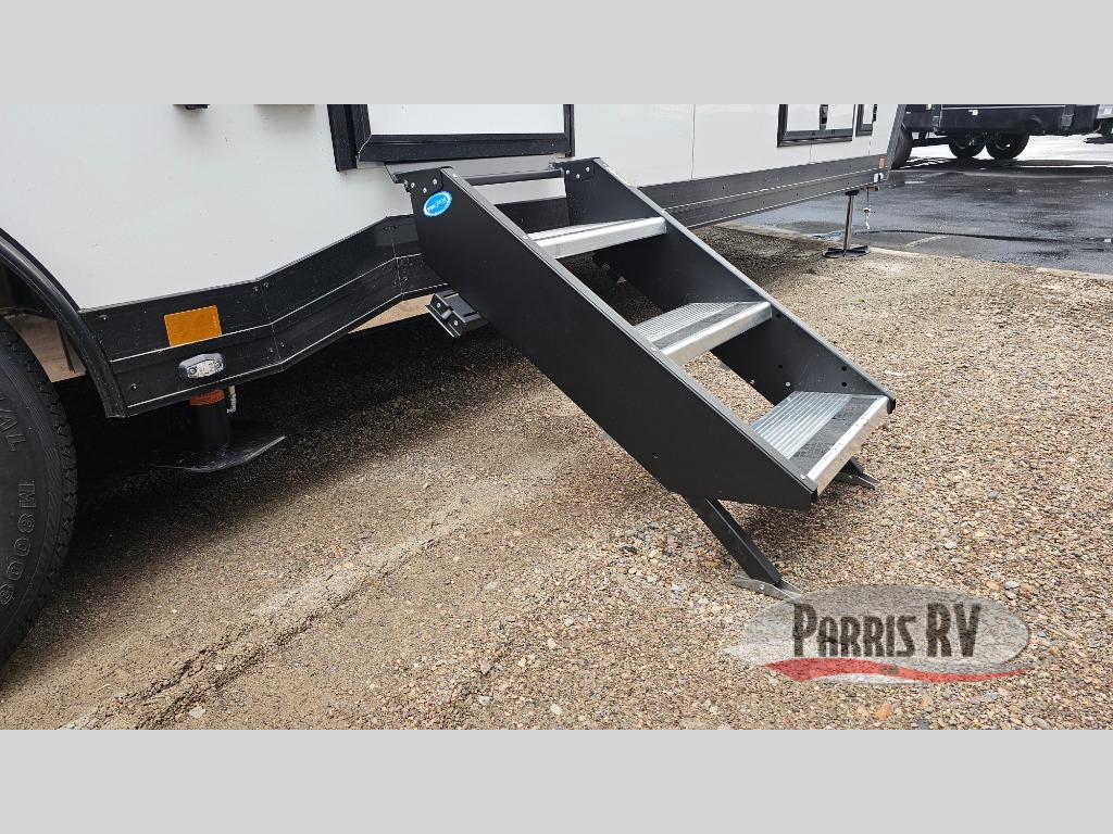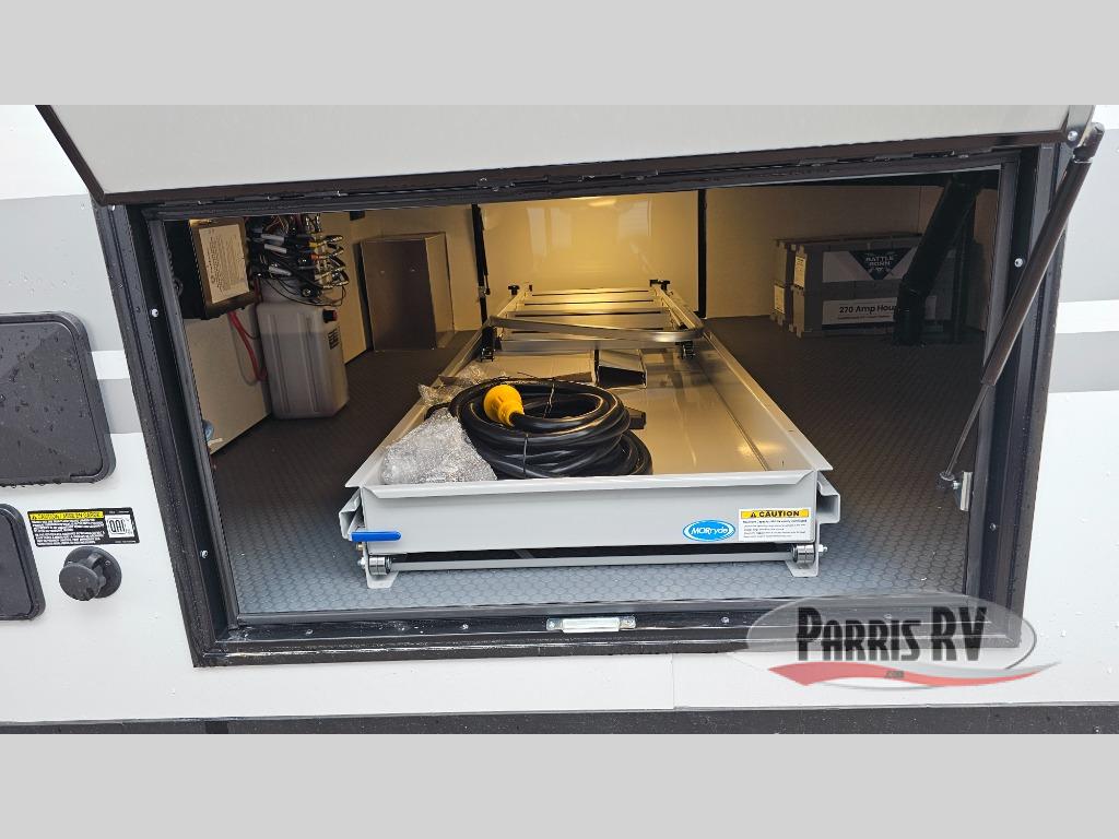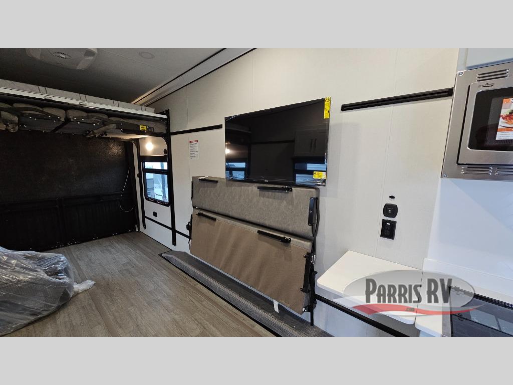 Start a new adventure in this spacious toy hauler that can sleep 2-12 depending on the options you choose to add! Once your toys are unloaded using the cableless rear ramp door, you can head out on a trail or two. You'll find a residential queen bed with storage in the front bedroom, along with a large front closet and TV prep if you want to add a television. The full bath includes a spa/jet shower fixture that is sure to be nice after a day of riding the trails, and there is a glass shower door for added luxury. Head to the kitchen where you can whip up a meal for your crew on the LP three burner cooktop or in the convection microwave, and you can dine at the dinette with four chairs. If you'd like to get some fresh air, take your plate outdoors to sit under the power awning with a light strip!
