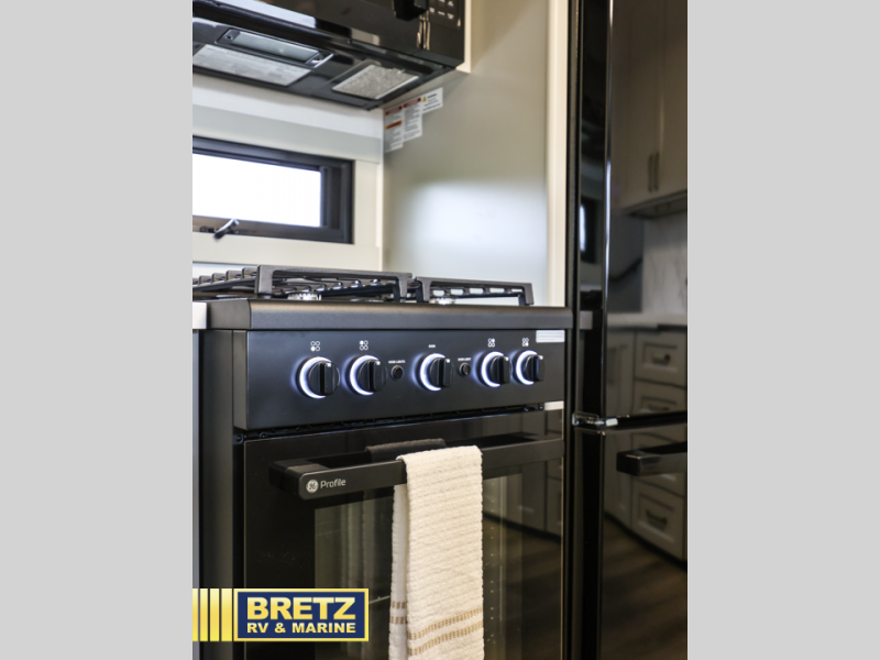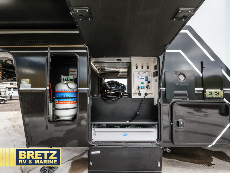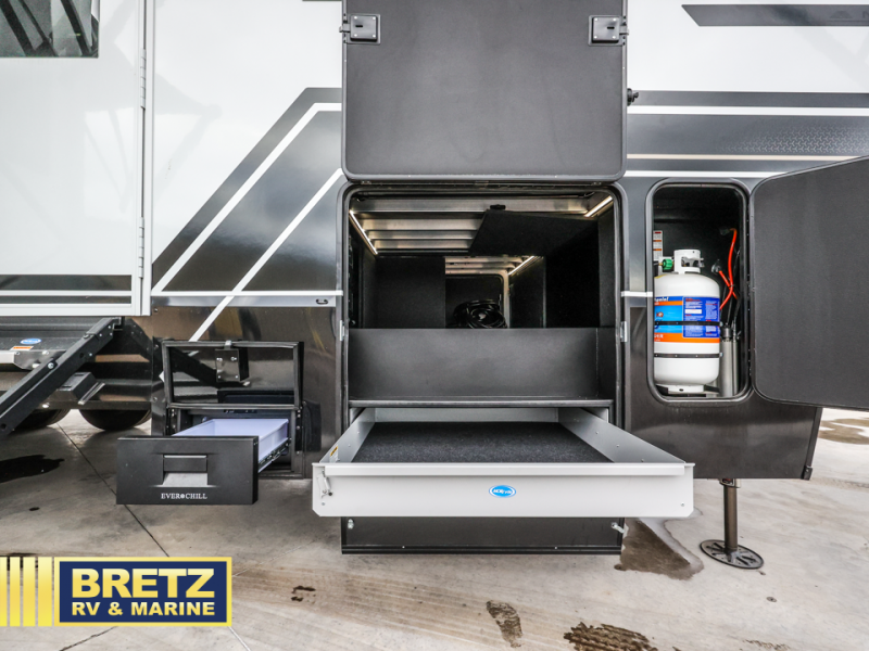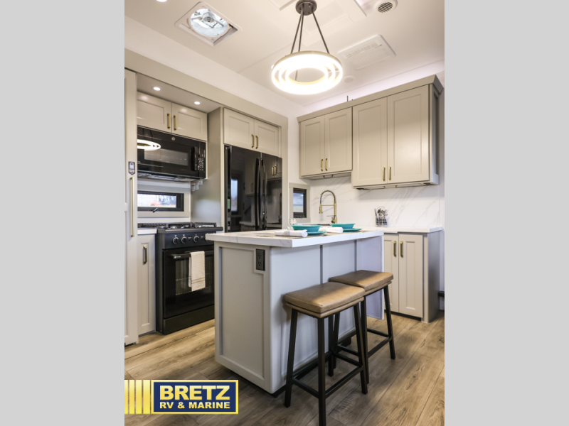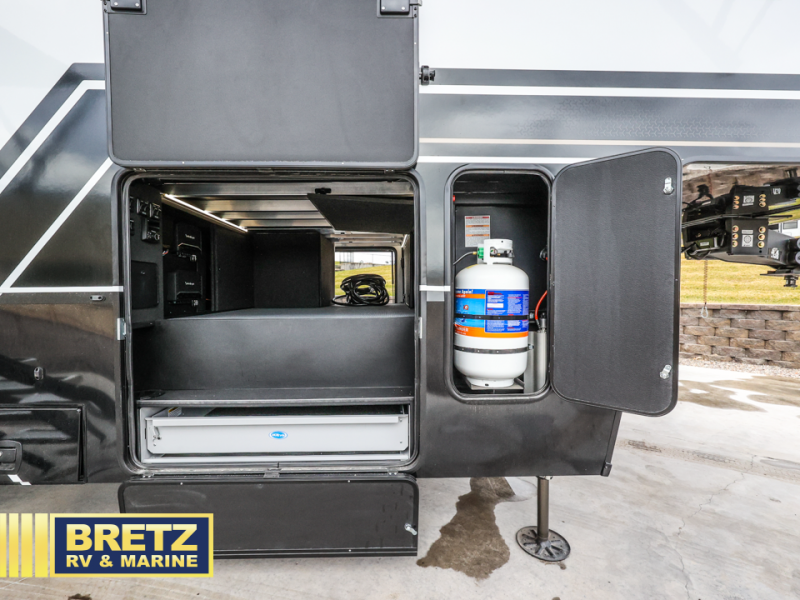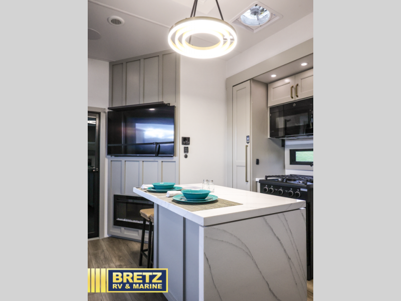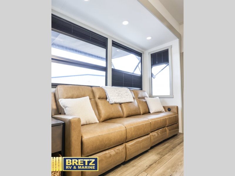 You can't imagine how much this toy hauler has to offer! The garage/outdoor kitchen/office space will allow you to utilize the garage how you need it, plus there is an adjustable tie-down system, as well as a loft for storage and a twin bed to sleep more campers! The garage patio with a 1,500 lb. capacity is another feature you are sure to love, especially with its own awning to keep you protected from the elements. Head to the kitchen to prepare meals with a 24" GE oven with a four burner range, a GE microwave with an air fryer, plus a spacious GE Energy Star 19 cu. ft. refrigerator. The island with two stools will let others visit with you while you cook, and there are even dog bowls to easily feed Frodo. You'll find the convertible dining table/L-desk will be accommodating since it can be use to dine at, and to get some work done. You may just find yourselves spending most of your time on the L-sofa in front of the entertainment center with a TV, fireplace and storage. A full bath is up front by the bedroom, and here you'll find a 30" x 42" shower and and pull-out linen storage with a trash bin to keep towels ready to use. After a day outdoors you'll love nothing more than coming back to your own bedroom with a king bed slide out, TV, a walk-in closet, and many more storage spaces. And we haven't even touched on the exterior features, like the 3-way pass-through storage, three power awnings, an air compressor to fill up tires, and the list goes on and on!  This is a pre-production preview, all features and layout placement subject to change.