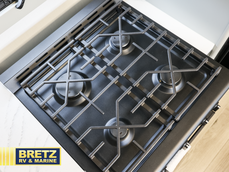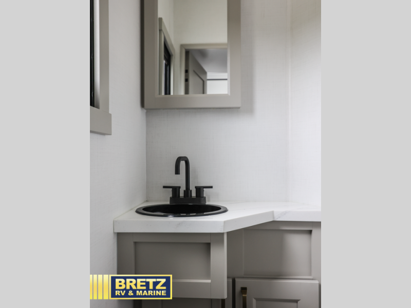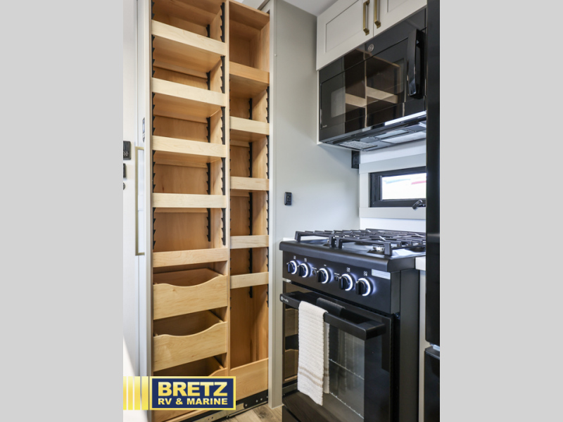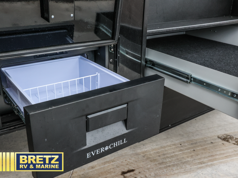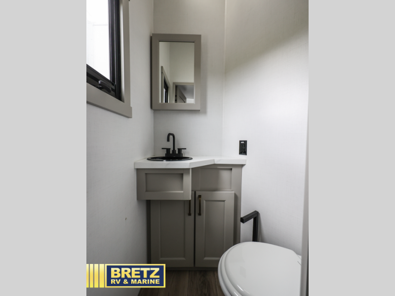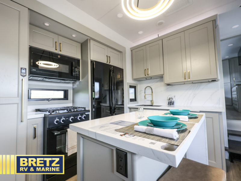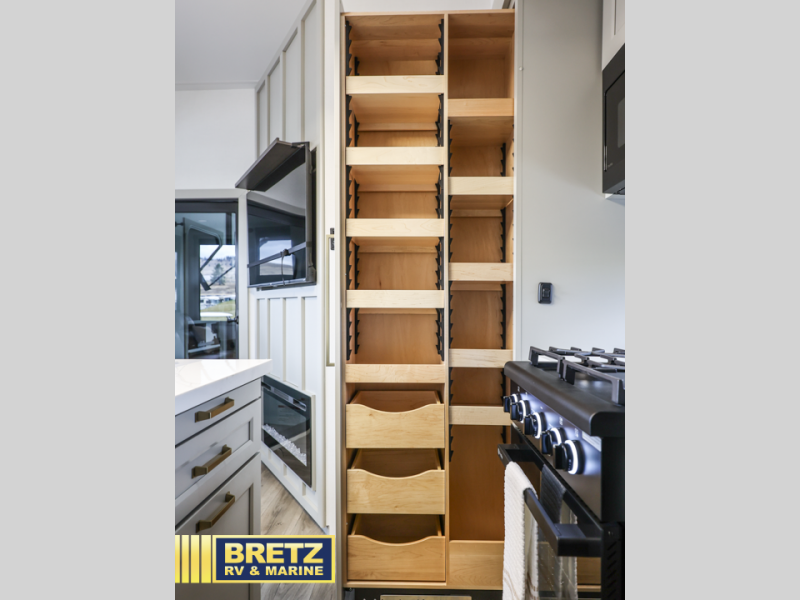 You can't imagine how much this toy hauler has to offer! The garage/outdoor kitchen/office space will allow you to utilize the garage how you need it, plus there is an adjustable tie-down system, as well as a loft for storage and a twin bed to sleep more campers! The garage patio with a 1,500 lb. capacity is another feature you are sure to love, especially with its own awning to keep you protected from the elements. Head to the kitchen to prepare meals with a 24" GE oven with a four burner range, a GE microwave with an air fryer, plus a spacious GE Energy Star 19 cu. ft. refrigerator. The island with two stools will let others visit with you while you cook, and there are even dog bowls to easily feed Frodo. You'll find the convertible dining table/L-desk will be accommodating since it can be use to dine at, and to get some work done. You may just find yourselves spending most of your time on the L-sofa in front of the entertainment center with a TV, fireplace and storage. A full bath is up front by the bedroom, and here you'll find a 30" x 42" shower and and pull-out linen storage with a trash bin to keep towels ready to use. After a day outdoors you'll love nothing more than coming back to your own bedroom with a king bed slide out, TV, a walk-in closet, and many more storage spaces. And we haven't even touched on the exterior features, like the 3-way pass-through storage, three power awnings, an air compressor to fill up tires, and the list goes on and on!  This is a pre-production preview, all features and layout placement subject to change.