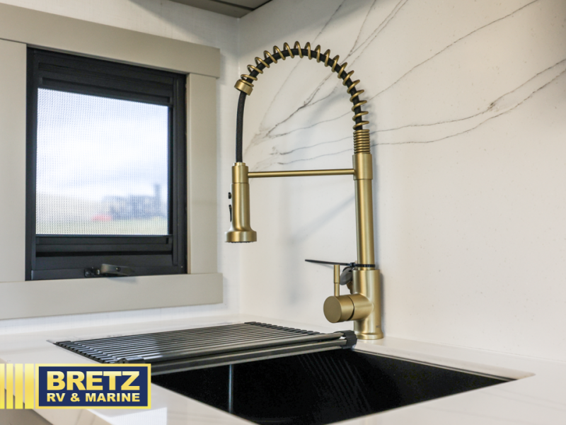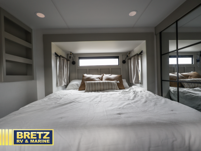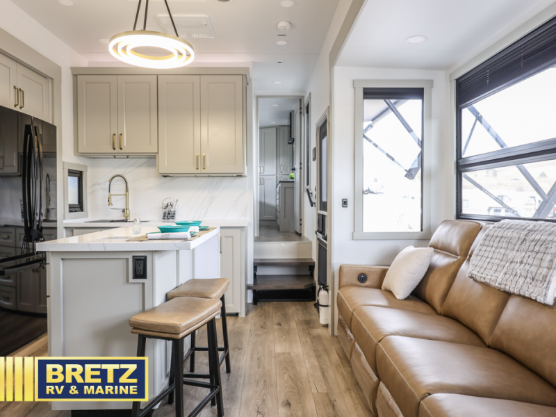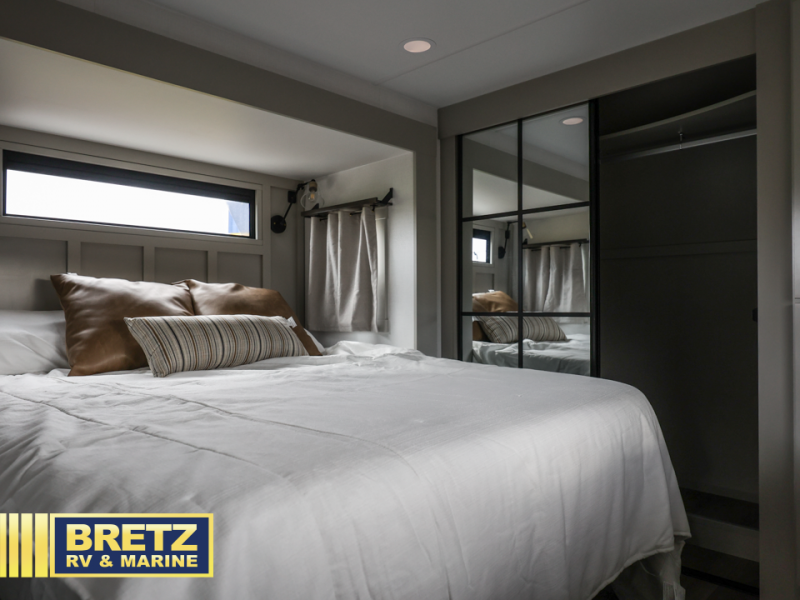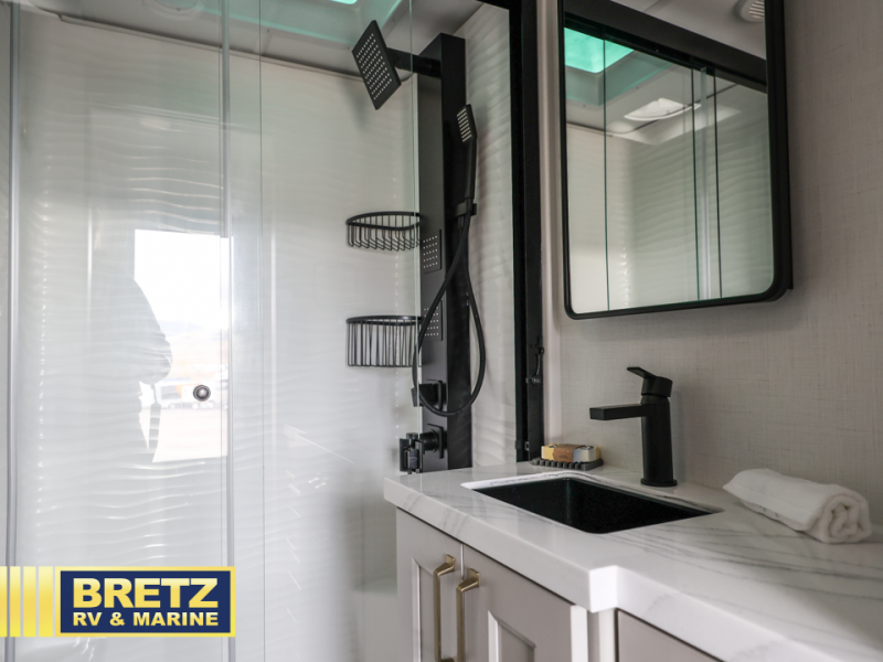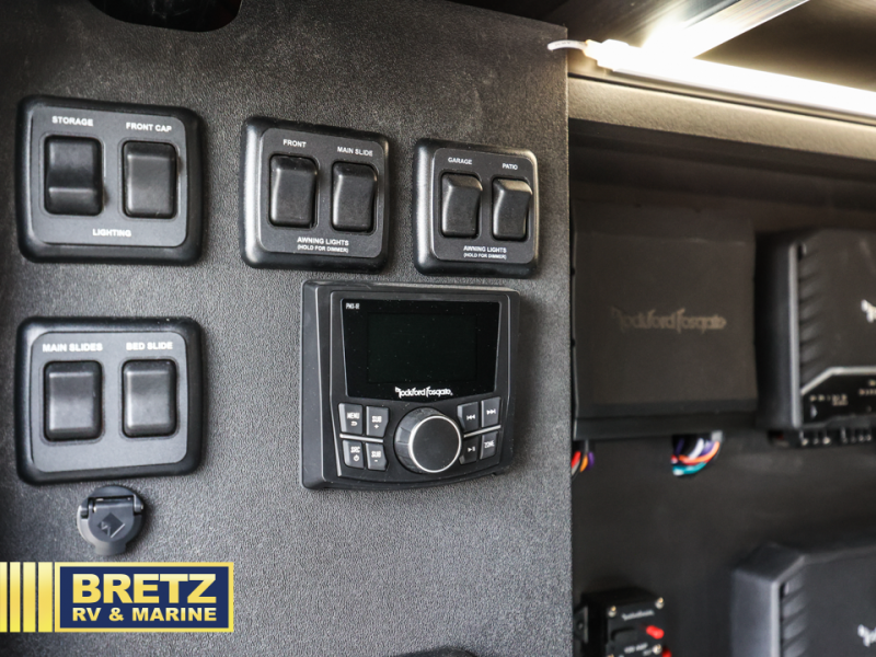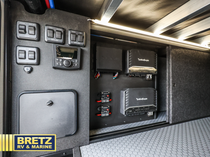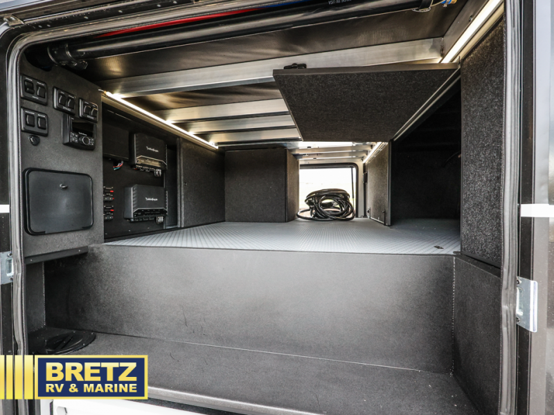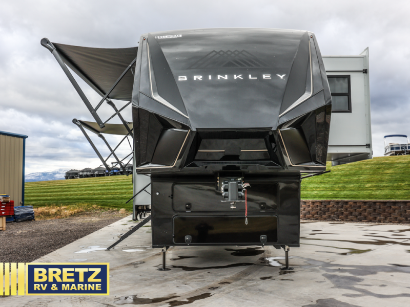 With any Model G toy hauler fifth wheel by Brinkley you will enjoy luxurious amenities, tons of storage space, and innovative features that have been developed and tested in the real world. Durable construction includes an industry leading PDI process, an industry best insulation package, and reinforced and walkable slide roofs. Some of the exterior features you'll find are a 3-way pass-through with a multi-functional flip-up bulkhead wall, under I-beam storage, a MAX-Vision reverse lighting system, and a low-maintenance roof to name a few. A Rockford Fosgate audio system comes standard, along with a  Full app-based coach control system (iOS & Android) that lets you control your fifth wheel's functions right from your mobile device. You will find the solar system with a designated storage area to be ultra convenient, plus there is a FlexPower 5500 with a dual fuel inverter generator for all your power needs. Head inside to find a residential interior with Brinkley's CraftSense wood trim construction, floating entrance steps, integrated window screens and insulated blackout blinds, and residential solid surface countertops plus backsplash. You will also enjoy the neon shower lighting and recessed medicine cabinets in the bath, plus motion activated LED bed lights and dual bedside outlets in the bedroom. Choose a Model G toy hauler fifth wheel to experience all the luxury it has to offer!
