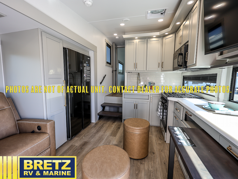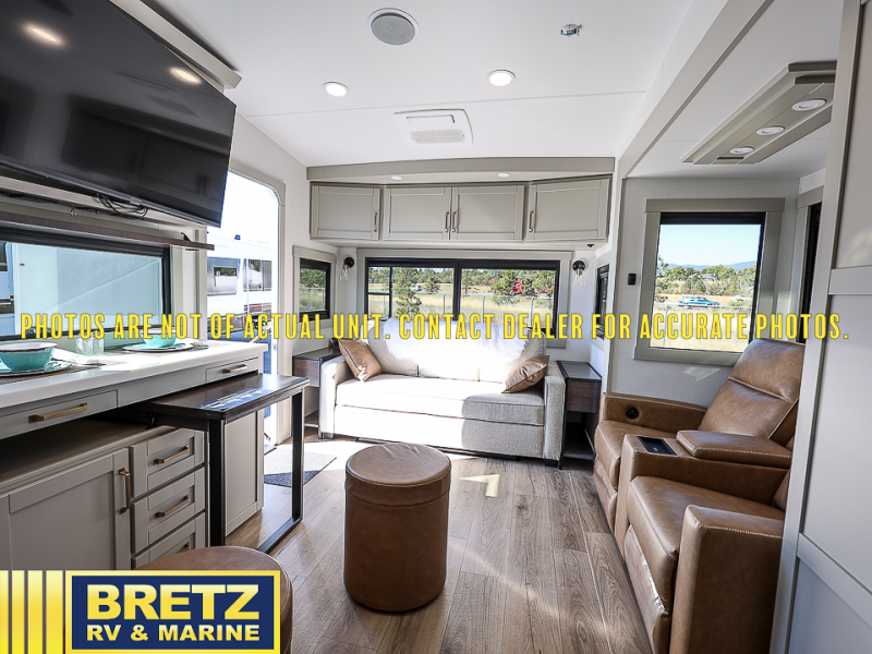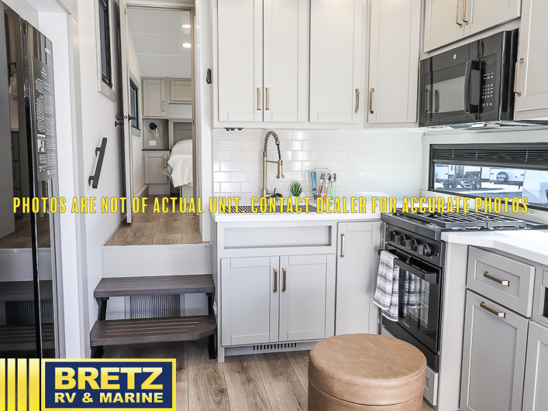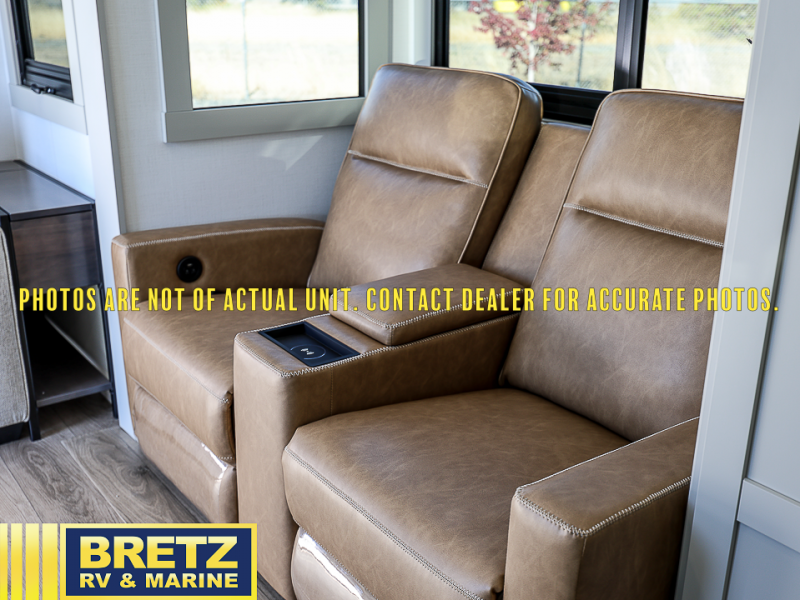 You'll love every minute spent in this luxury fifth wheel! Your crew can get comfortable in the rear living room on the 72" tri-fold sofa that converts to a 62" x 70" bed, or on the theater seating within the slide out. There is also a sliding dining table and a TV with swivel so everyone can have a good view of the movie. A full kitchen, complete with a cooktop, 30" residential microwave, and 16 cu. ft. refrigerator will let you cook and store food, and there is a handy trash bin with a Stow N' Go paper towel holder for easy clean up. The full bath will let you freshen up before heading to bed in the front private bedroom!