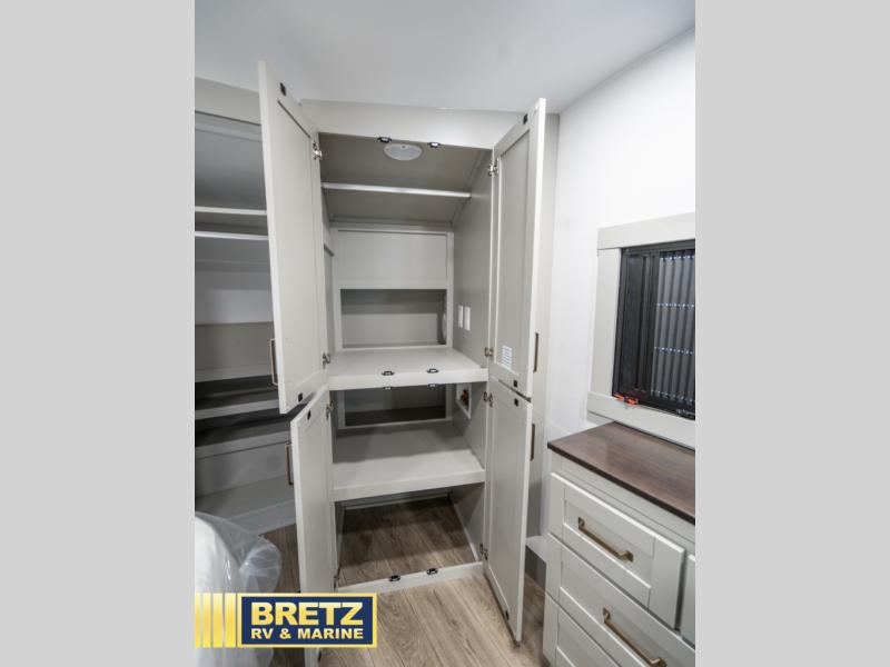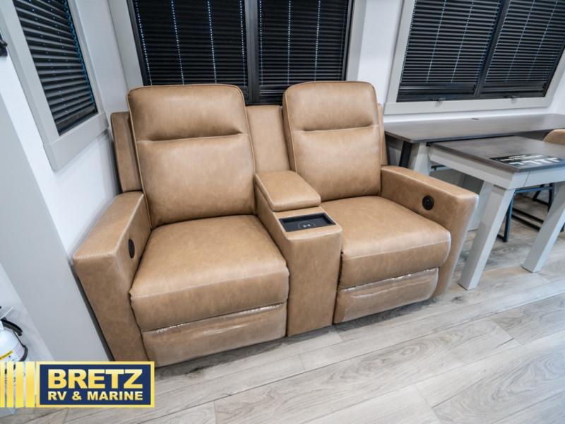 You're going to love every minute spent in this triple slide out fifth wheel! Once you arrive at the campground, you can put out the two side awnings, set up the rear patio and awning, then make lunch on the outdoor kitchen! There is also an outdoor TV here, a bar sink, and a refrigerator to keep drinks close by! Inside, the chef will find everything they need if the weather isn't cooperating, including a 30" residential microwave, 16 cu. ft. refrigerator, plus a large kitchen island, complete with dual trash bins and dog bowls at the foot. Your crew can get cozy on the tri-fold sofa that extends to a 54" x 70" bed for guests, and there is theater seating across from the televator and fireplace for easy viewing! You will find the front private bedroom ultra accommodating with its king bed slide out, sliding dresser top with hidden storage, your own TV, and a front wardrobe with shelves and a shoe rack. There is even washer and dryer prep if you want the option to make laundry day that much easier!