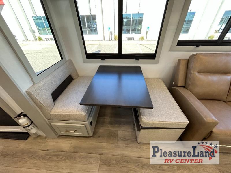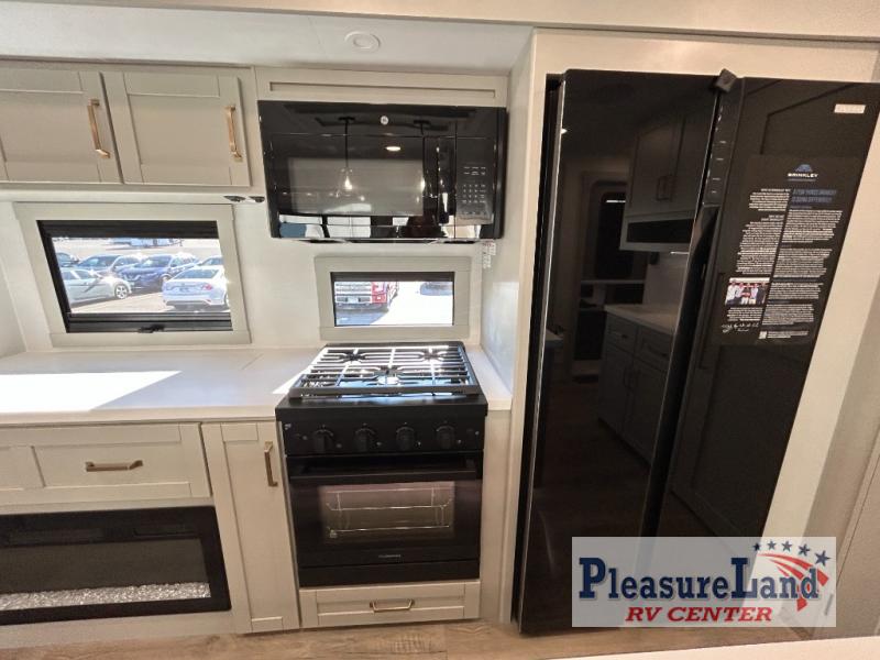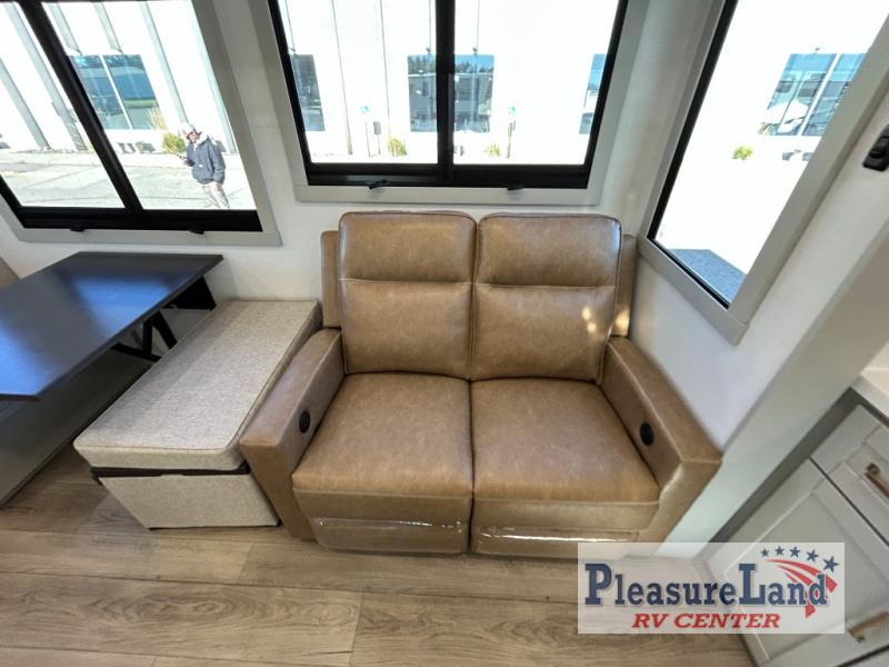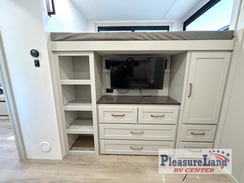 The whole gang will love camping in this spacious travel trailer for six to seven! Your guests or little ones will have the rear bunkhouse all to themselves, which includes a tri-fold sofa with a reclining back, a flip-up bunk, plus a second bunk bed across the room for even more sleeping space. There is even a bunkroom 42" Smart TV with a wardrobe for entertainment and storage! The front private bedroom includes a walk-around queen bed with four under-bed drawers for clothes, extra blankets and more. Head to the combined kitchen and living room to prep dinner on the kitchen island, relax on the theater seating, and dine at the sleeper dinette. There is also a pantry with adjustable shelves here, along with a hutch, 16 cu. ft. refrigerator that opens with the slide out, plus a televator and fireplace to make your space feel more like home! Outside, you'll find two power awnings, LED ground lighting, drop-frame pass-thru storage, and an outdoor kitchen with a refrigerator, sink, and storage!