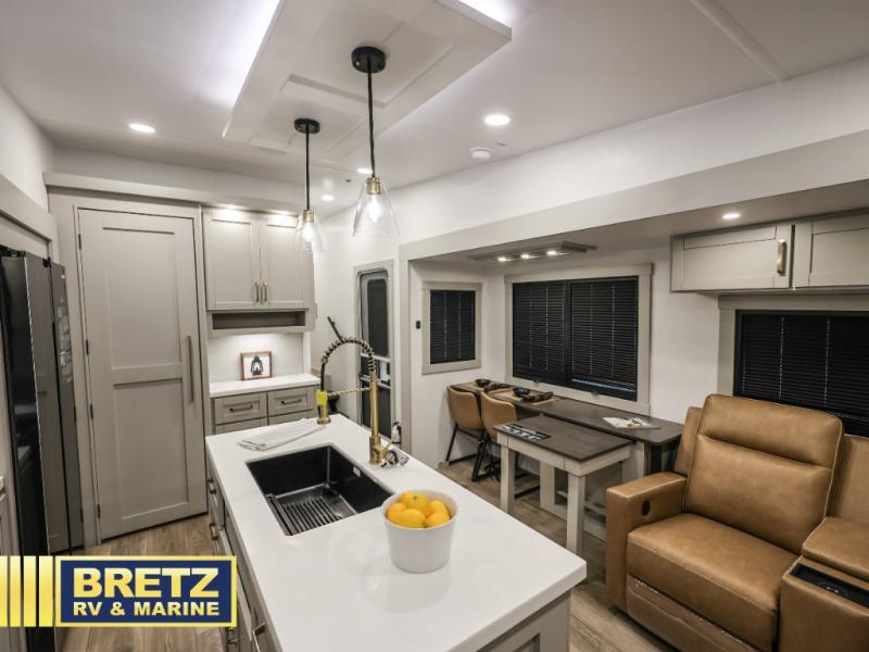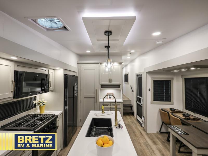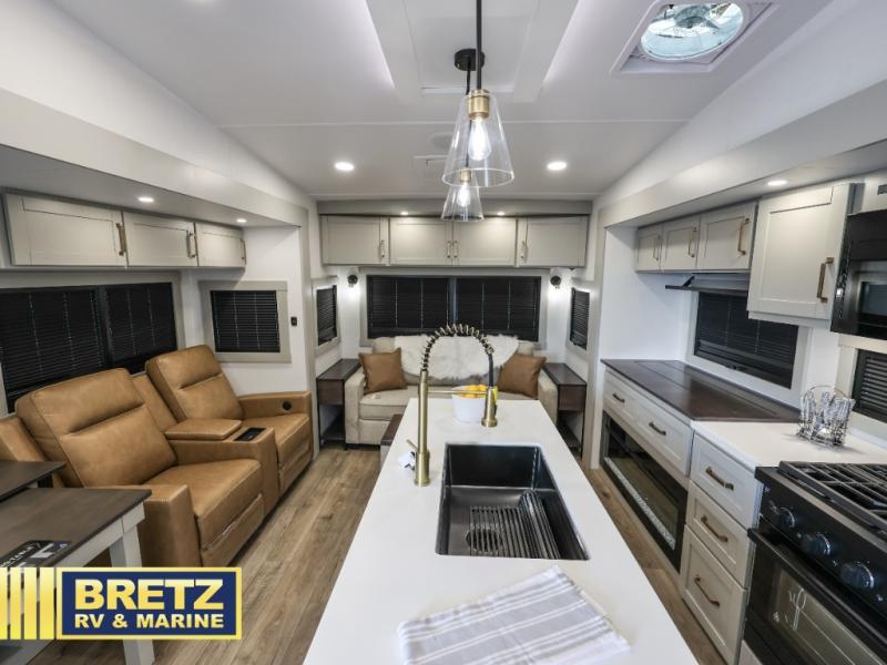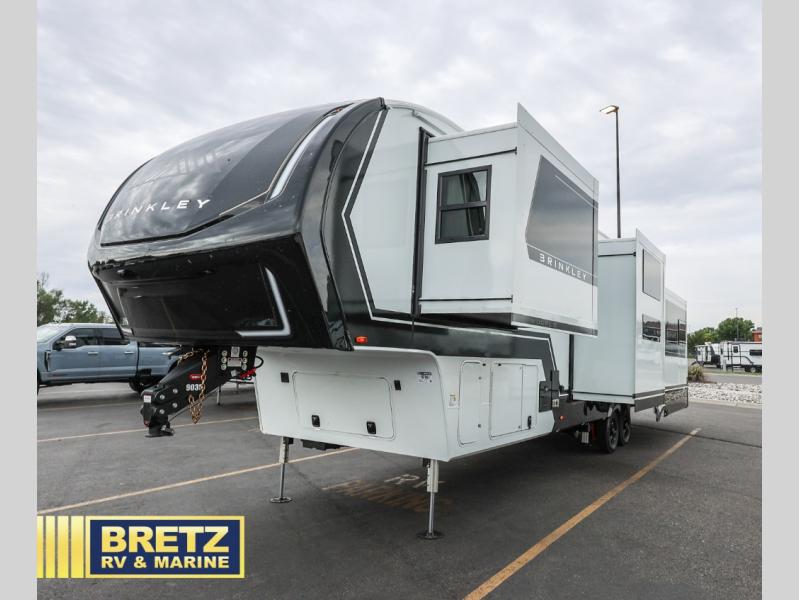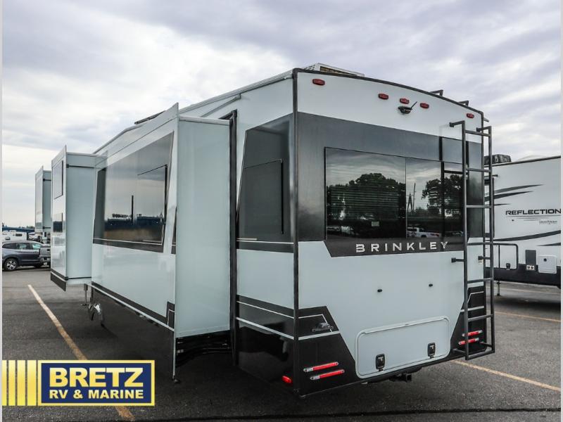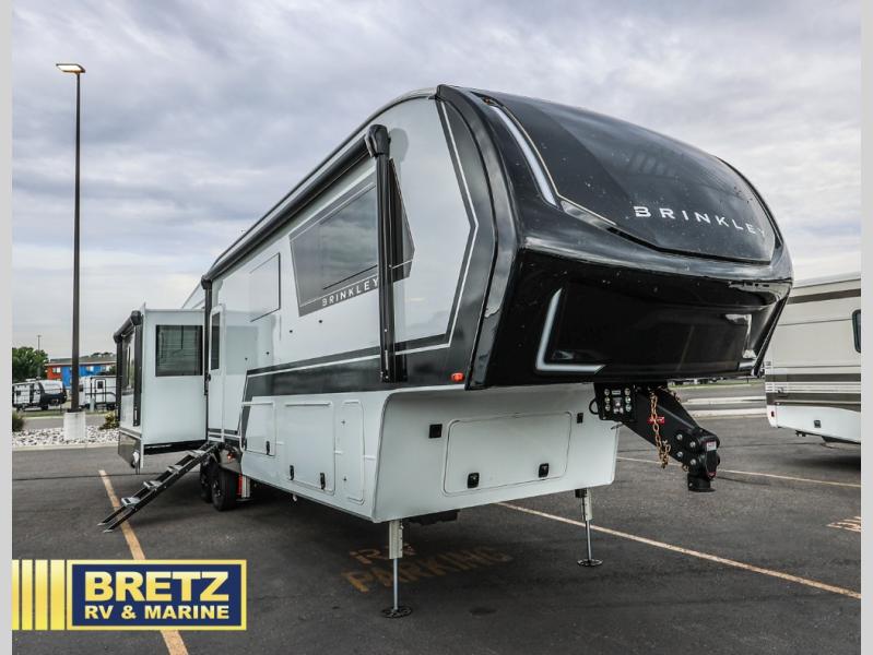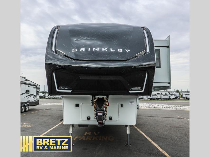 The Brinkley mid-profile Model Z fifth wheels bring you clean lines and an upscale look with plenty of style and exciting new features like the industry first brass plumbing connections. These units also feature an automotive grade front cap, plenty of exterior storage, dual exterior hot and cold showers, and wide stance leveling jacks for easy set up. Residential frameless windows provide a clean look and beautiful views, and ample electrical outlets and 6 USB/USB-C outlets allow all of your electronics and appliances to easily be used and charged.