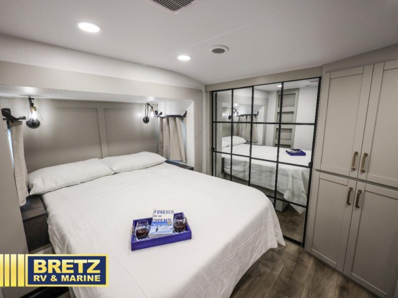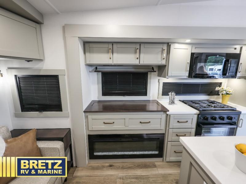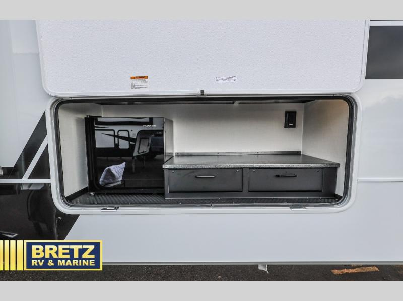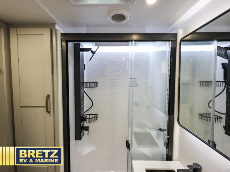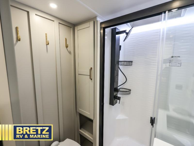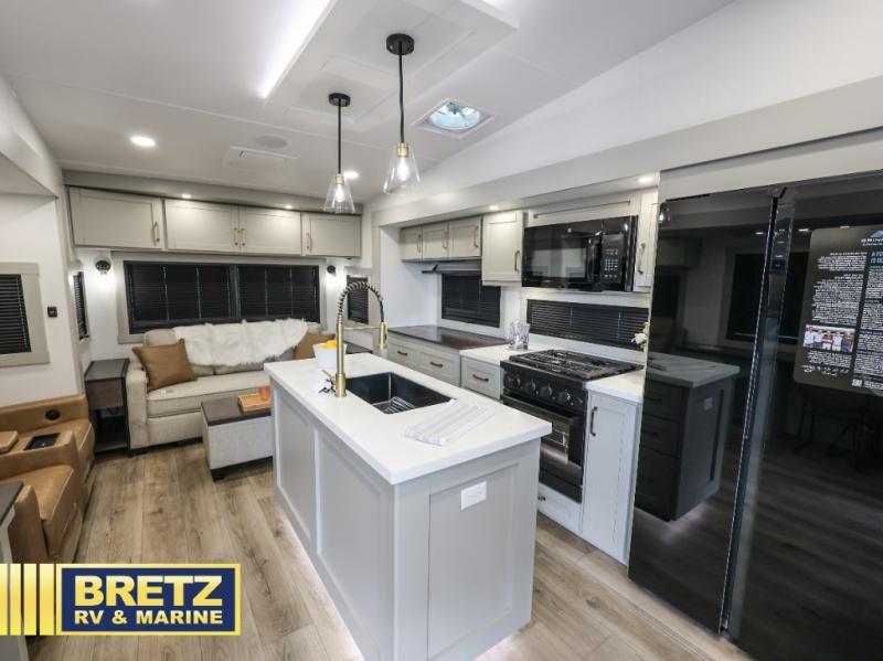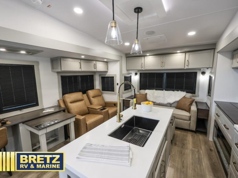 The Brinkley mid-profile Model Z fifth wheels bring you clean lines and an upscale look with plenty of style and exciting new features like the industry first brass plumbing connections. These units also feature an automotive grade front cap, plenty of exterior storage, dual exterior hot and cold showers, and wide stance leveling jacks for easy set up. Residential frameless windows provide a clean look and beautiful views, and ample electrical outlets and 6 USB/USB-C outlets allow all of your electronics and appliances to easily be used and charged.