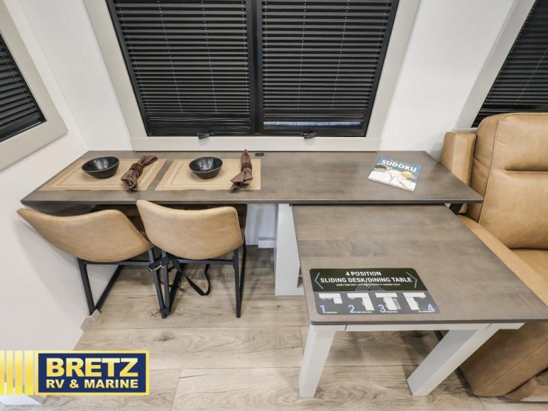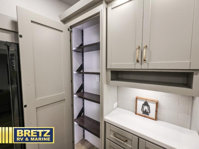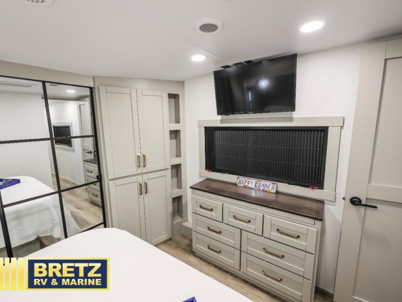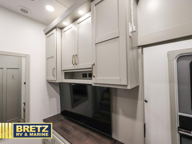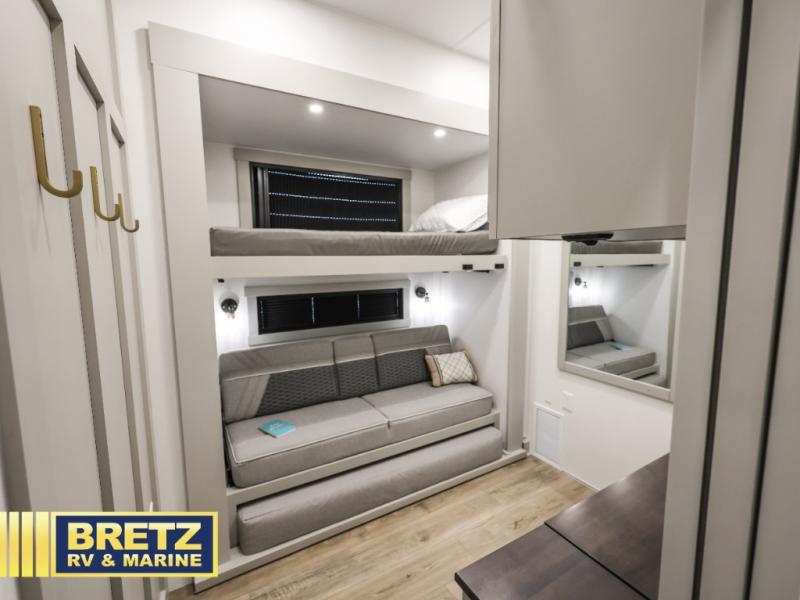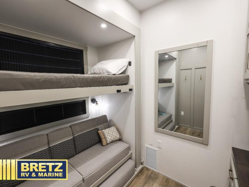 This unit is perfect for your family that needs sleeping space for eight! There is ample seating with a sliding desk/dining table, 62" theater seating, and a 72" tri-fold sofa along the rear wall. You can easily relax and enjoy the telescoping TV with a cozy fireplace below. The kitchen offers all that you need to prepare and cook meals just like home with a 16 cu. ft. refrigerator for your perishables, a 30" residential microwave oven, and three burner range top and oven. You will love the kitchen island all outfitted with pull-out pet bowls and double pull out trash bins with an integrated Stow & Go paper towel holder. There is also an 84" pantry with adjustable shelves for all of your canned and dry goods. Mid-coach, just ahead through the main entry, is a bonus room that can be used as a bedroom featuring a sofa bed with flip-up overhead bunk and trundle below, or an office with pull-out desk so that you can work easily while you travel, or it could also be used as a gaming room since there is also a 50" Smart TV. Head up the steps to a bathroom on your left and a private master suite with king bed slide all the way up front. A sliding dresser top features hidden storage which is perfect for jewelry and other personal belongings. The front wardrobe features mirrored doors and the corner closet has been prepped for a stackable washer and dryer if you choose to add that option.