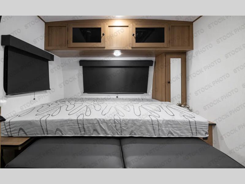 As you step into this versatile travel trailer, you'll be greeted by a front Murphy bed that offers the best of both worlds, a comfortable place to sleep at night and a cozy sofa for daytime lounging. Convenient storage is provided with a wardrobe at the foot of the bed and a nightstand on the other side for your essentials. In the center, the kitchen is fully equipped with a 10-cu. ft. refrigerator, a 2-burner cooktop, and an air fryer microwave, giving you all the tools you need to prepare your favorite meals. Across from the kitchen, a counter with chairs offers a welcoming space to dine, work, or gather. Toward the rear, double bed bunks provide additional sleeping space, with the lower bunk flipping up to reveal extra storage for your gear. Rounding out the layout is a full bathroom in the rear corner, featuring a tub/shower combo so you can enjoy the comfort and convenience of bathing right inside your trailer.