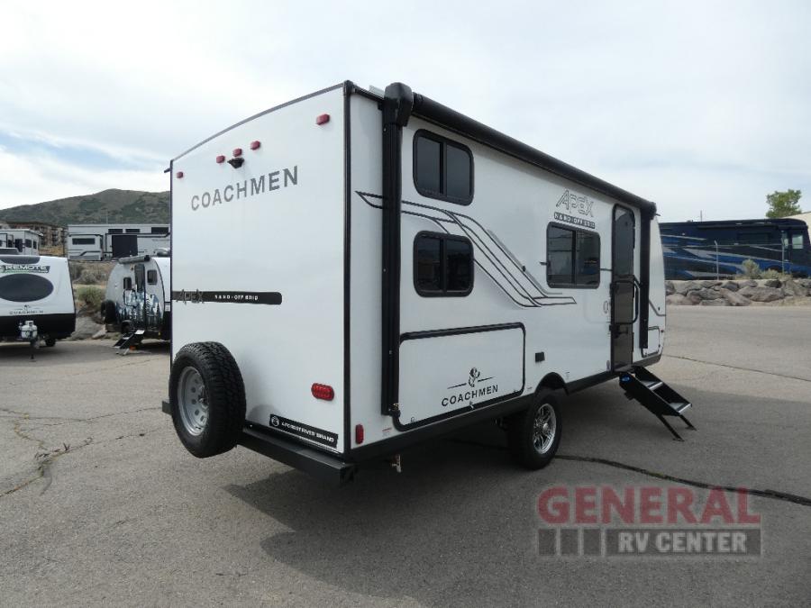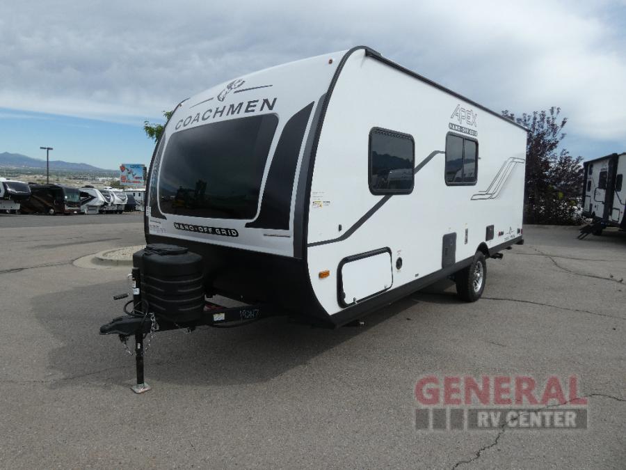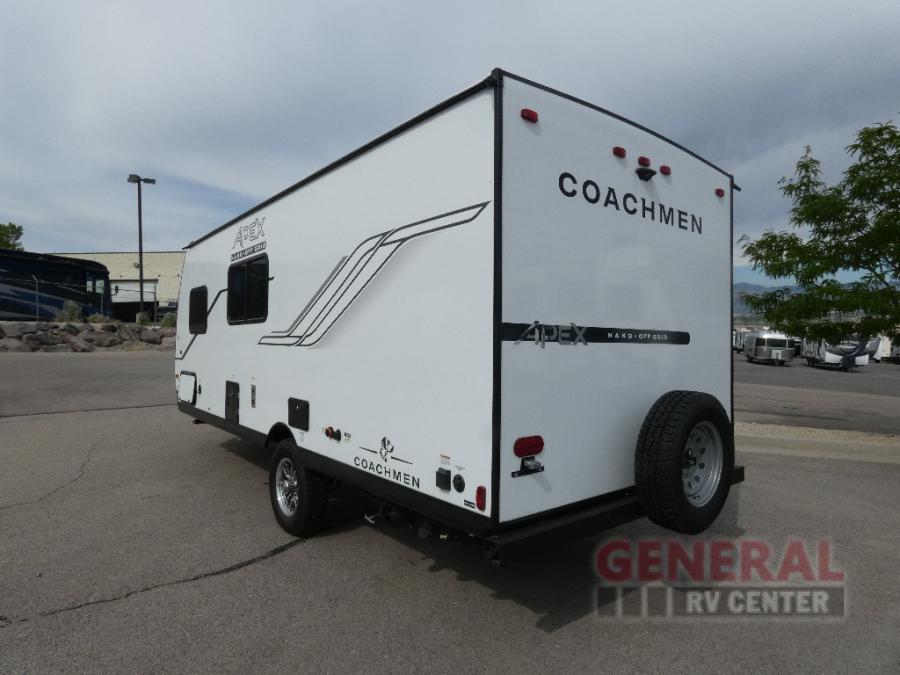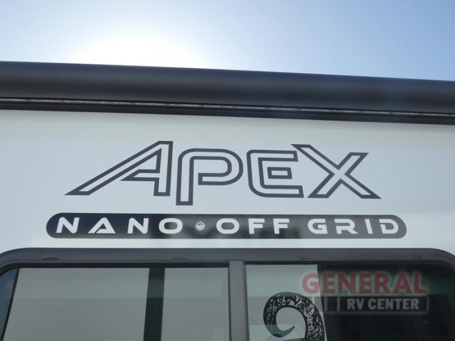 You will find comfort, convenience, and a sturdy construction with each of these Coachmen RV Apex Nano travel trailers! They are held together with an aluma-cage construction, an I-beam chassis, plus vacuum-bonded laminated dual Azdel fiberglass walls for double the protection against the elements. The 200-watt solar panel with a 30 amp control charger is included within the Off-Grid Package, along with two 20 lb. LP tanks, a high velocity power roof vent, plus 12V outlets to keep you powered up. More exterior feature include a hot/cold shower, four stabilizer jacks, a power awning with LED lighting, and magnetic baggage door catches to easily pack and unload your gear. You will love the interior of your Apex Nano with Congoleum residential flooring, one-piece seamless edge countertops, matte black hardware in the galley, and a hand-crafted wood medicine cabinet in the bath.